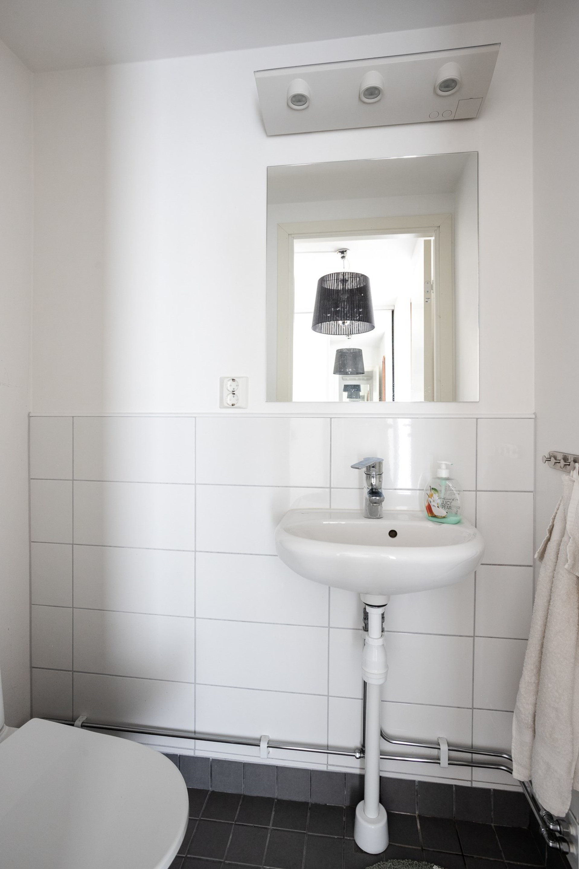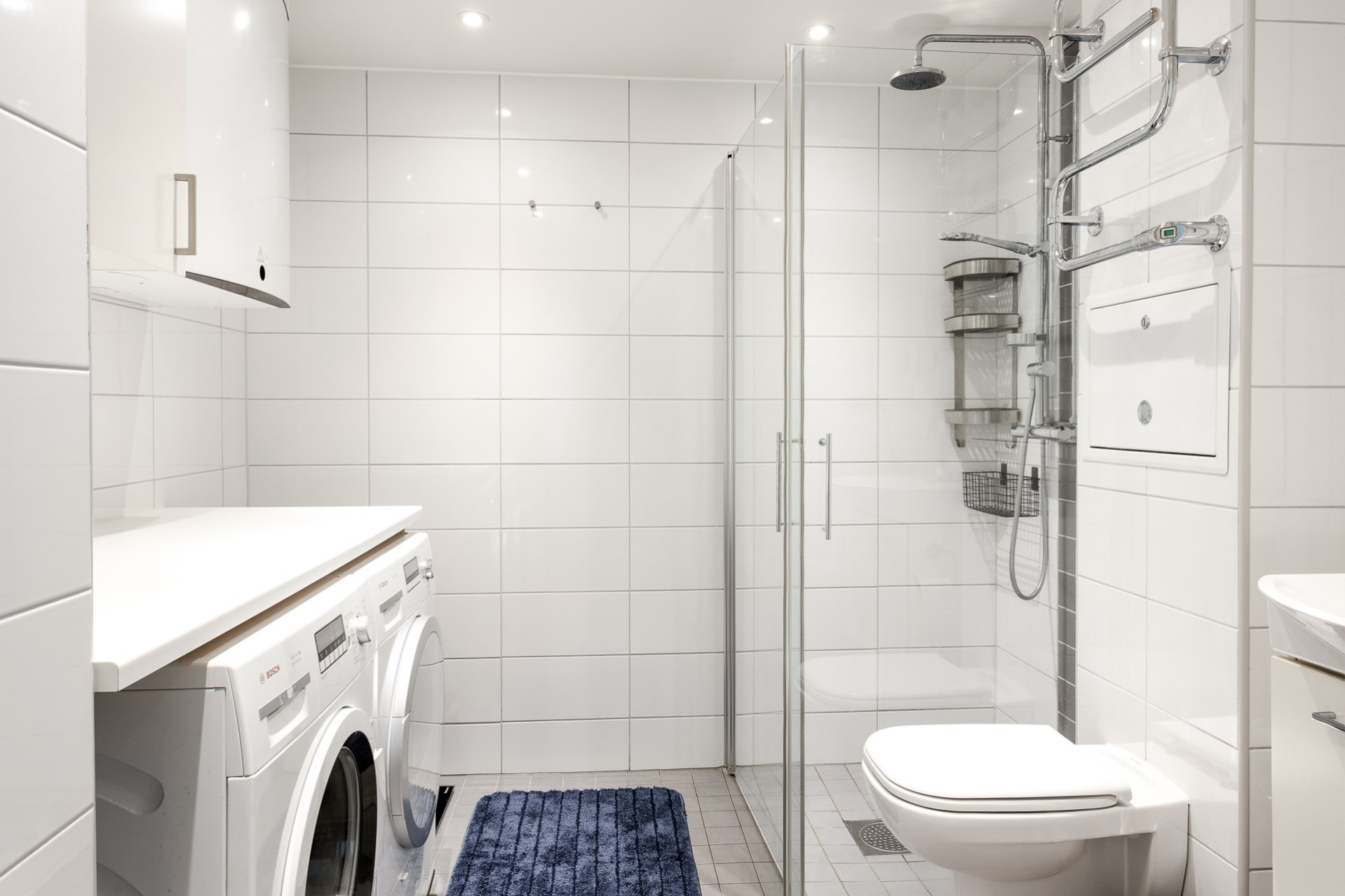 Just denna 3:a erbjuder förutom badrum även gäst W/C. Klinker på golv, toalett och vask.