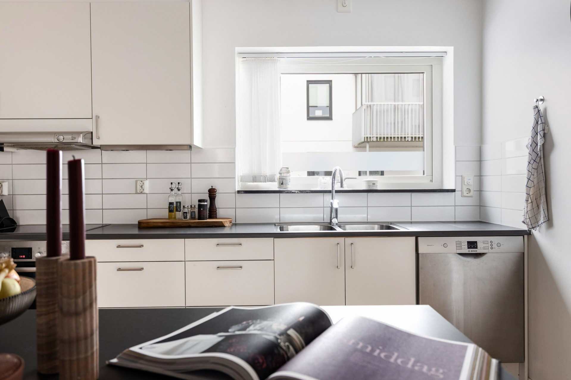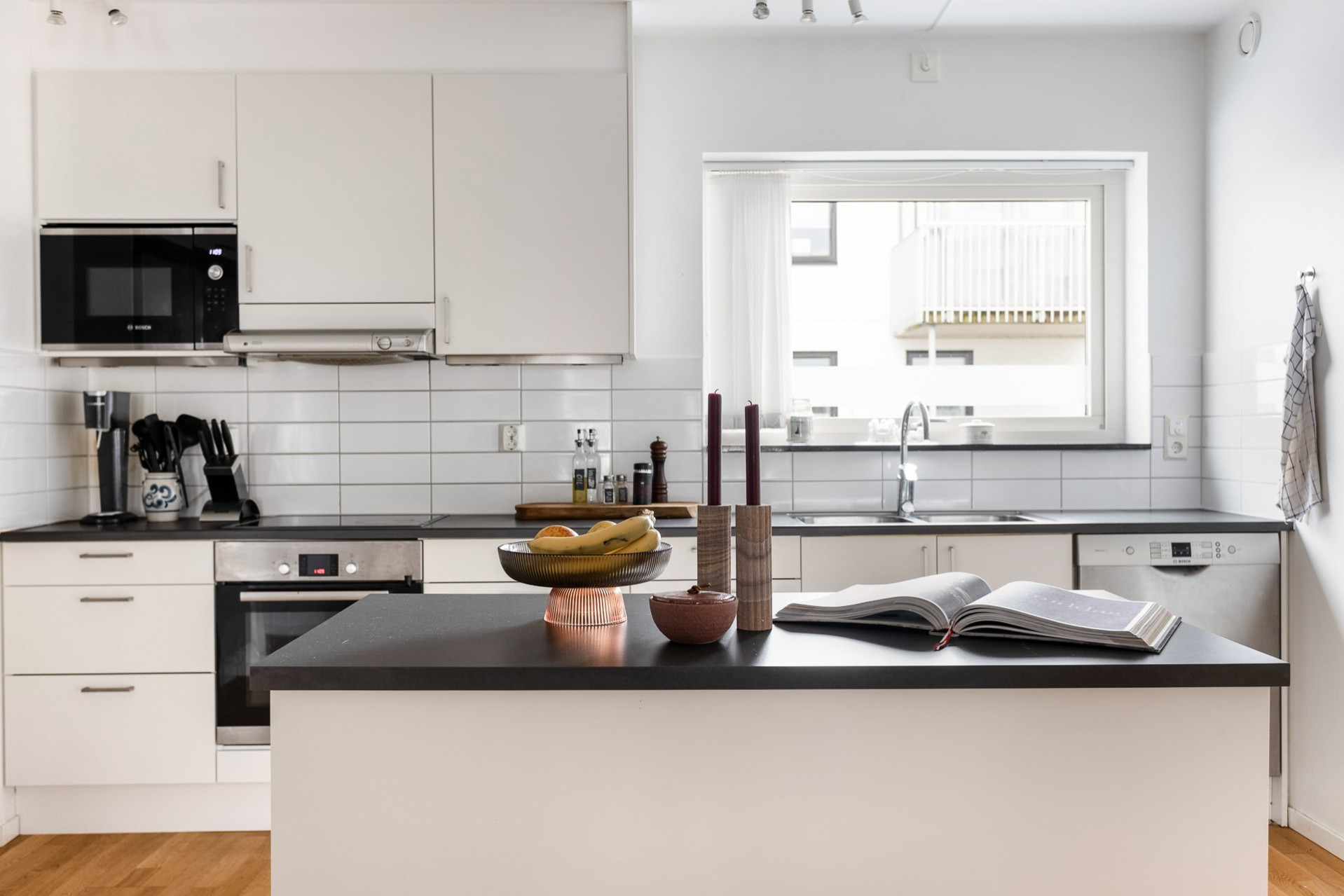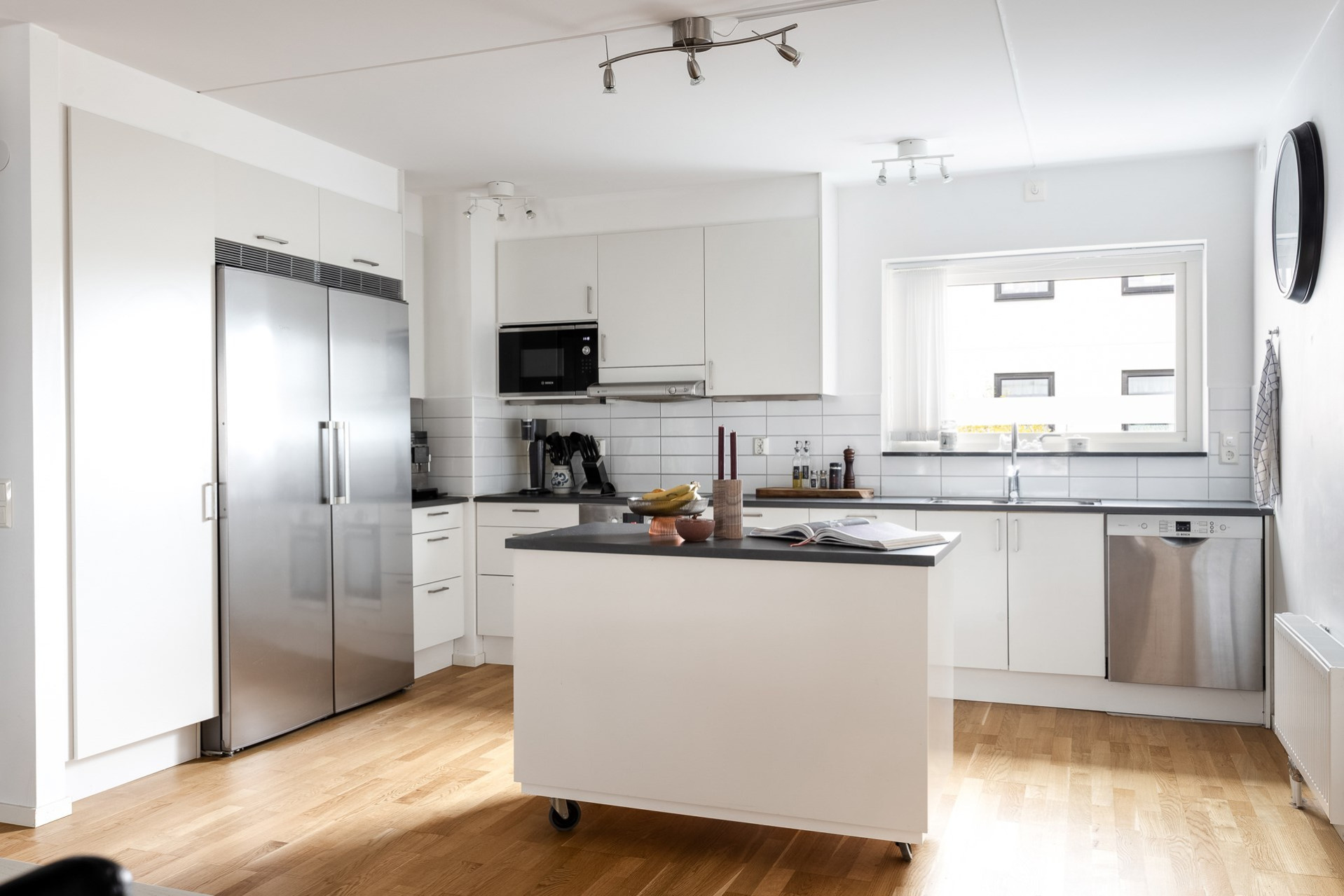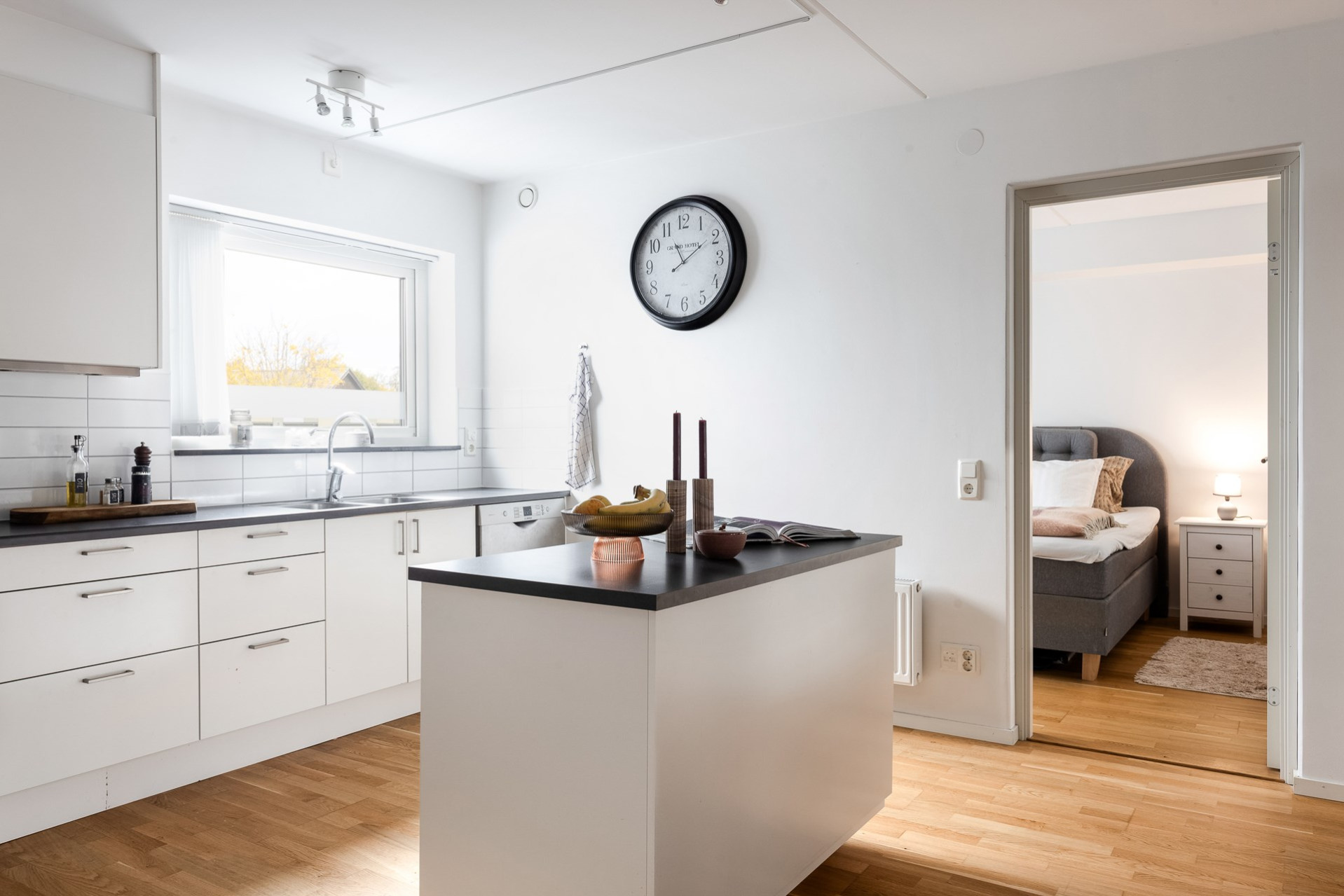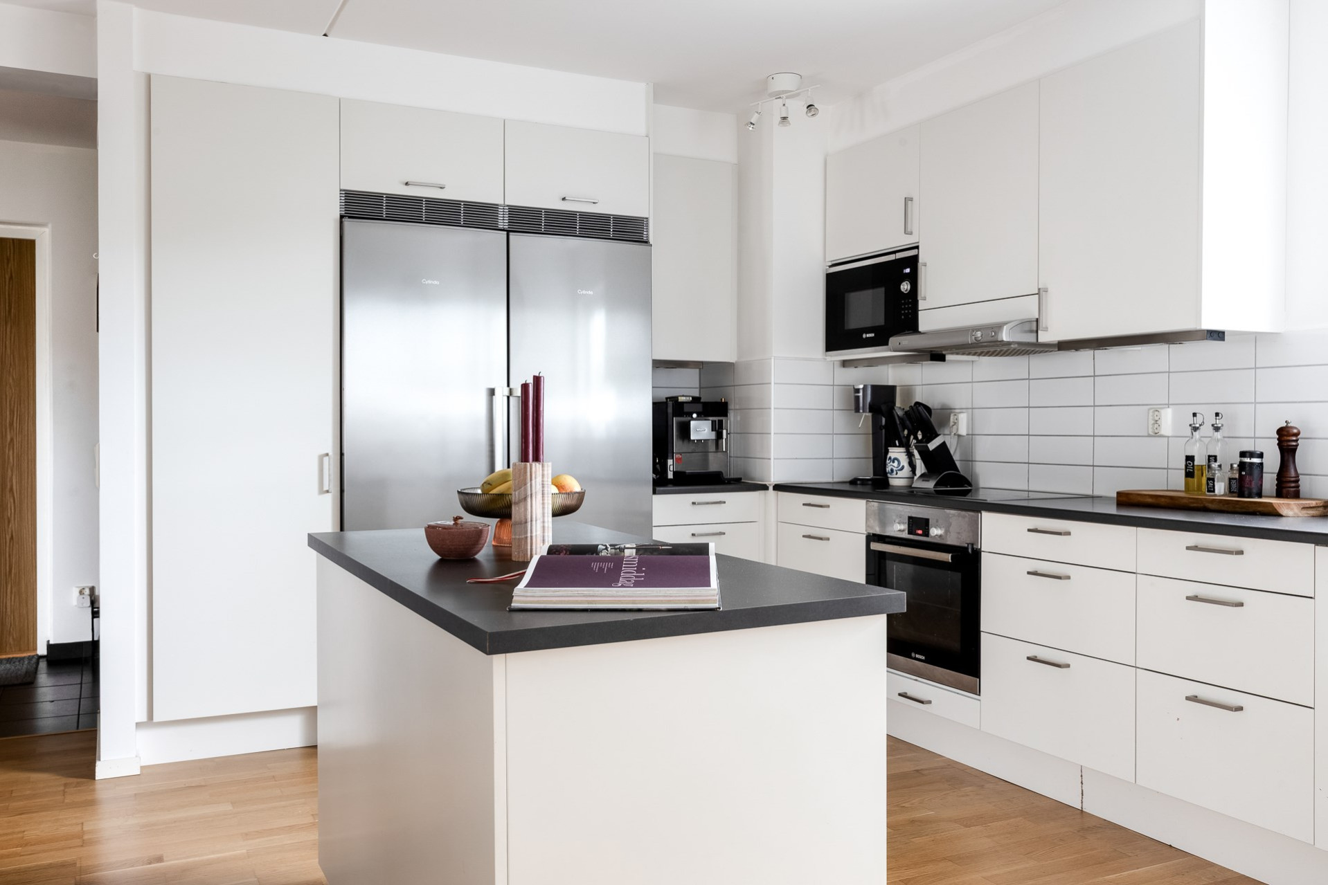 Trevligt planerat kök med öppen planlösning mot vardagsrum. Parkettgolv och målad väggar. Kyl, frys, mikro, inbyggnadsugn och diskmaskin samt bra förvaring genom inredningen som går i vitt och gott om arbetsytor genom köksbänkar.