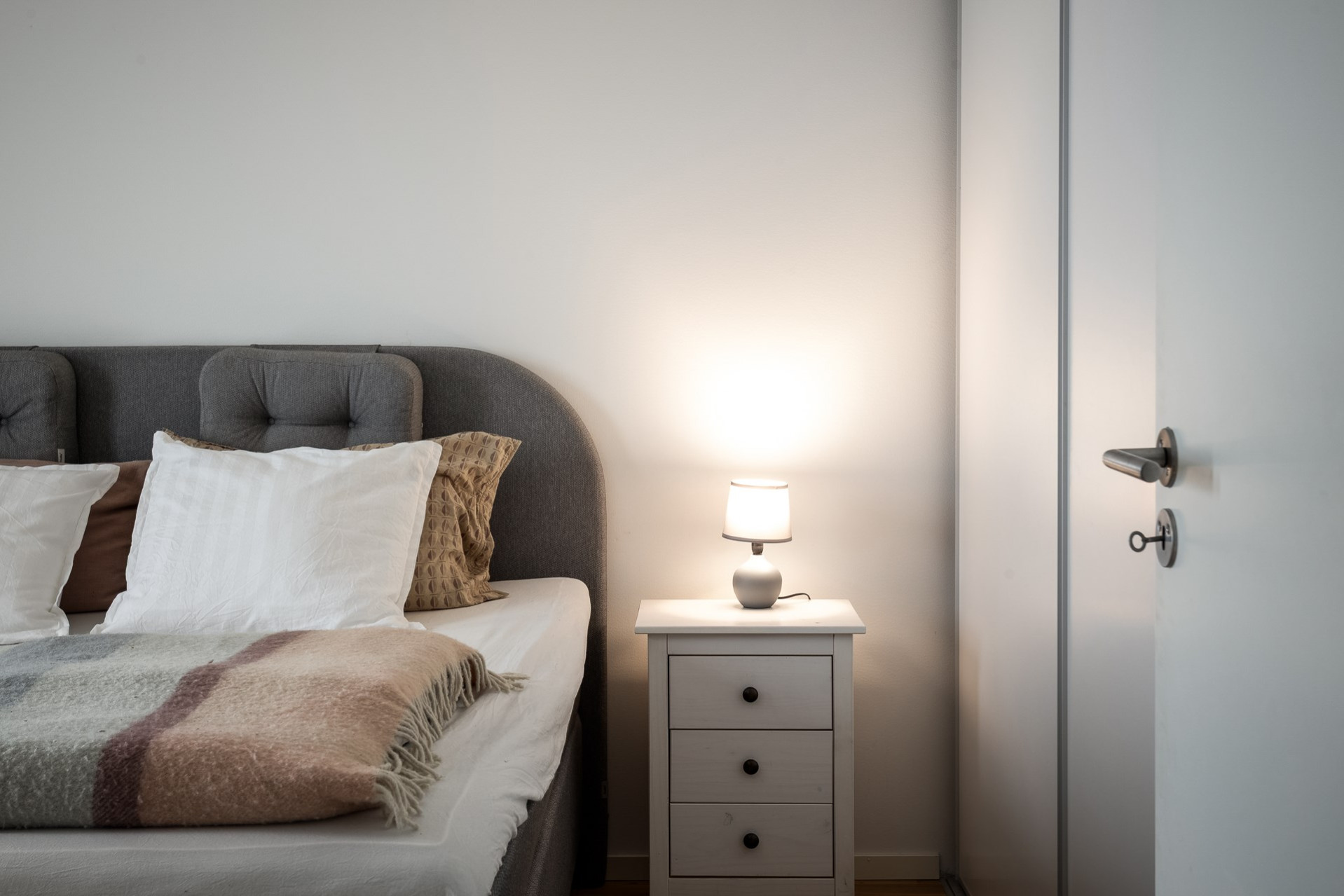 Mindre av sovrummen. Parkett på golv och släta målade väggar. Förvaring genom garderob.