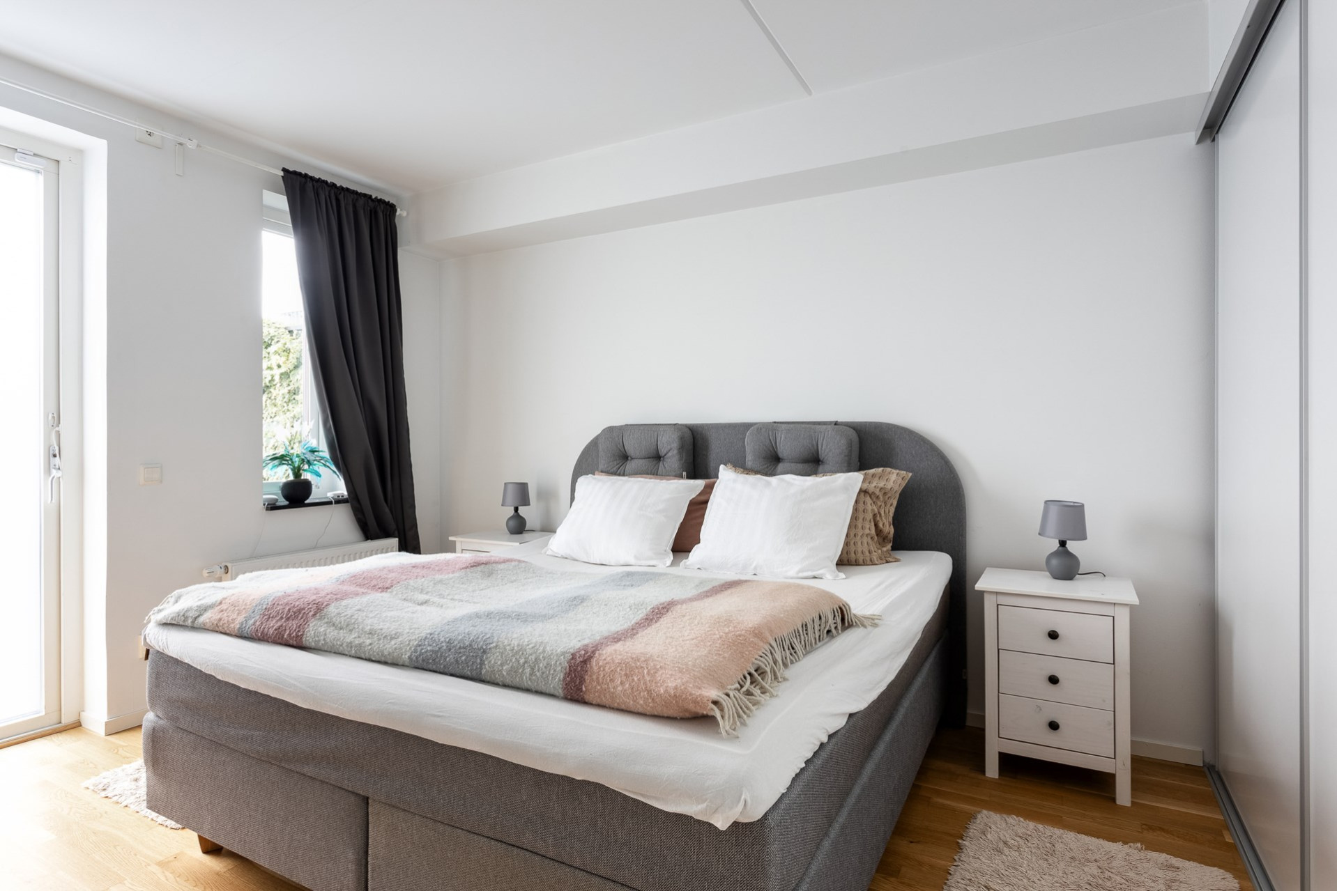 Större av sovrummen som dessutom erbjuder bra förvaring genom skjutdörrsgarderober. Plats för dubbelsäng och samma genomgående parkettgolv samt släta målade väggar. Härifrån nås även uteplatsen på innergården.