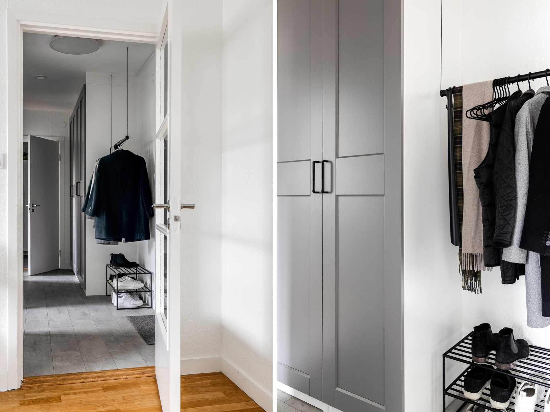 Rymlig hall med plats för avhängning. Garderober längst ena sidan som erbjuder goda förvaringsmöjligheter (-22). Från hallen nås bostadens samtliga rum. På golvet ligger ett ljusgrått laminatgolv och väggarna är vitmålade (-22).