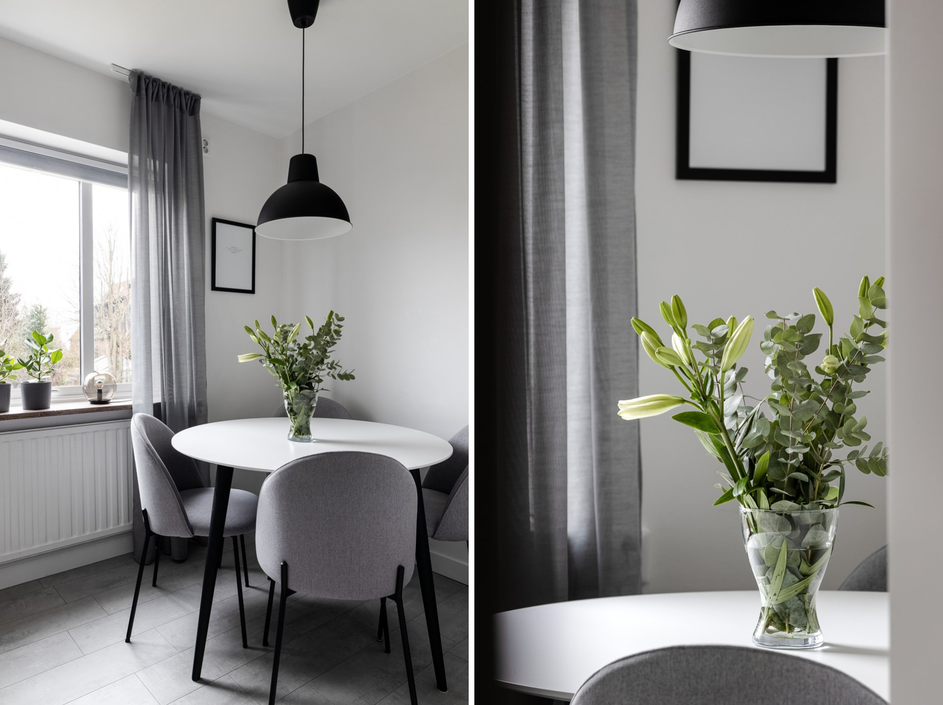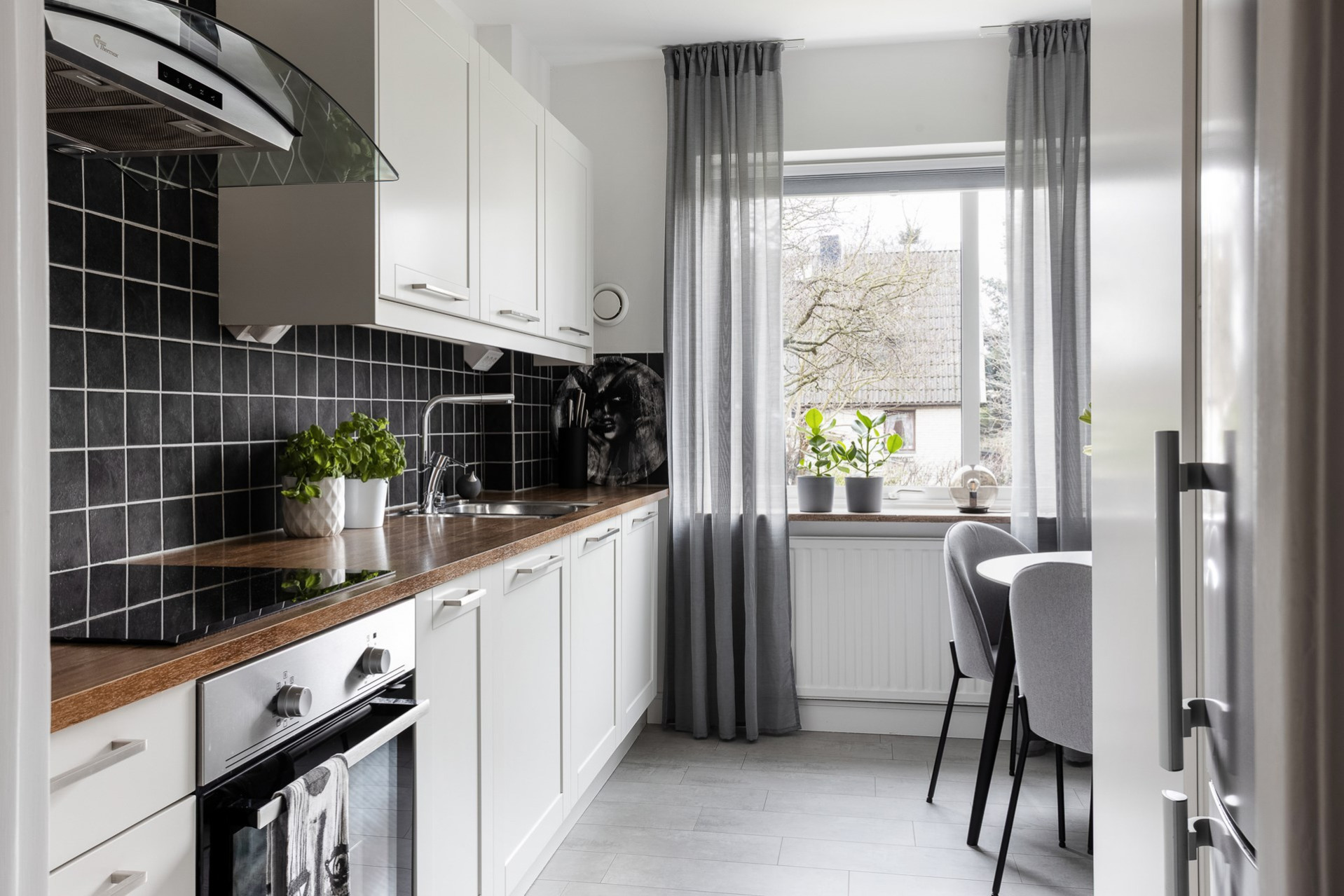 Modernt och stilrent kök utrustat med kombinerad kyl & frys, bänkdiskmaskin, spishäll, spisfläkt och integrerad ugn. Köket erbjuder gott om förvaring i de vita skåpen och lådorna. Bänkskiva i träliknande laminat och svart/gråa kakelplattor som stänkskydd. Matplats för 4 personer. Väggarna är släta och vitmålade (-22). På golvet ligger ett ljusgrått laminat.