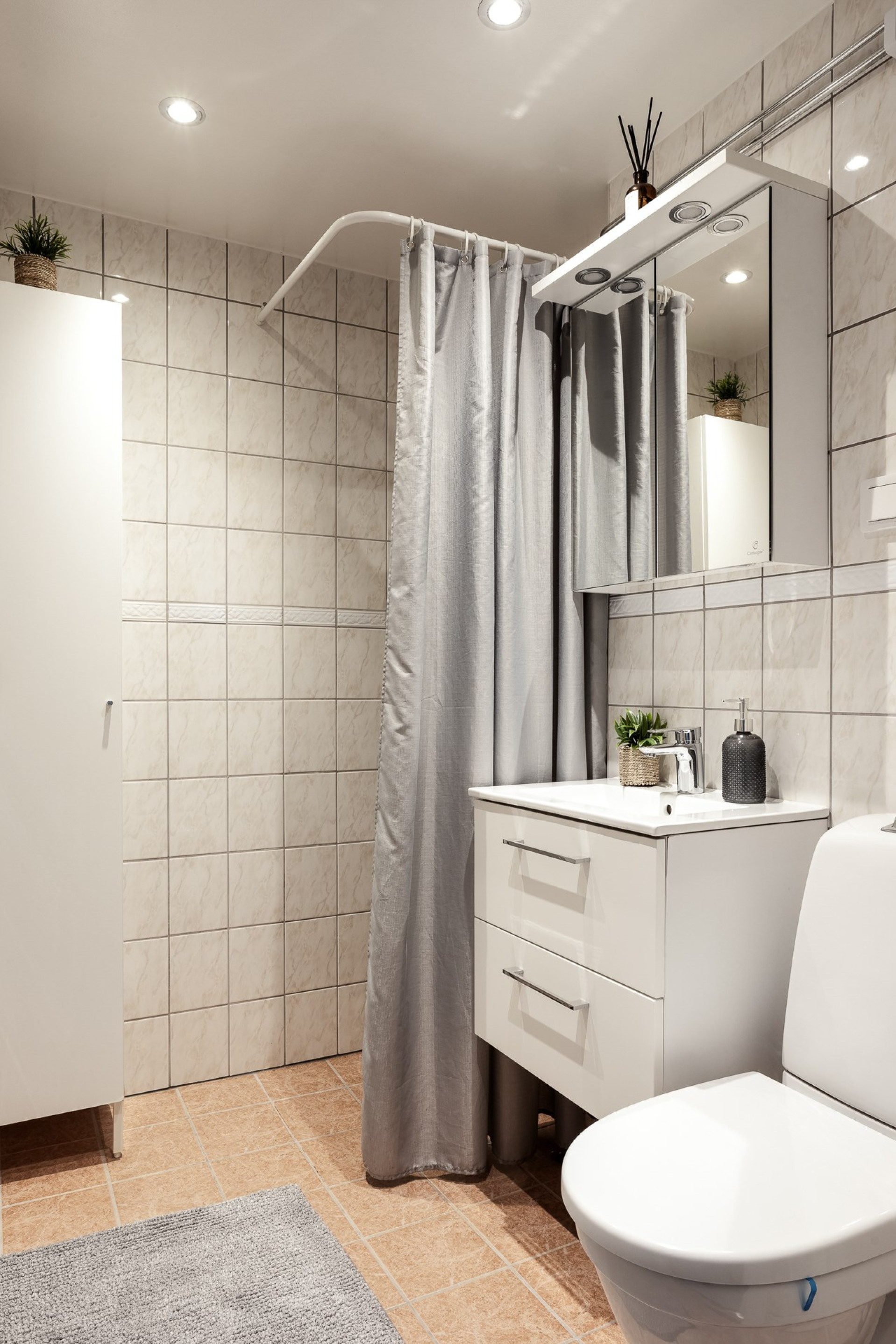 Helkaklat badrum som renoverades i samband med stambytet 1999. Badrummet är utrustat med dusch, wc, spegelskåp med belysning, vask med kommod undertill (-22) och ett högsskåp (-22) som erbjuder plats för hygienartiklar, samt en uppvärmd handdukstork. Spotlights i taket. På golvet ligger ett brunt/terrakotta färgat klinker och väggarna är klädda i ett ljust melerat kakel.
