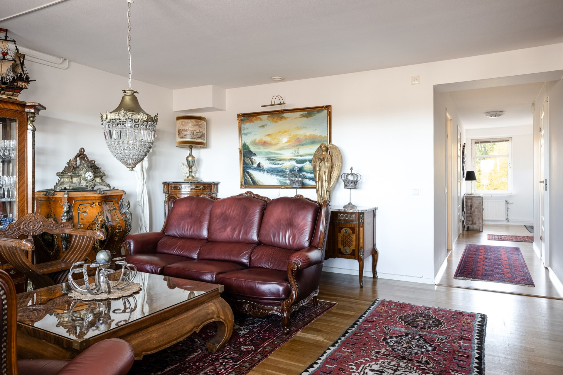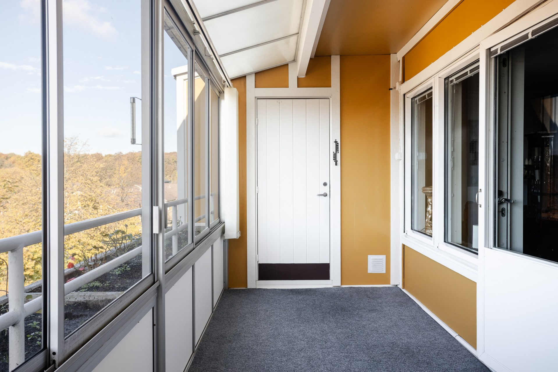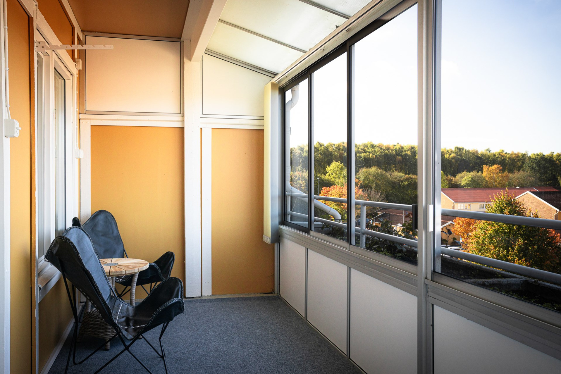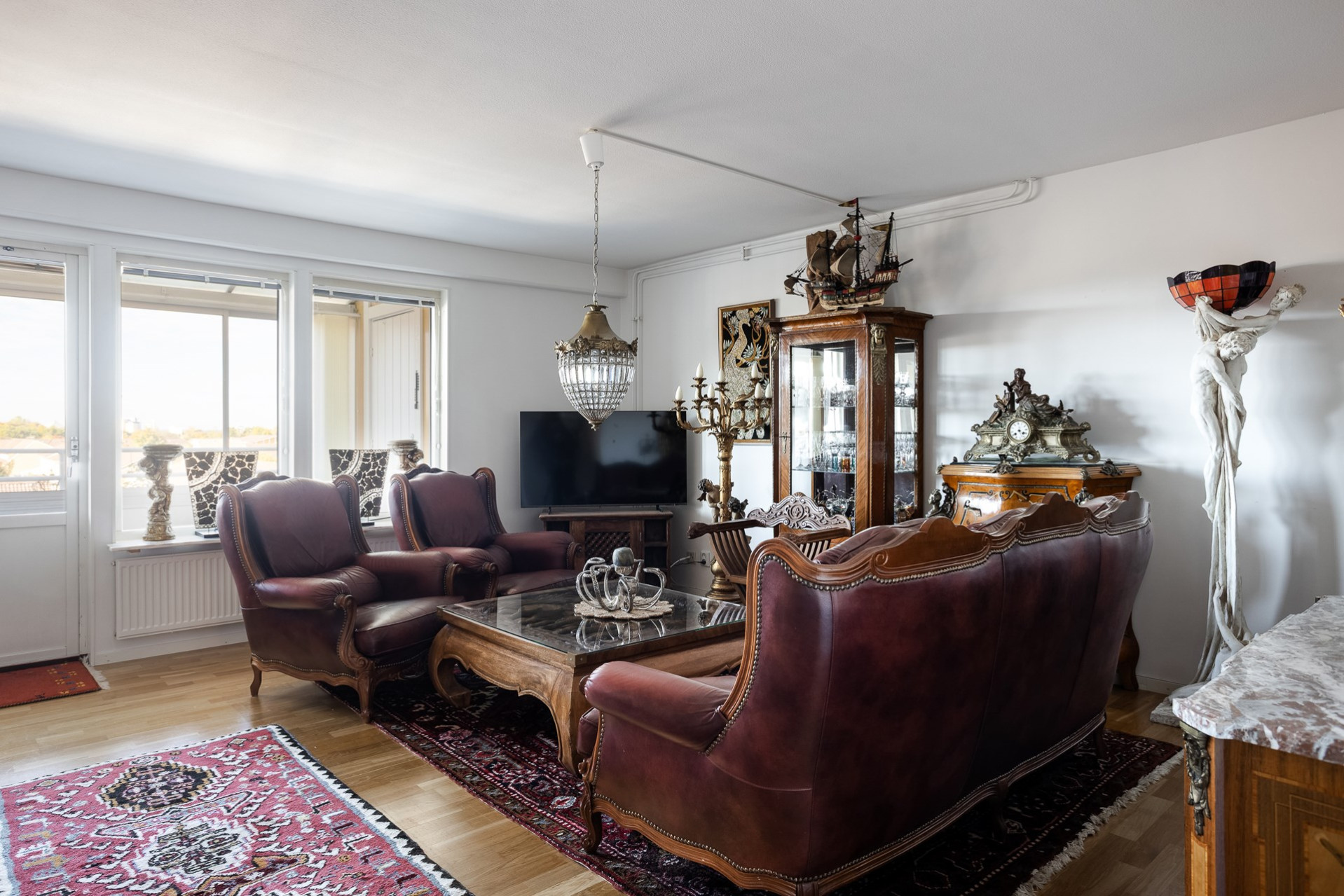 Vardagsrummet ligger i vinkel med matplatsen och är delvis skyddat från köket. Här får ni plats med en generös soffgrupp och annat önskat möblemang. De stora fönsterpartierna ger ett fint ljusinsläpp. Från vardagsrummet når ni även den stora, inglasade balkongen som bjuder på en härlig utsikt över trädtopparna. Ute på balkongen finns även ett förråd.