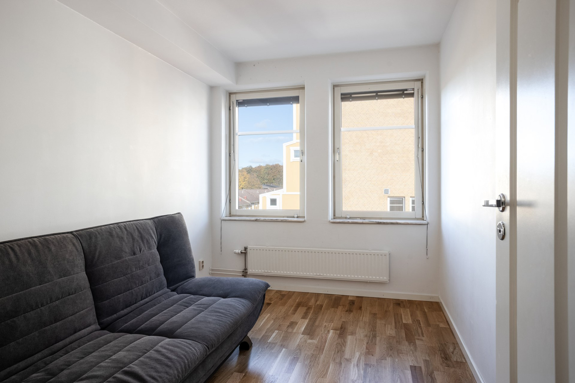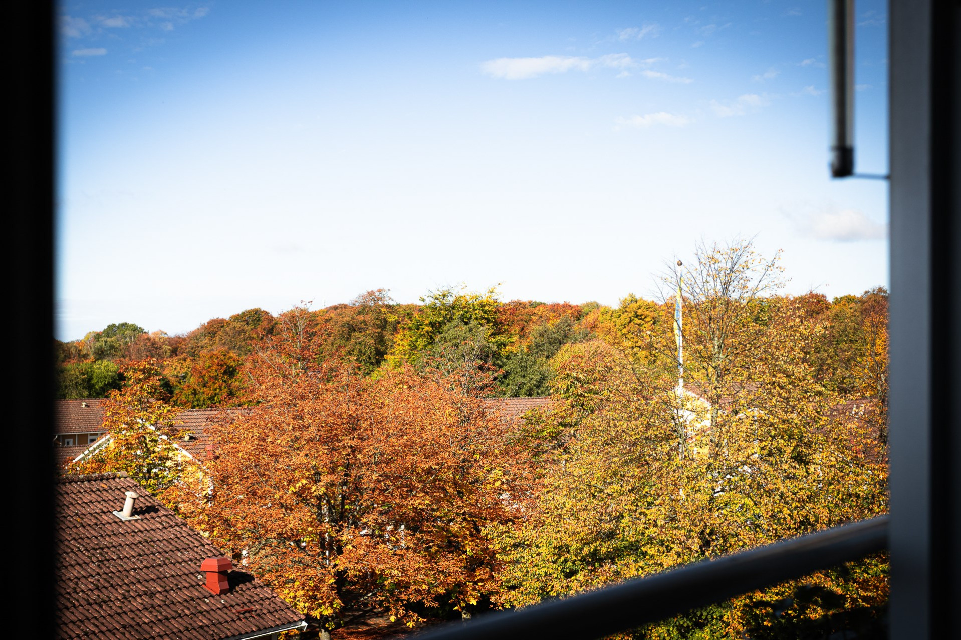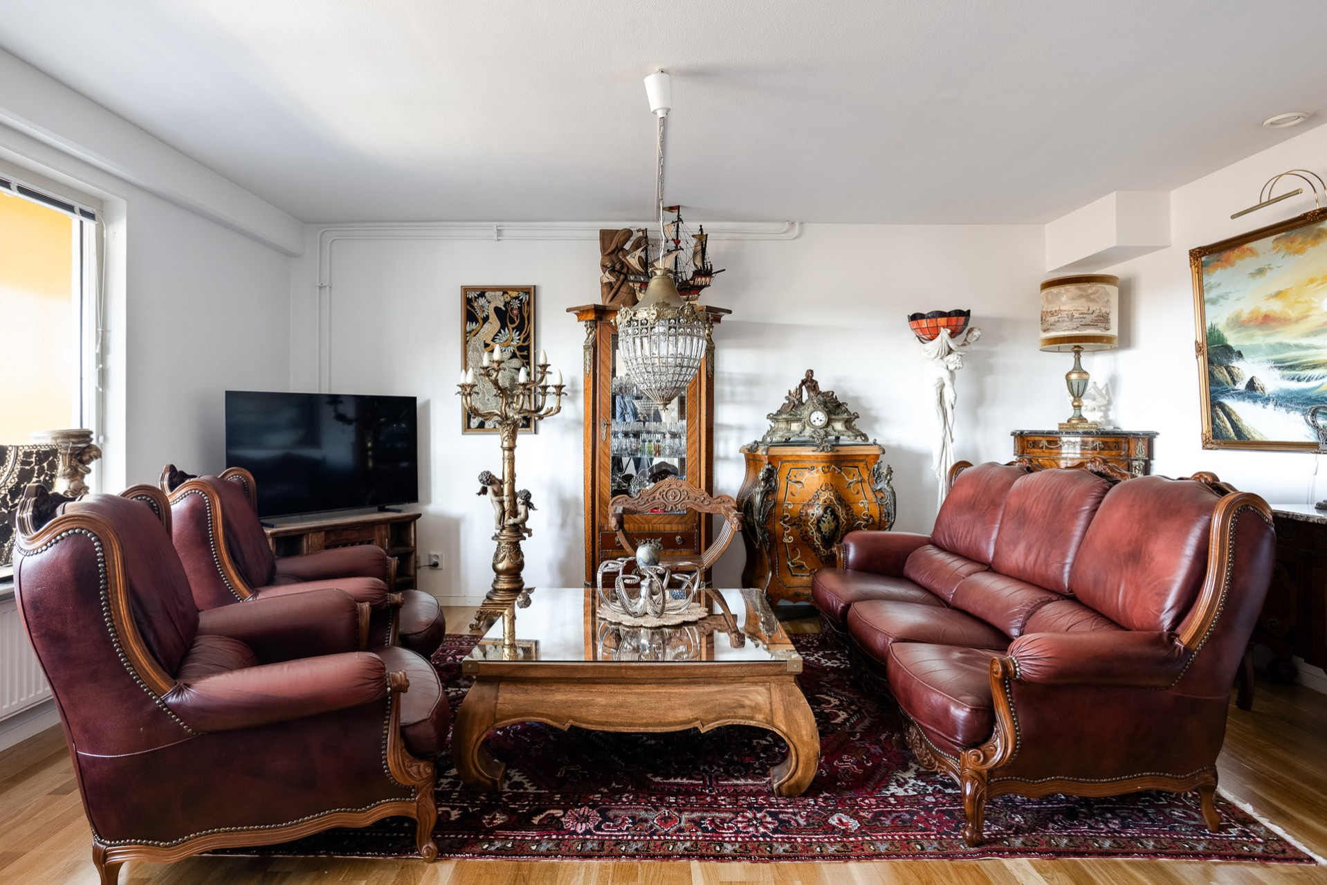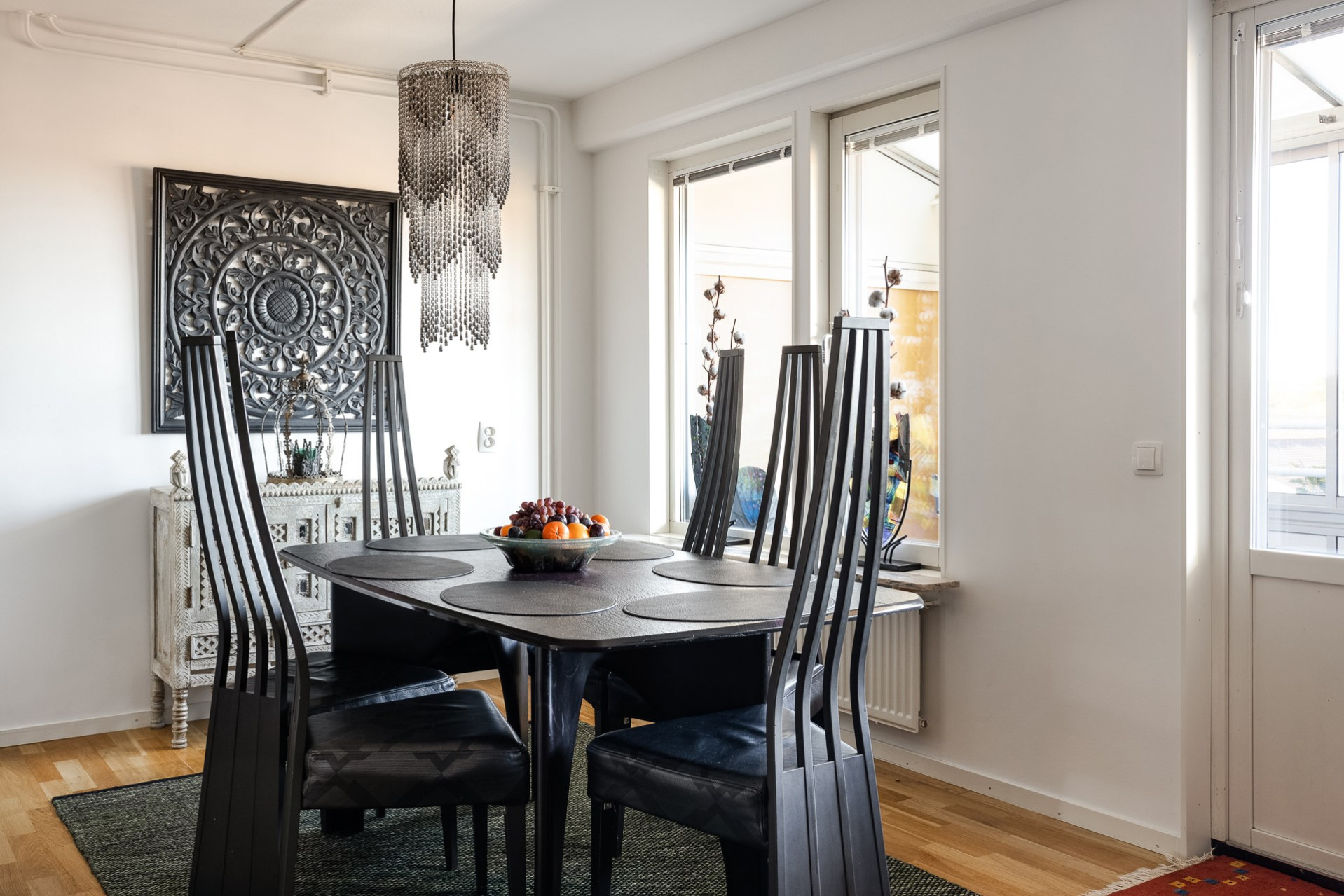 Vardagsrummet ligger i vinkel med matplatsen och är delvis skyddat från köket. Här får ni plats med en generös soffgrupp och annat önskat möblemang. De stora fönsterpartierna ger ett fint ljusinsläpp. Från vardagsrummet når ni även den stora, inglasade balkongen som bjuder på en härlig utsikt över trädtopparna. Ute på balkongen finns även ett förråd.