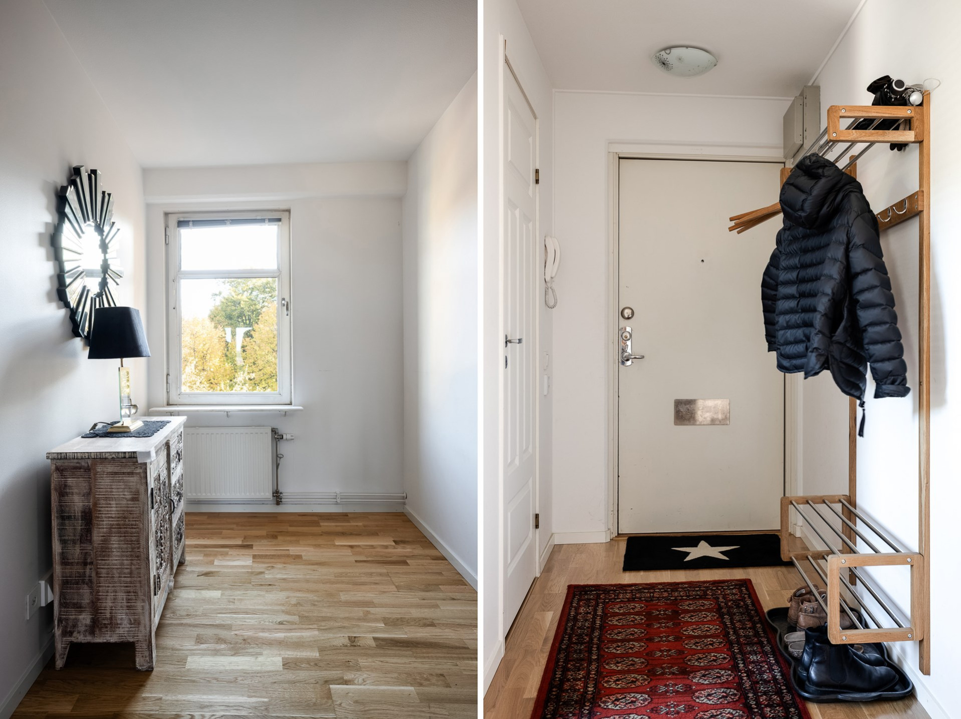 När ni har tagit hissen upp till våning 3 och öppnar dörren så välkomnas ni av en rymlig hall med plats för avhängning. Precis till höger har ni tillgång till en generös garderob där ni får plats med kläder och skor. I hallen finns även ett mindre utrymme som är perfekt att forma som en kontorshörna om så önskas. Från hallen nås samtliga rum i bostaden.