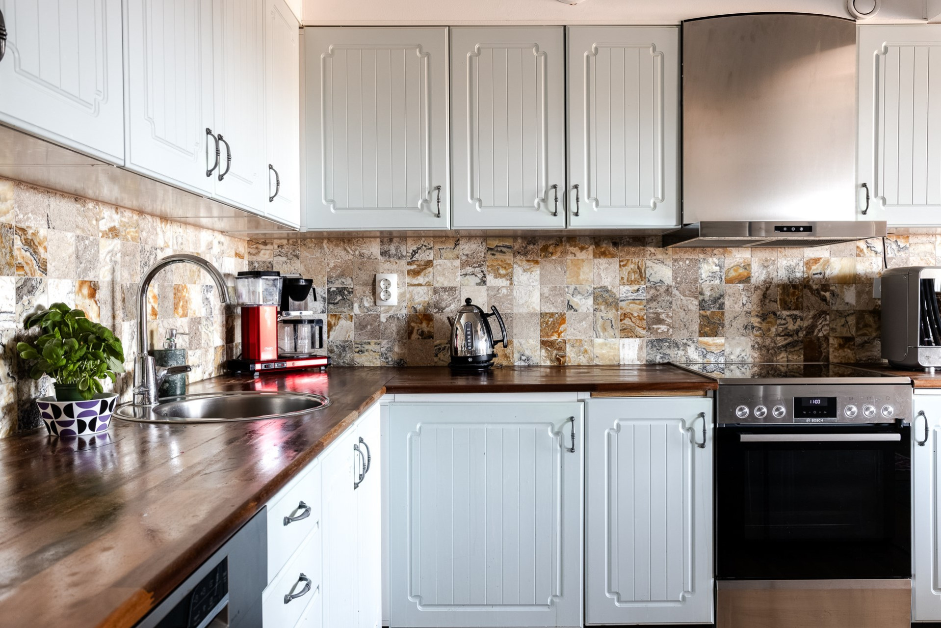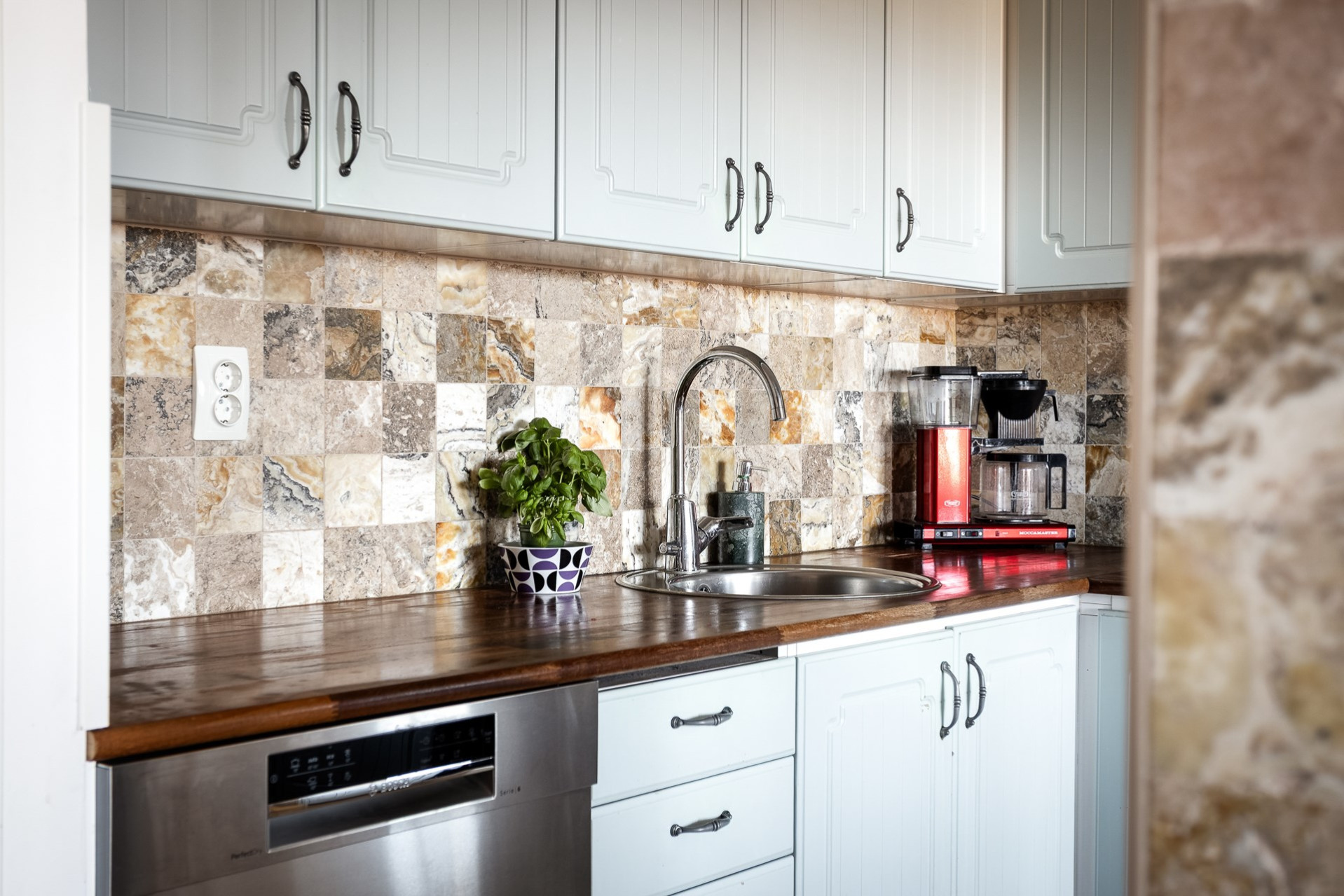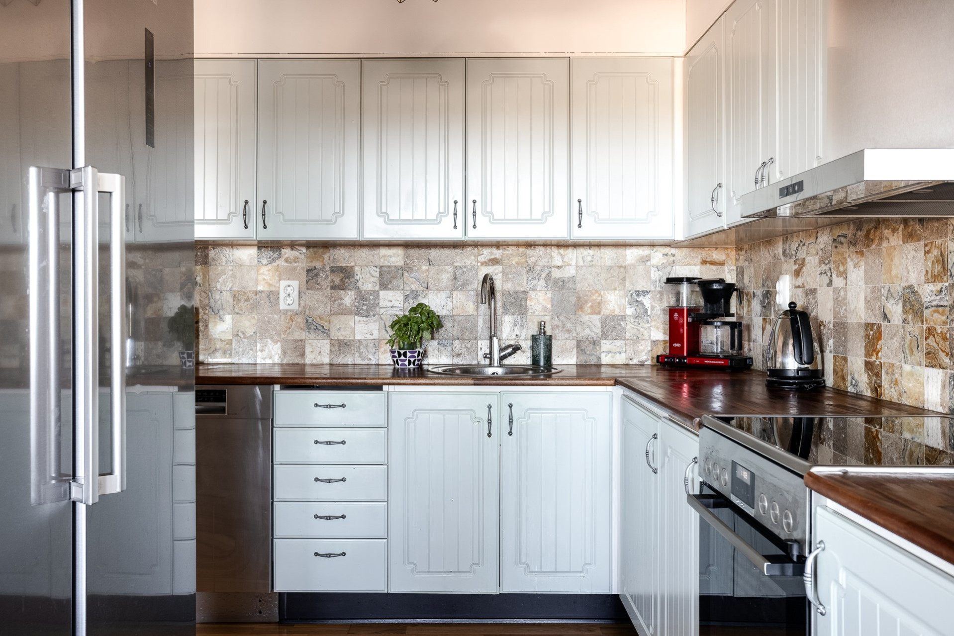 Ett fräscht kök som erbjuder god arbetsyta och förvaringsmöjligheter i de ljusgröna skåpen och lådorna. Köket har 2017 uppdaterats med nytt ekparkett, bänkskiva i trä, marmorplattor som stänkskydd, nya vitvaror såsom kyl & frys (Samsung), spisugn (Bosch), spisfläkt och diskmaskin (Bosch). Intill ligger matplats för upp till 8 personer och med stora fönster mot balkongen.
