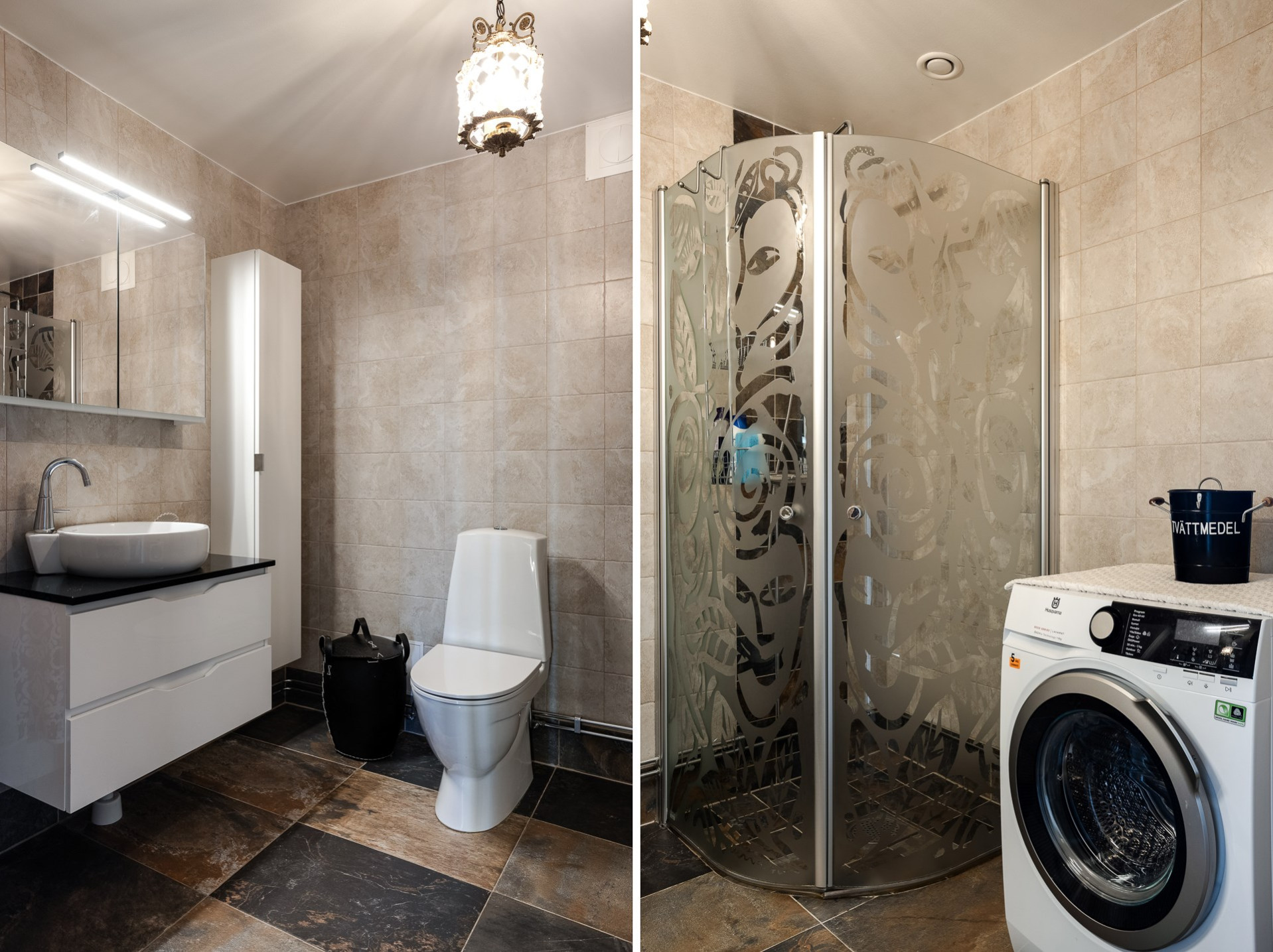 Helkaklat badrum renoverat 2017 med marmorplattor. Badrummet är utrustat med dusch och duschdörrar i glas, wc, tvättmaskin, vask med kommod undertill, högsskåp samt spegelskåp.