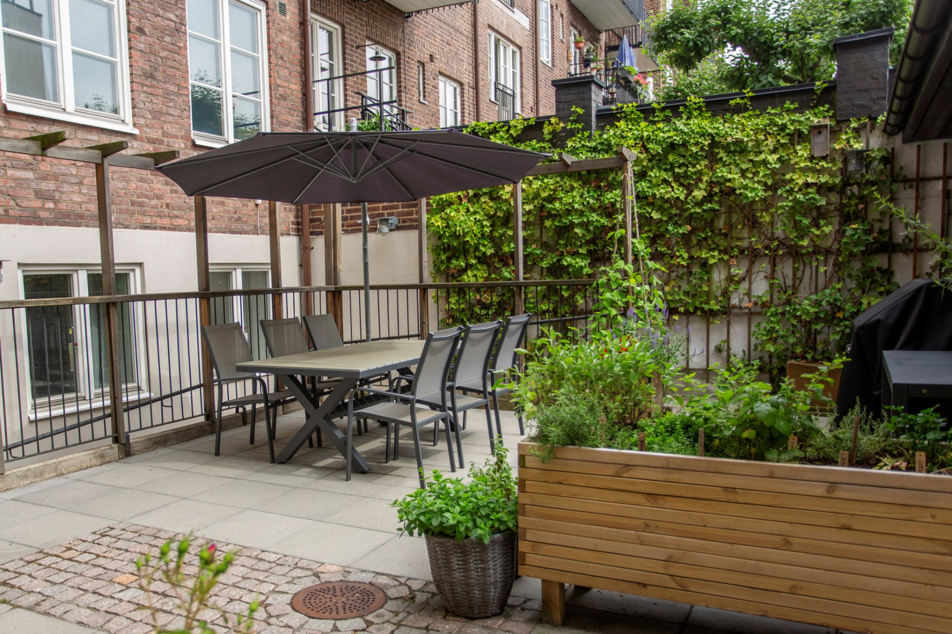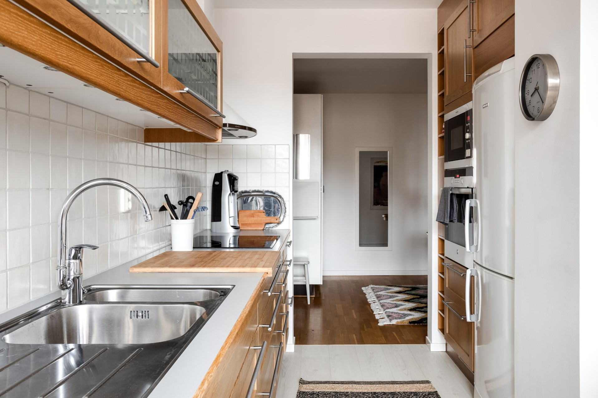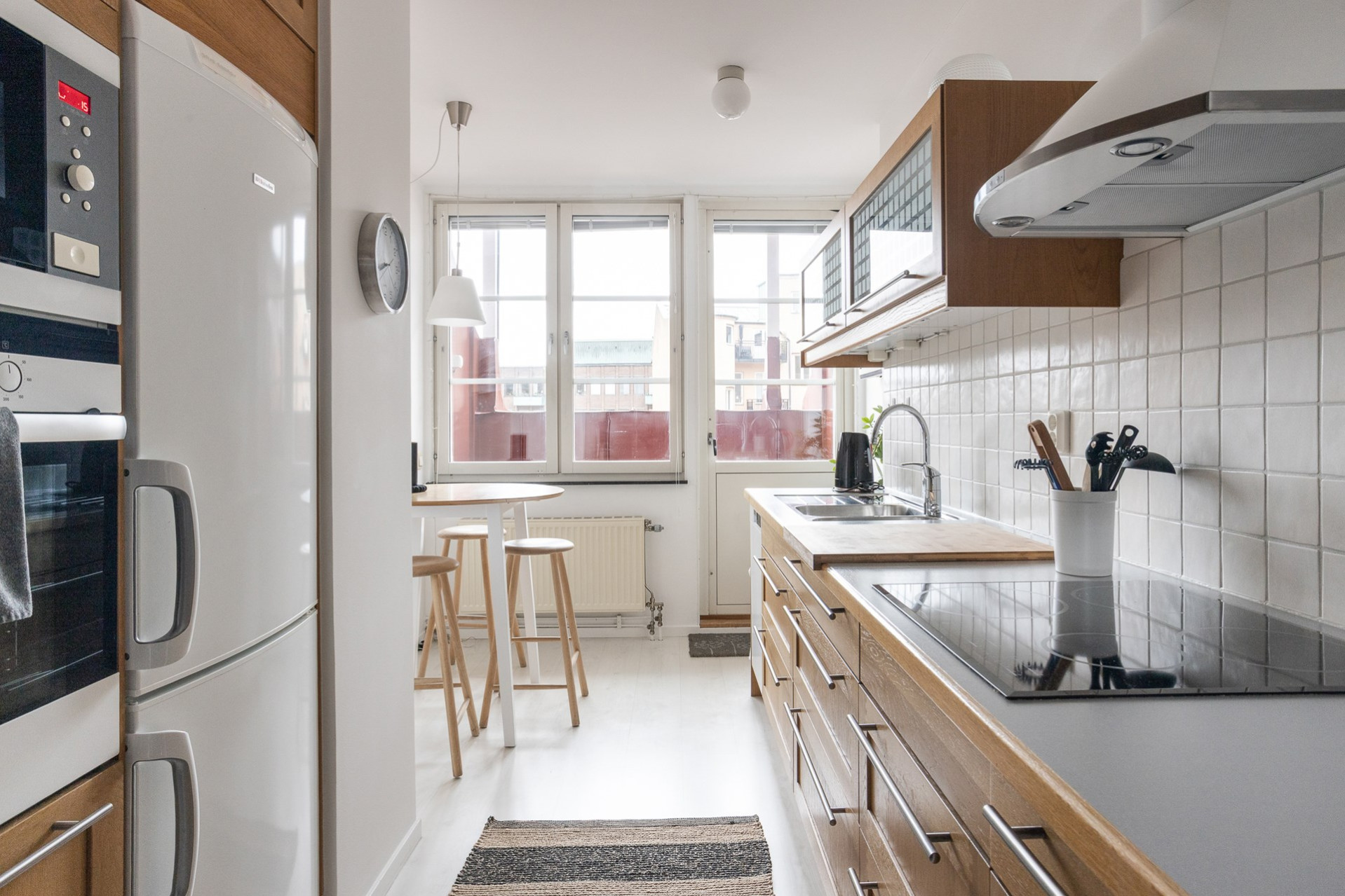 Till höger finner du det stilrena köket med matplats och utgång till den mysiga balkongen i härligt västerläge – en idealisk plats för eftermiddagskaffet eller solnedgångsmiddagen. Köket, som renoverades av IKEA 2009, är utrustat med kvalitativa vitvaror: induktionshäll och ugn från Husqvarna, kyl/frys och mikro från Electrolux samt en fläkt från Franke Design. Diskmaskinen från Cylinda byttes ut 2017.