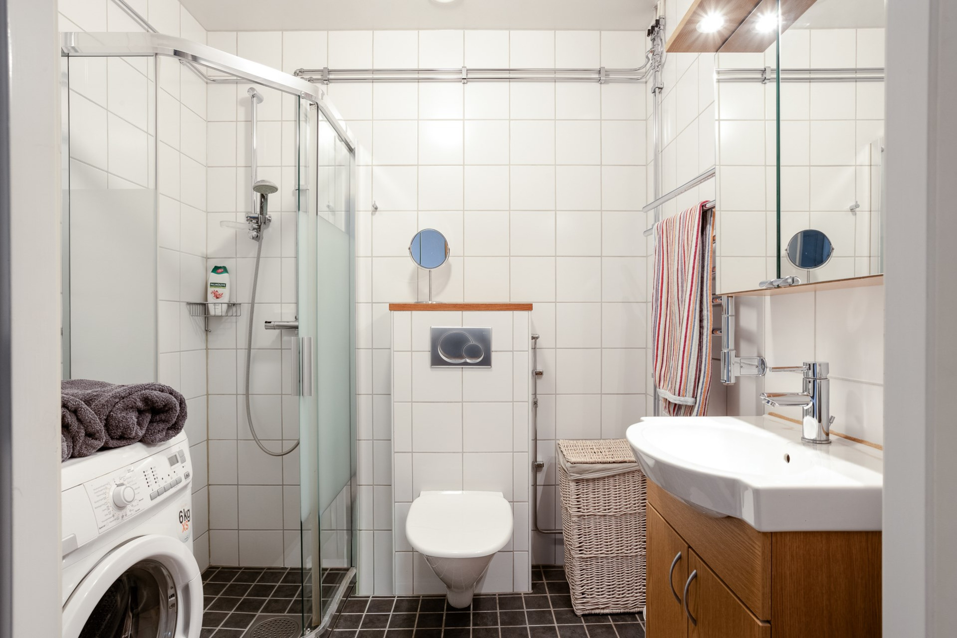 Det helkaklade och stilrena badrummet, renoverat 2009, har både tvättmaskin för vardagens bekvämlighet och dessutom har man tillgång till föreningens gemensamma tvättstuga som du enkelt når via hissen direkt ner till källarplanet.