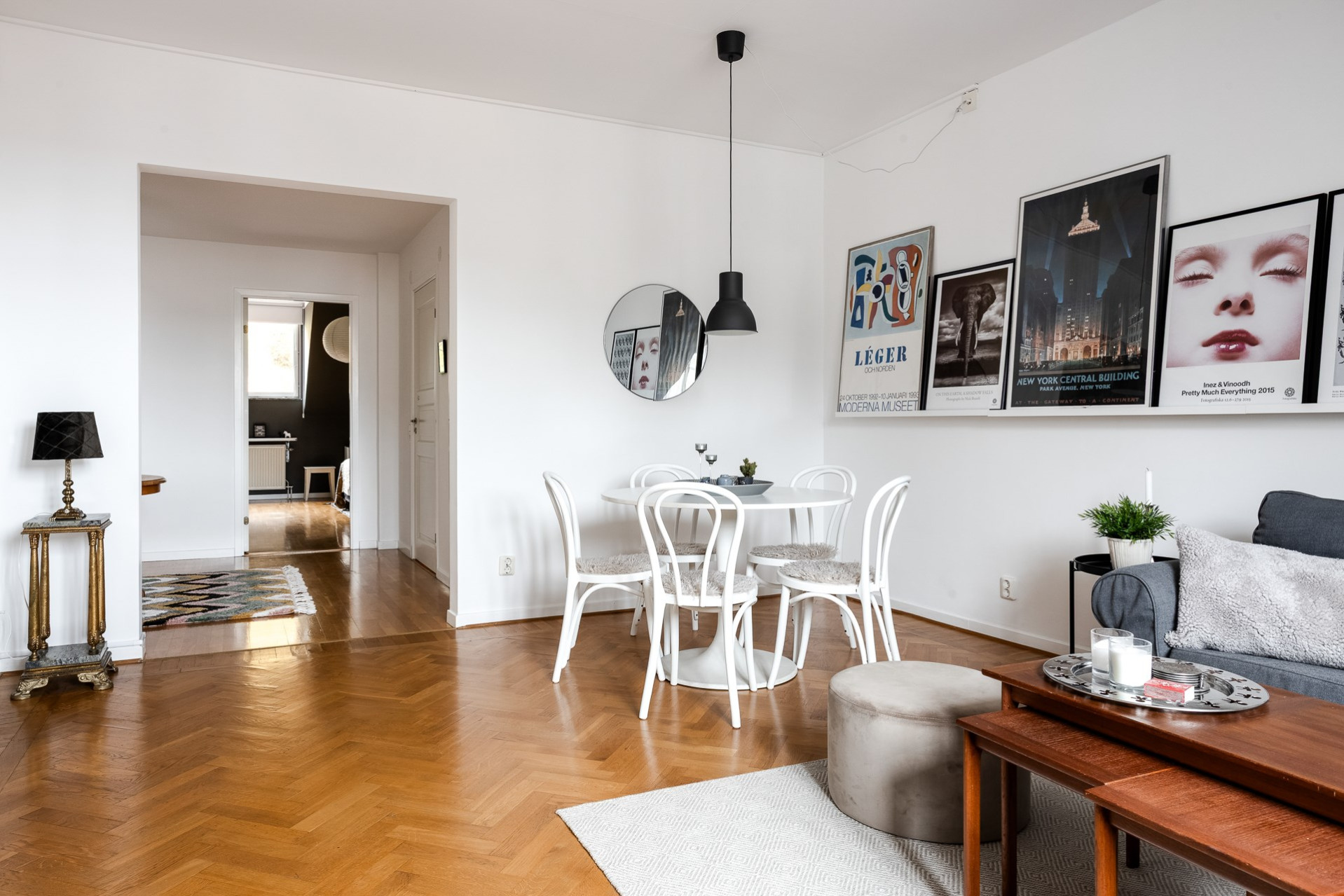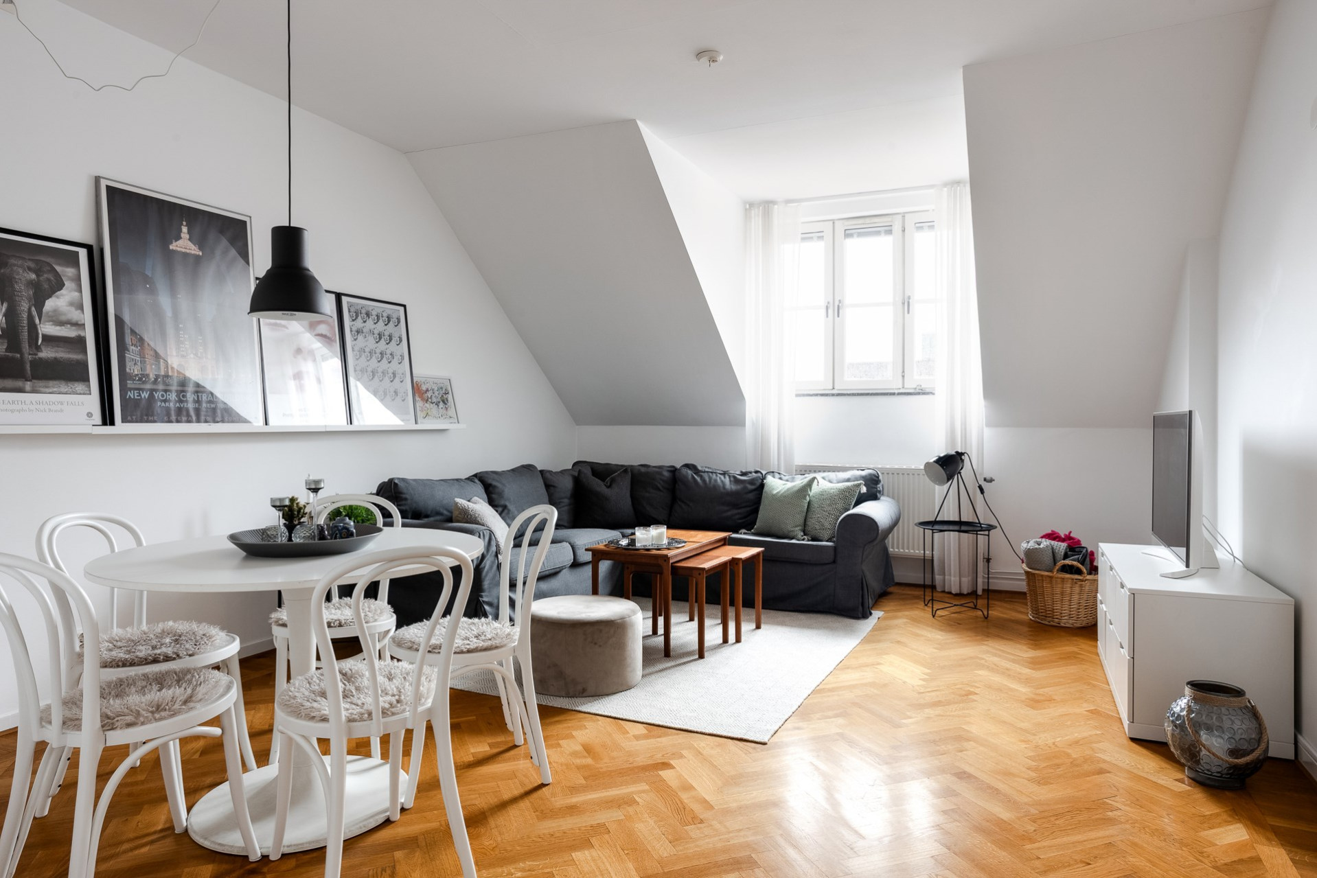 Intill köket ligger det luftiga vardagsrummet som erbjuder flera möbleringsmöjligheter och gott om plats för större möblemang. De ljusa väggarna och den vackra fiskbensparketten skapar en elegant och tidlös atmosfär, medan snedtaket bidrar med charm och karaktär utan att kompromissa med rymden.