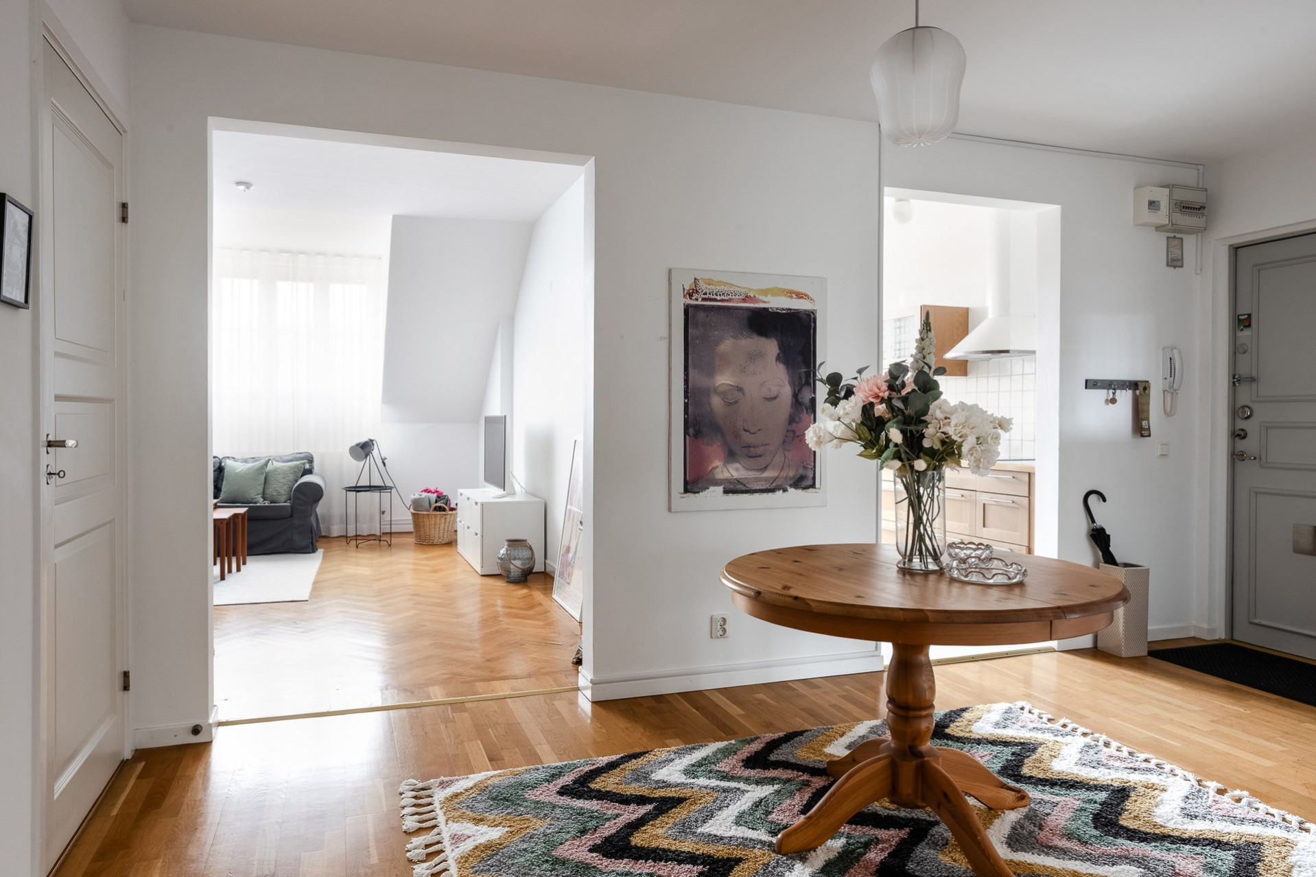 Hissen tar dig bekvämt upp till femte våningen där du välkomnas av en rymlig och inbjudande hall. Här finns gott om plats för ytterkläder och skor tack vare både garderob och generösa avhängningsmöjligheter. Hallens storlek gör att den med fördel kan inredas som en trivsam matsal eller ett praktiskt hemmakontor – perfekt för dig som vill nyttja ytan flexibelt.