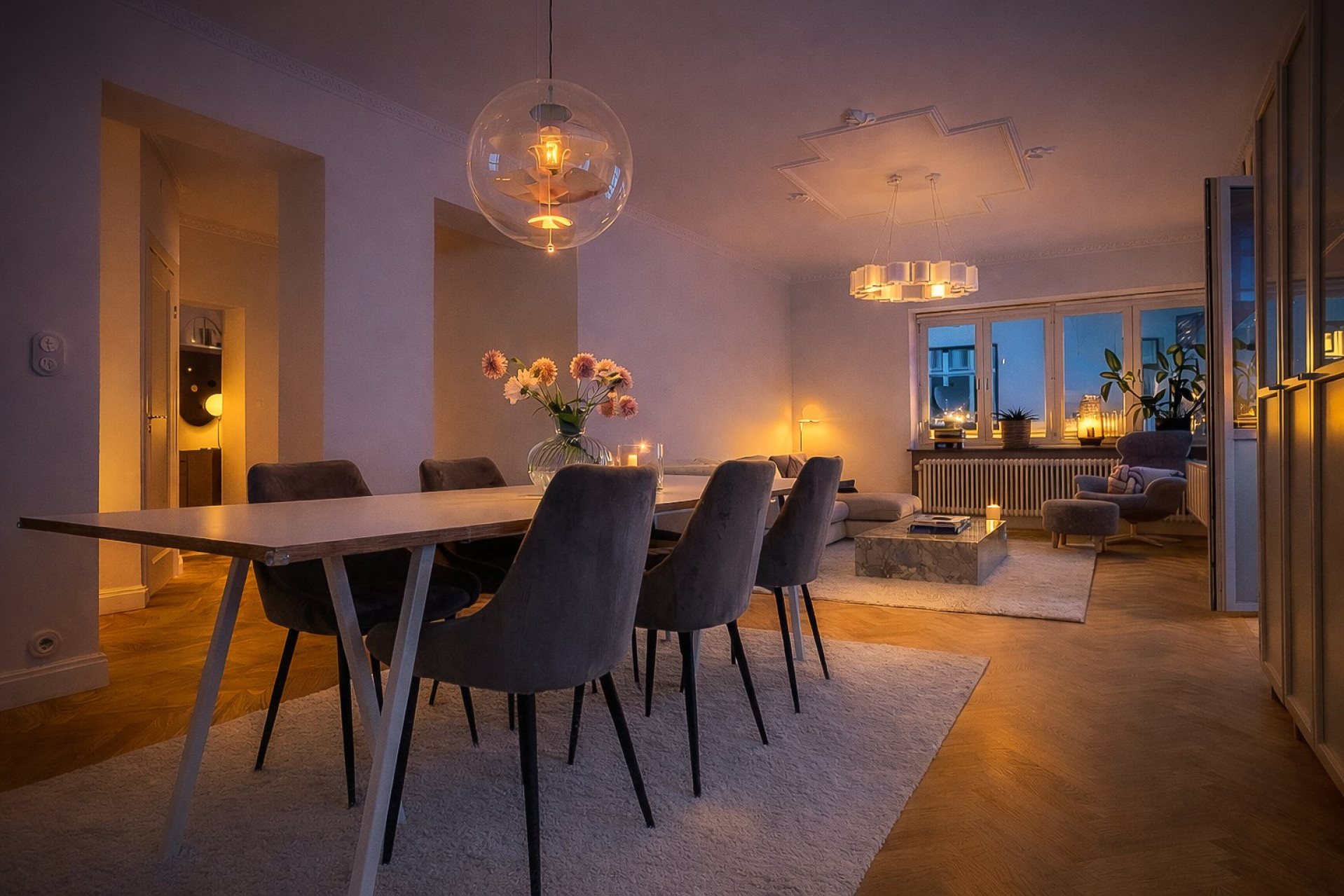 VARDAGSRUM OCH MATSAL i öppen planlösning. Otroligt härligt rum med fint ljusinsläpp. Möjlighet att duka upp riktigt långbord samt möblera med rejäl soffhörna. Utgång till balkongen. Fint takstuckaturer och fiskbensparketten flyter magiskt genom rummet.