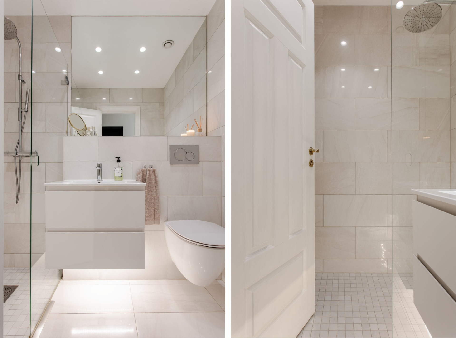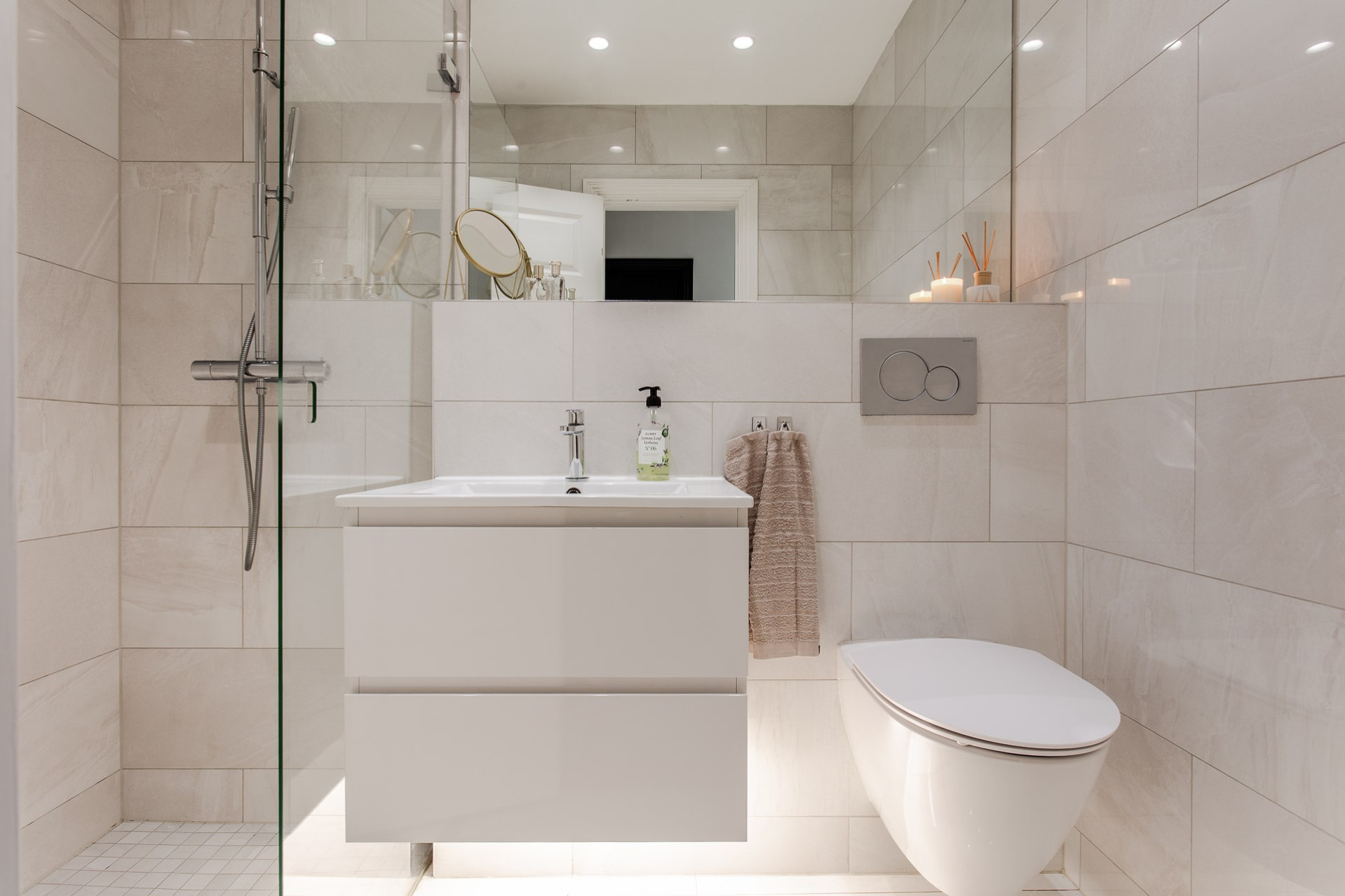 Badrummet är mycket elegant med ett sobert kakel och klinker. Dusch med glasvägg, handfat med kommod och belysning undertill, stor spegel och vägghängd WC. Självklart spotlights i tak.