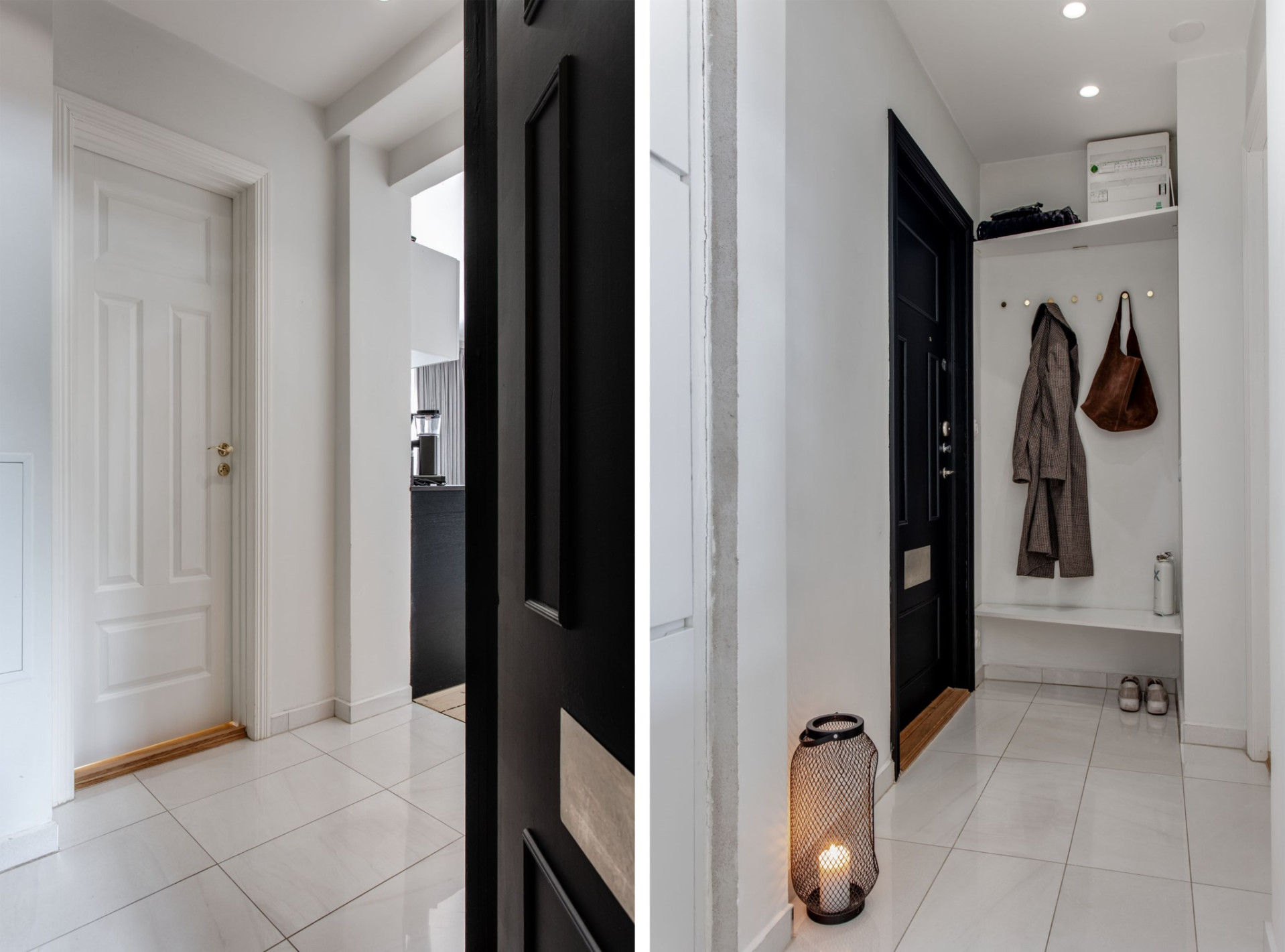 Hall med plats för avhängning och skor. Klinkergolv och spotlights i tak.