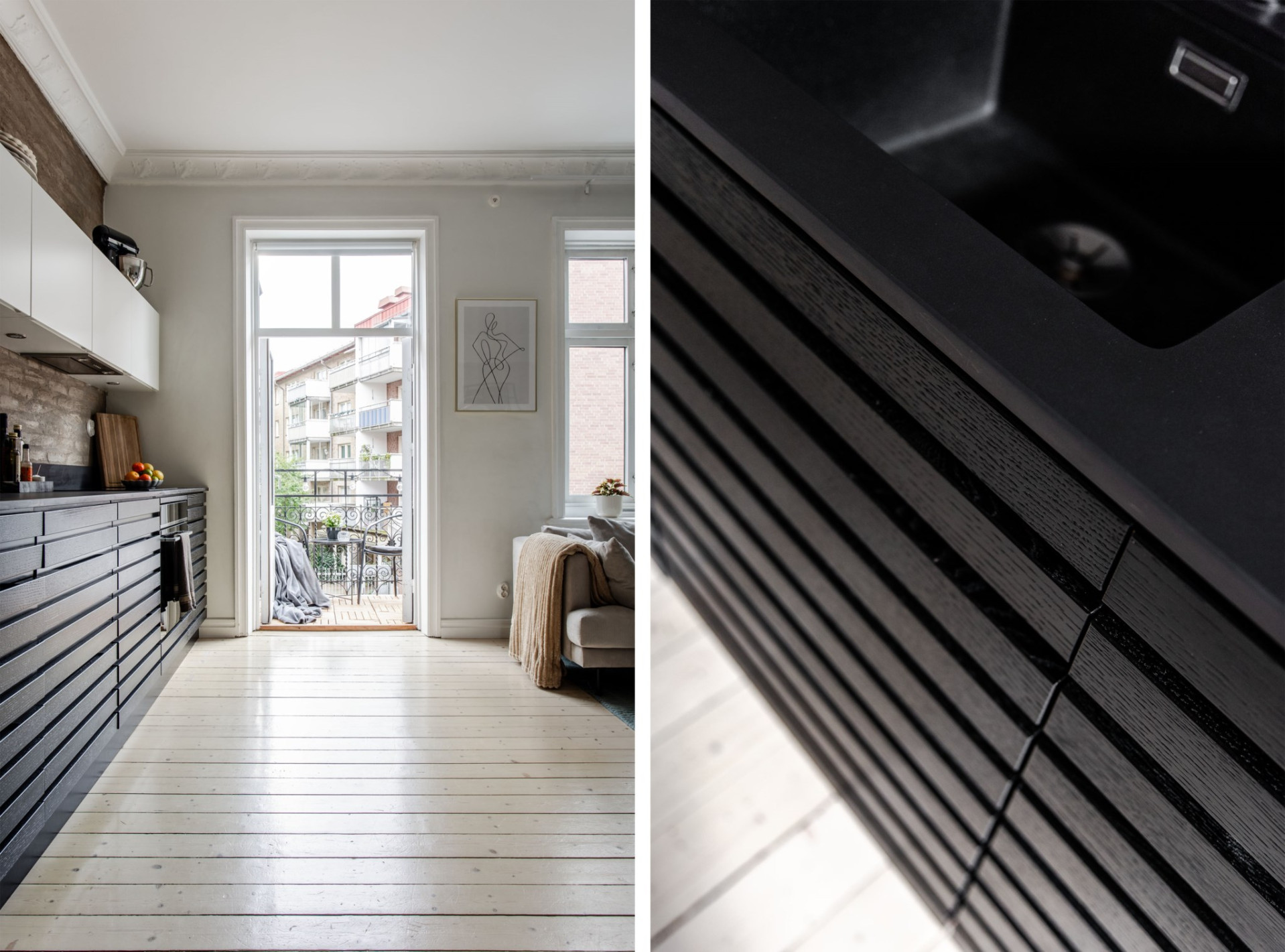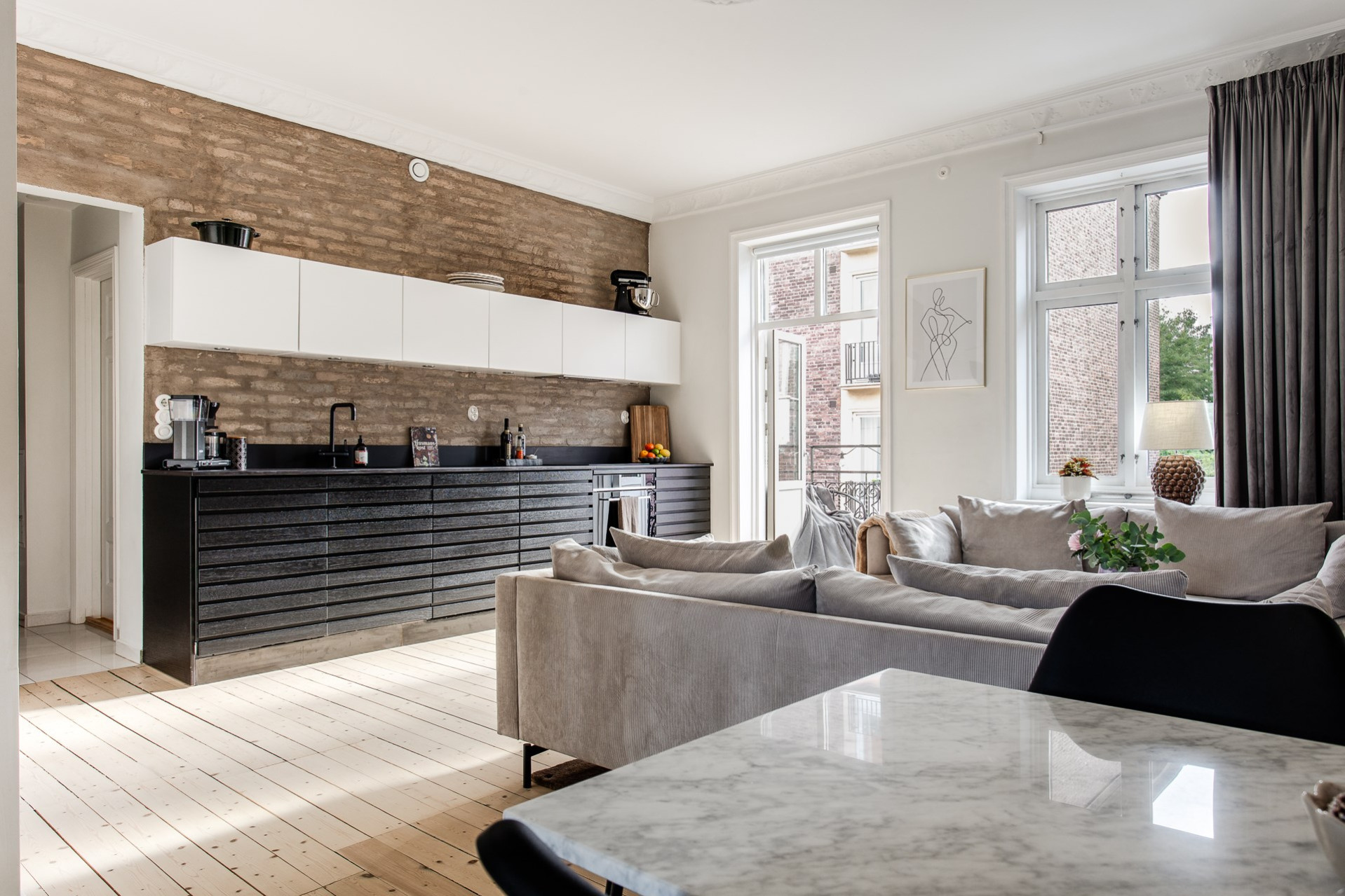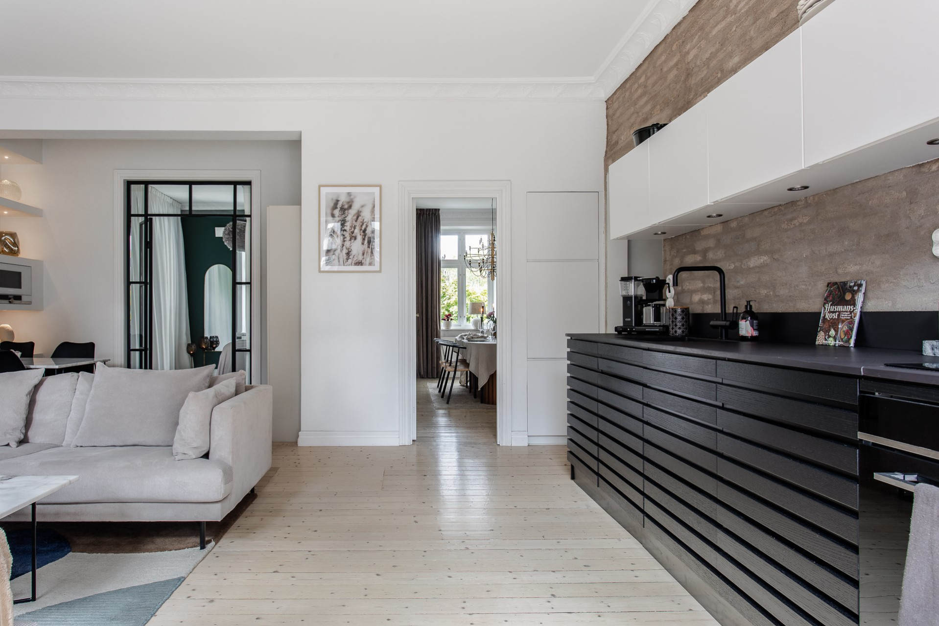 Köket är går i tonerna av svart och vitt. God arbetsyta och överskåp för gott om förvaring. Maskinella utrustningen består av induktionshäll med fläkt ovan, kombinerad kyl/frys som är läckert integrerad i väggen, ugn, diskmaskin och tvättmaskin samt micro som också gömts snyggt i väggen. Den framtagna tegelväggen bakom köket är en mycket snygg detalj som får industriella toner att samspela med sekelskiftets charm.