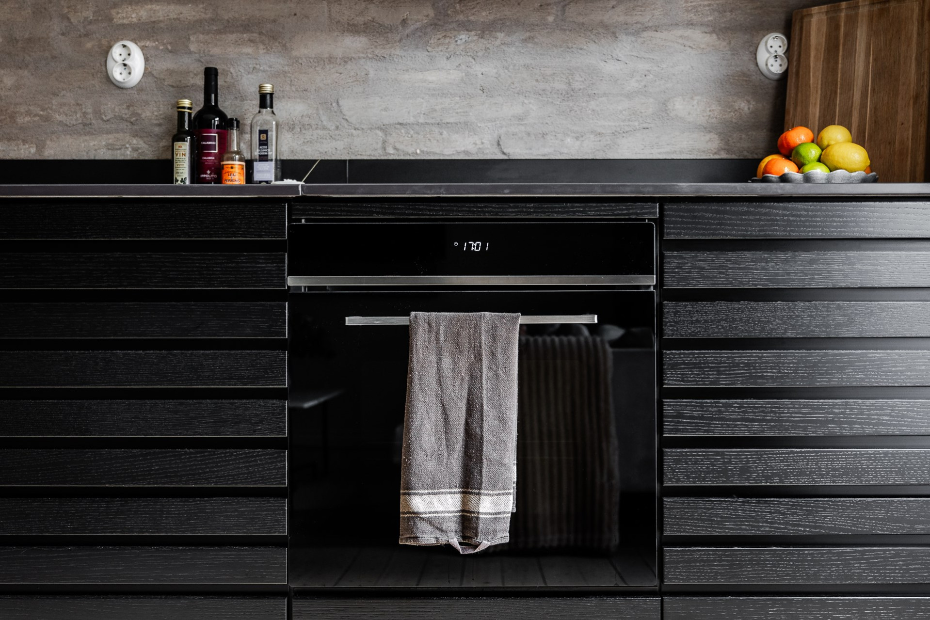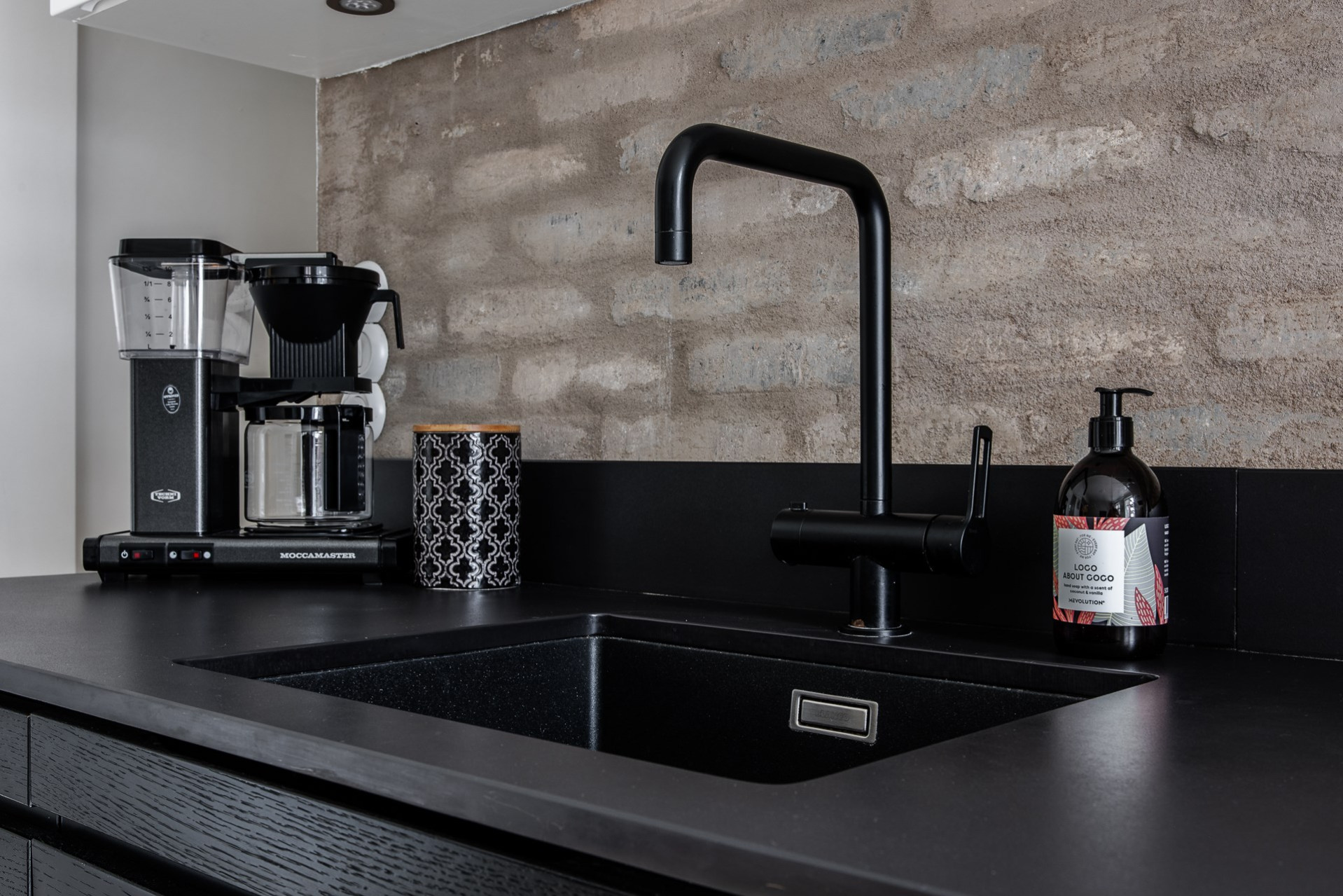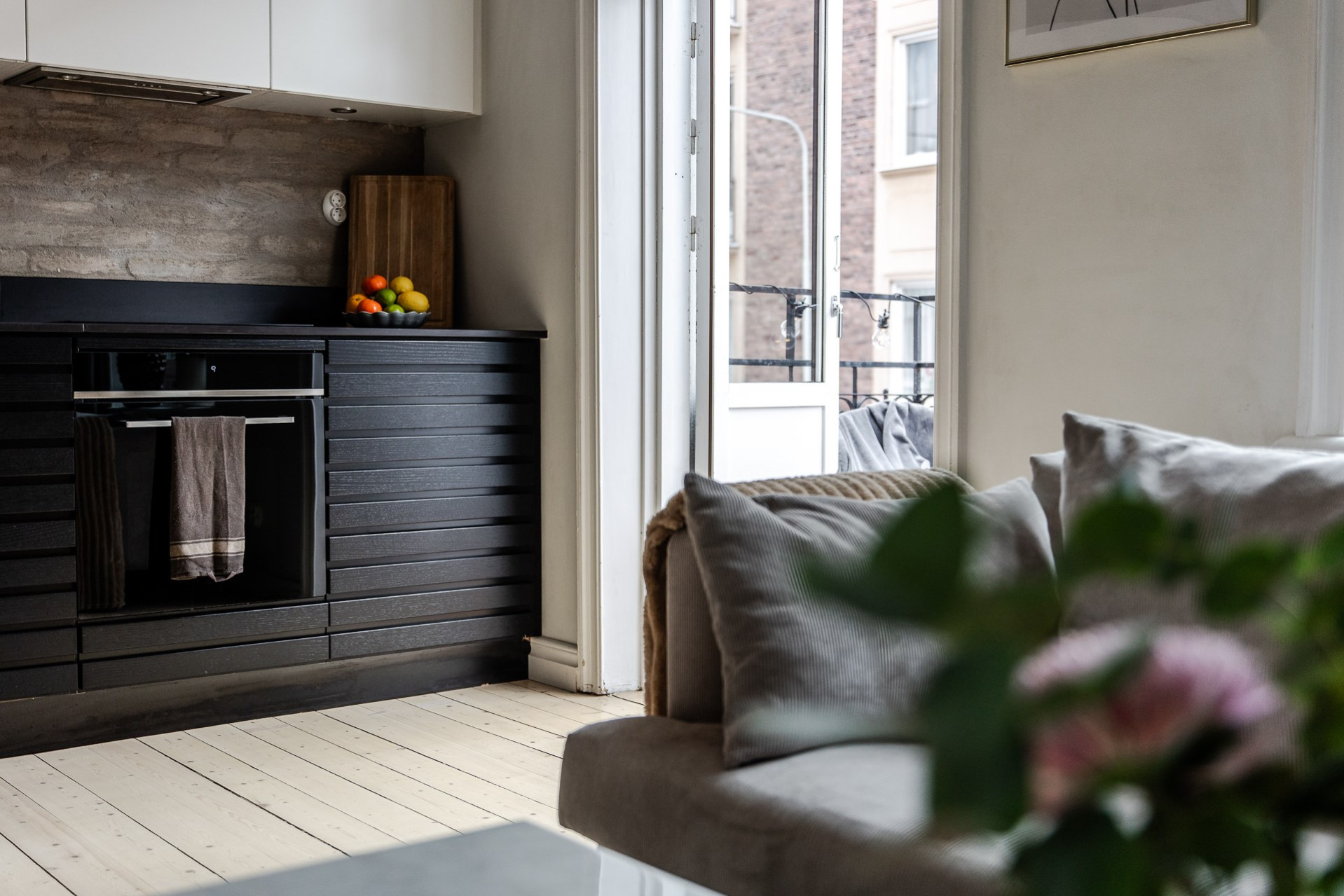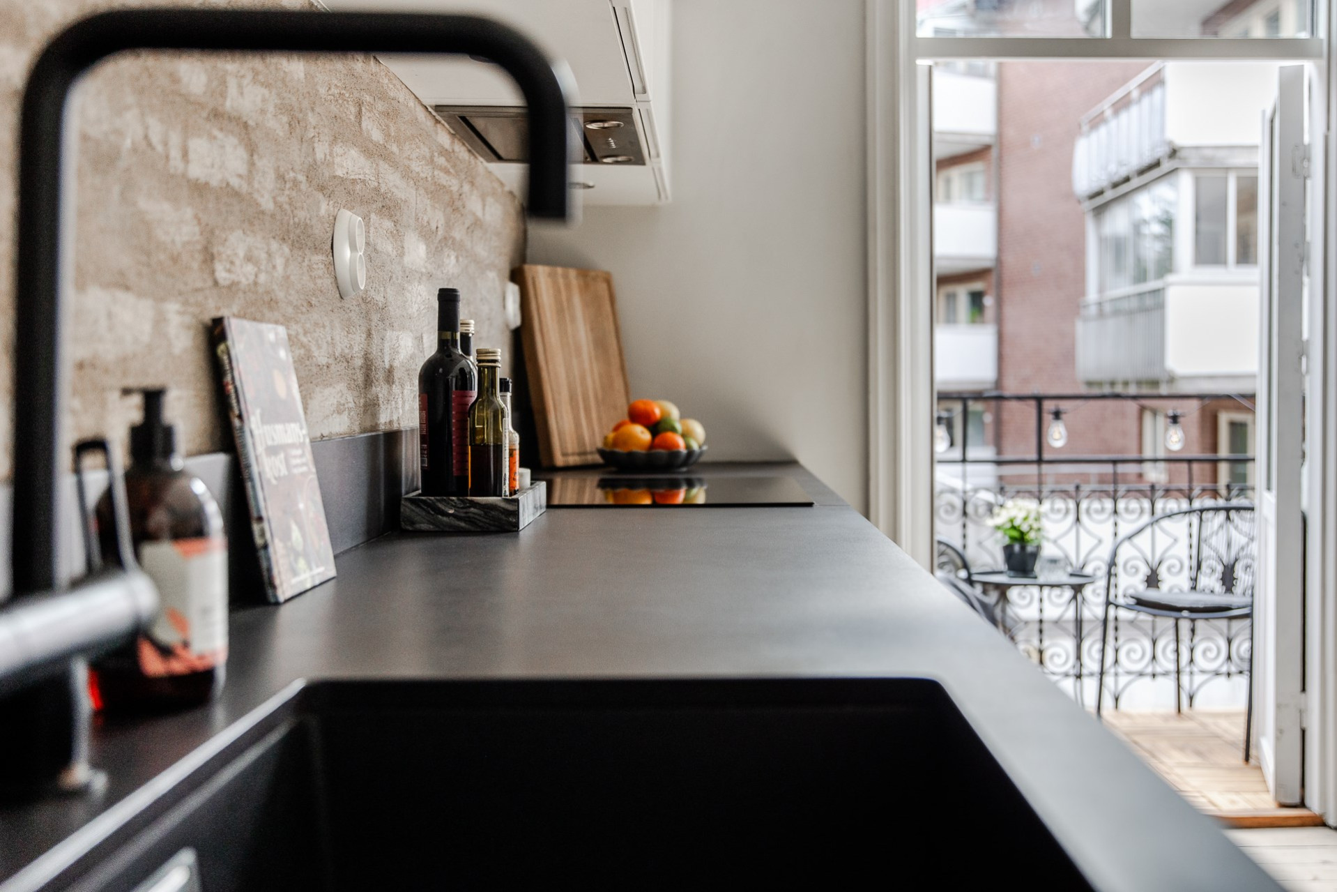 Köket är går i tonerna av svart och vitt. God arbetsyta och överskåp för gott om förvaring. Maskinella utrustningen består av induktionshäll med fläkt ovan, kombinerad kyl/frys som är läckert integrerad i väggen, ugn, diskmaskin och tvättmaskin samt micro som också gömts snyggt i väggen. Den framtagna tegelväggen bakom köket är en mycket snygg detalj som får industriella toner att samspela med sekelskiftets charm.