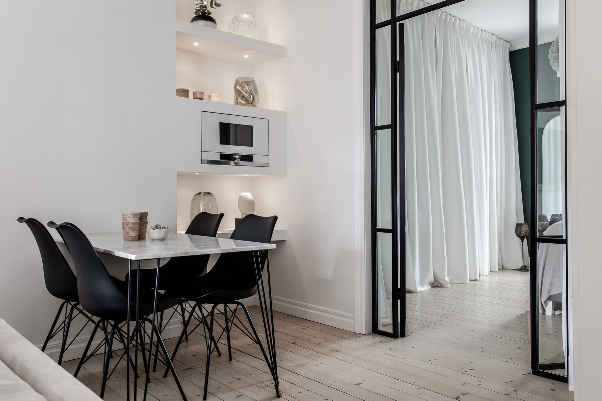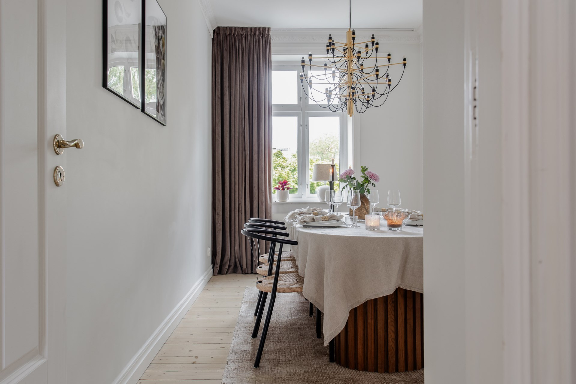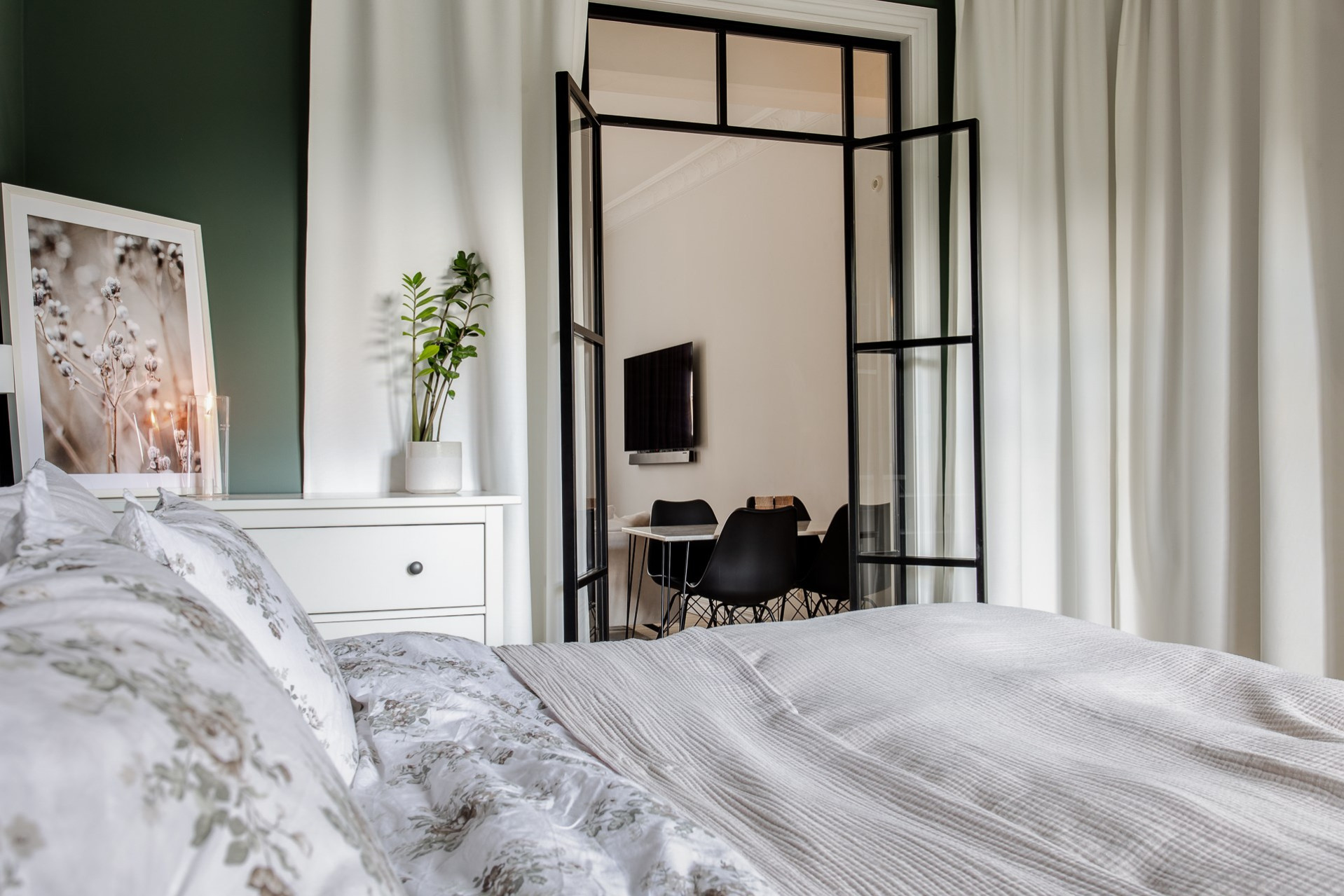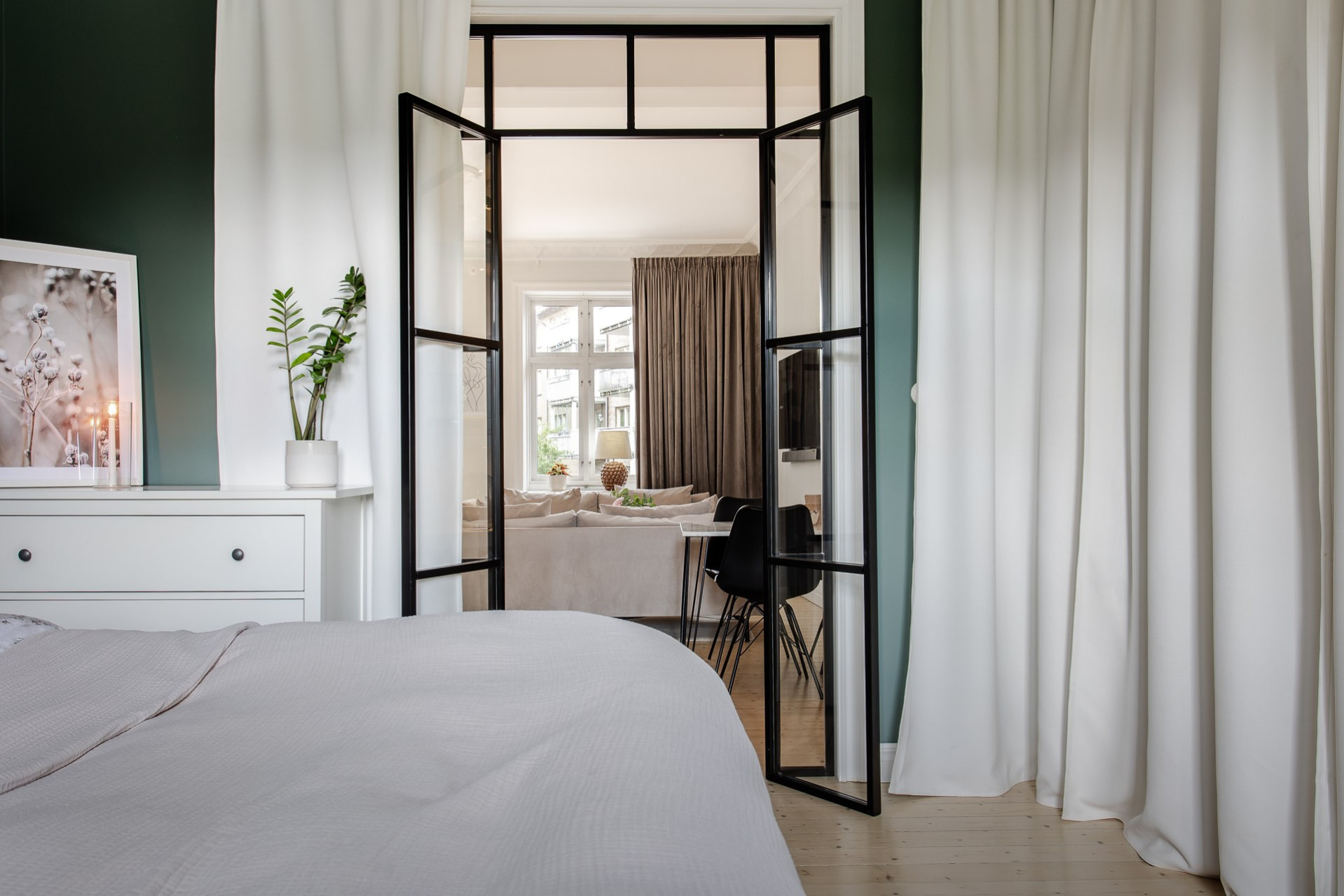 Lägenhetens andra sovrum används idag som en lyxigare matsal för ett större sällskap. Även detta rum är lugnt beläget mot innergården och är ett perfekt gästrum, hemmakontor eller precis som idag - lyxig matsal.