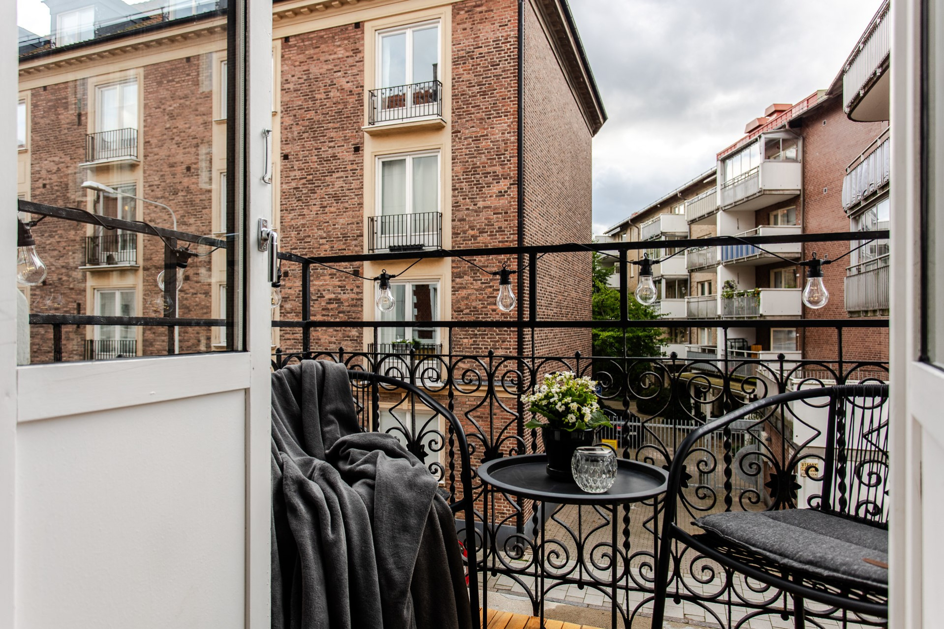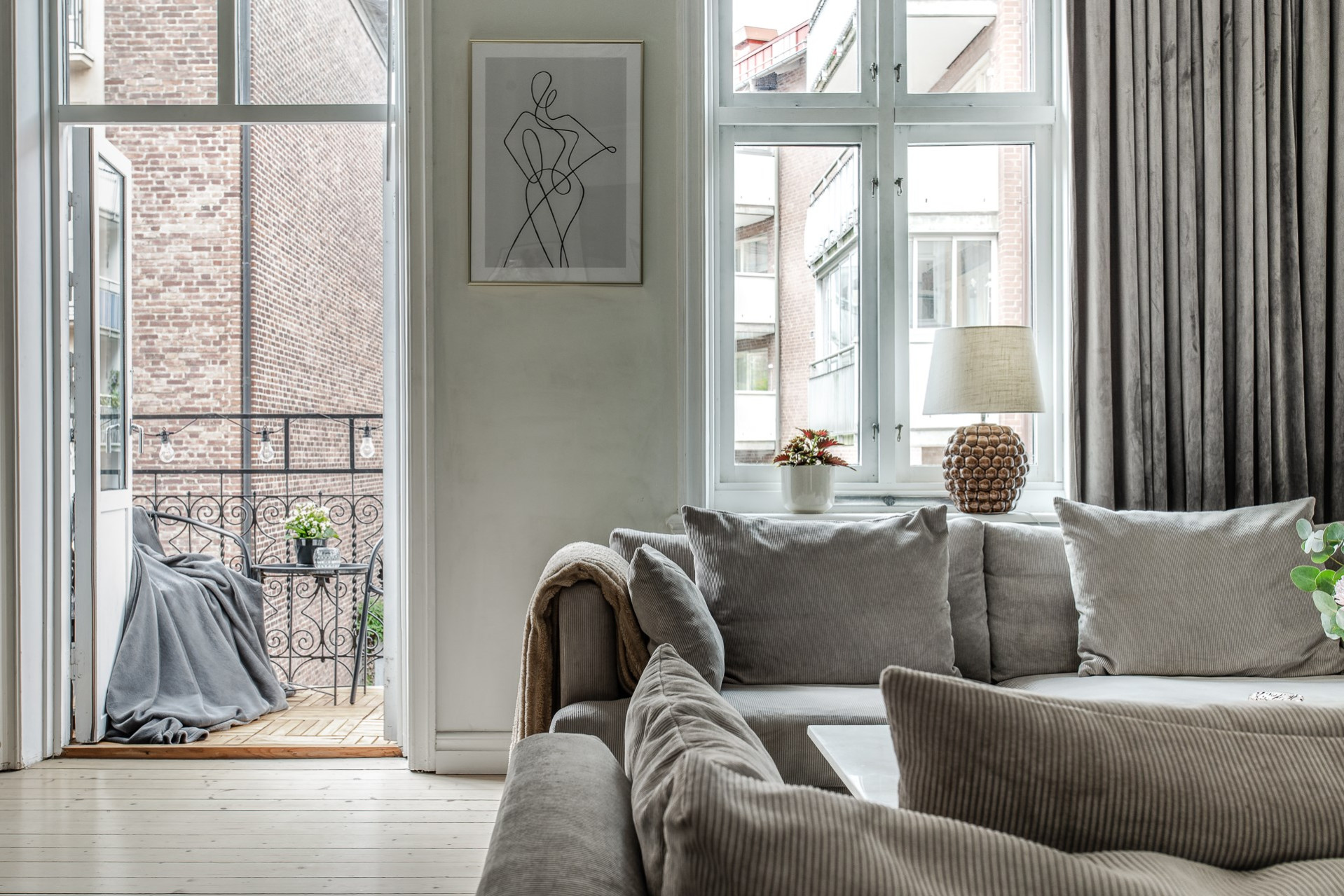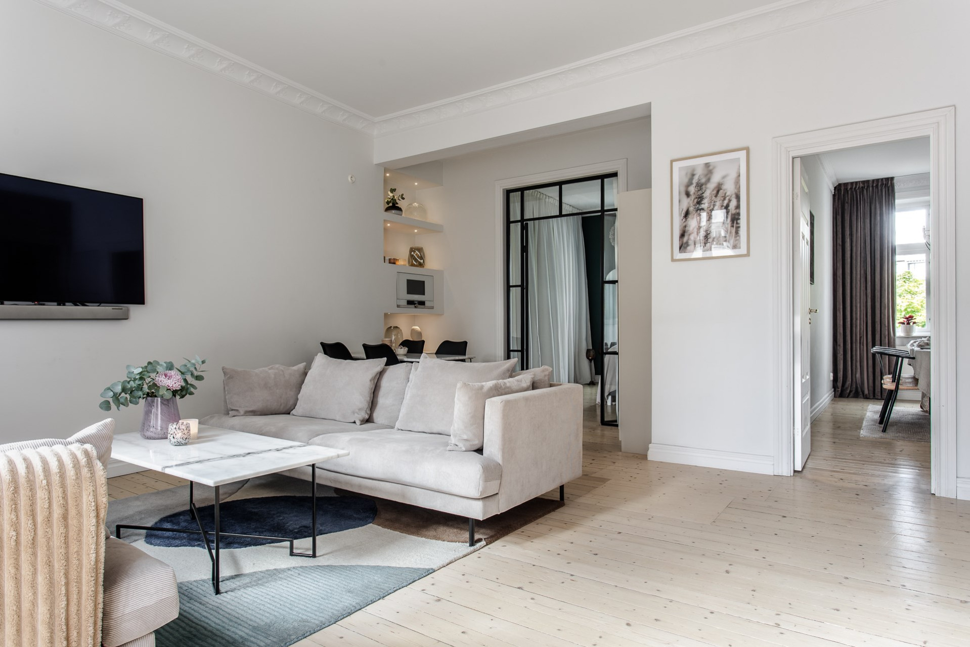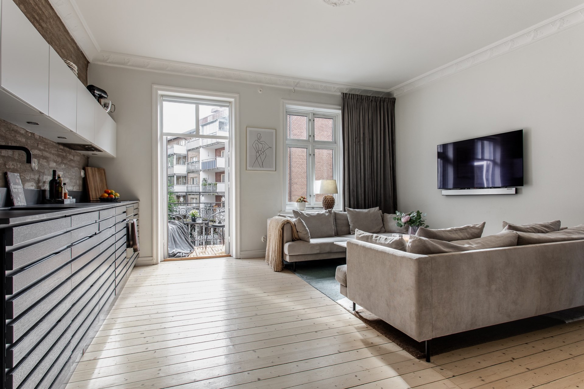 Allrummet huserar både vardagsrum och matplats för ett mindre sällskap. Här ges en härlig takhöjd med bevarare orignaldetaljer som stuckatur och takrosett. Här samspelar rummet med köket i en öppen planlösning som onekligen ger det "sociala rummet". Från rummet nås balkongen som vätter mot gatan och med fördel för dag och eftermiddagssol.