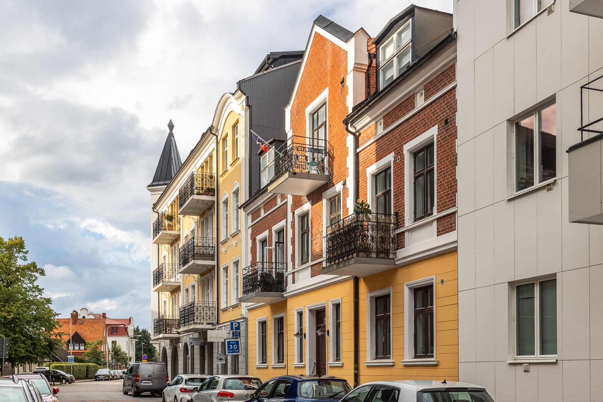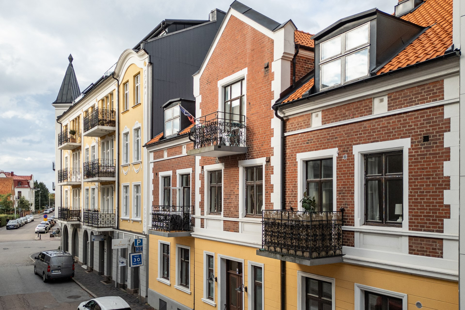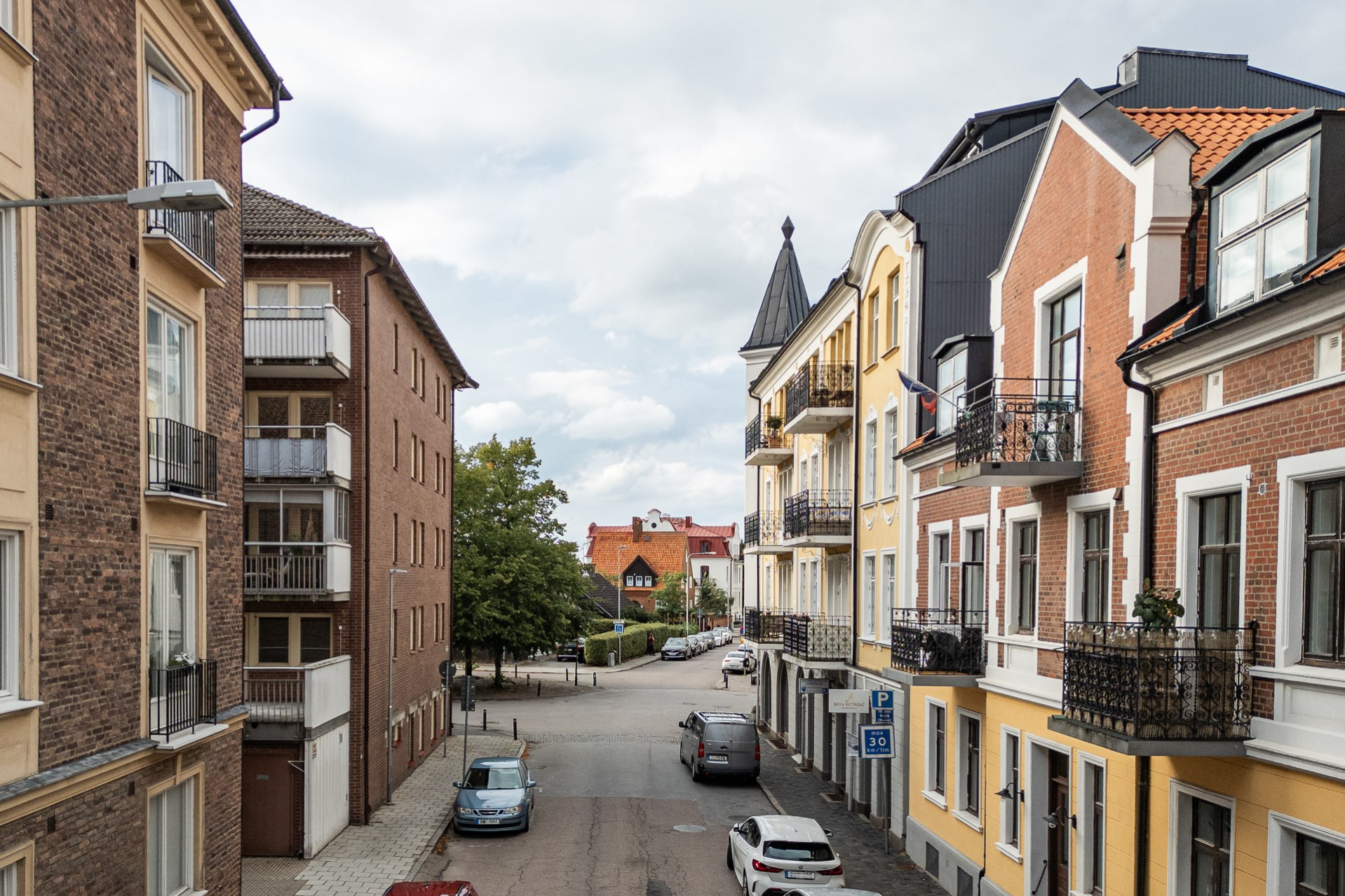 Sovrummet är lugnt beläget mot innergården och väl tilltaget. Här ges plats för stor säng, nattduksbord och bakom ett gardinparti ges plats för alla tänkbara kläder.