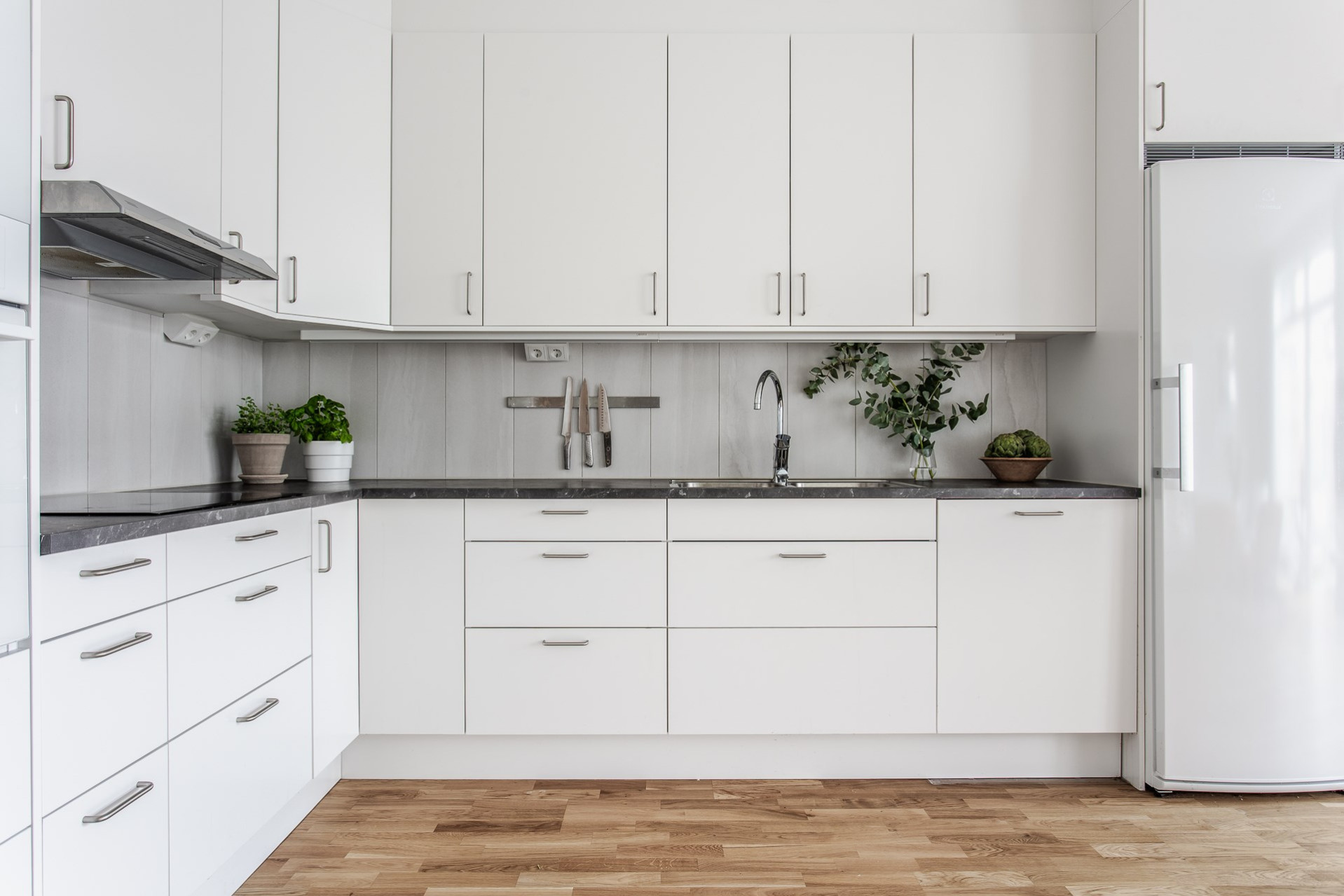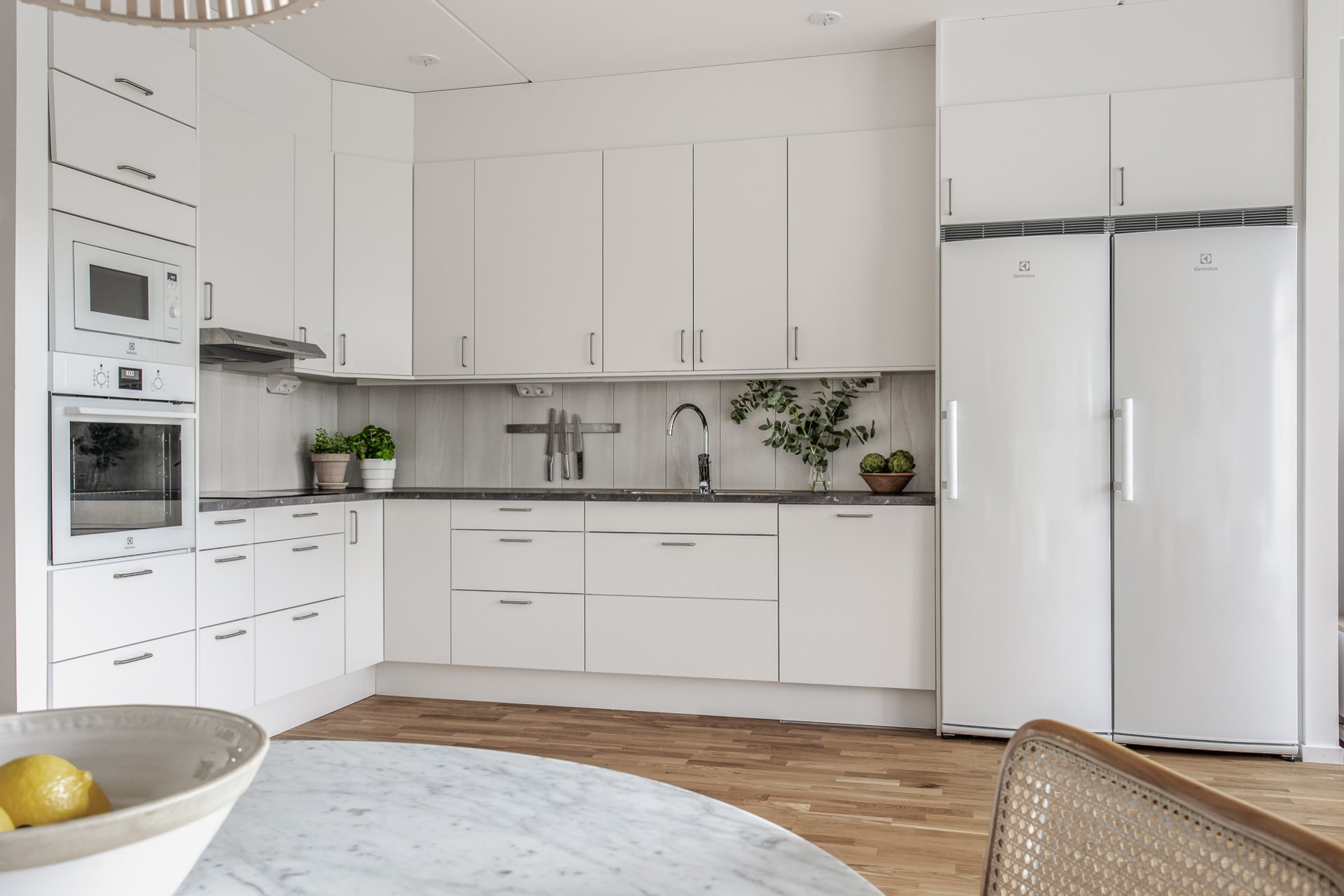 Ljust och stilrent kök utrustat med kyl & frys, inbyggd ugn och mikrovågsugn, induktionshäll, spisfläkt och diskmaskin - Allt från Electrolux. De vita skåpen och lådorna erbjuder gott om förvaringsmöjligheter och den gråmelerade bänkskivan i laminat bryter snyggt av mot det vita. Ljust kakel som stänkskydd. Här finns möjlighet att ställa en köksö som bidrar med ytterligare mer förvaring och arbetsyta. Köket är öppet mot vardagsrummet, vilket skapar en luftig och social atmosfär där familj och vänner kan umgås samtidigt som matlagningen pågå.