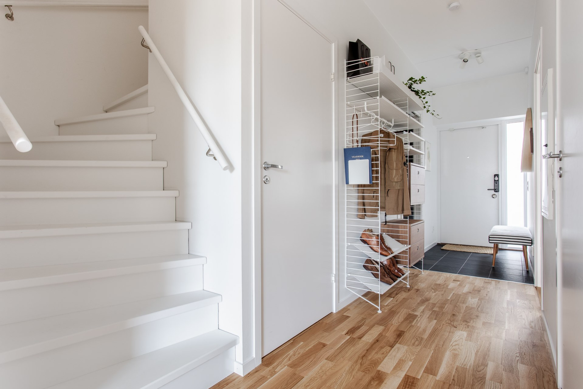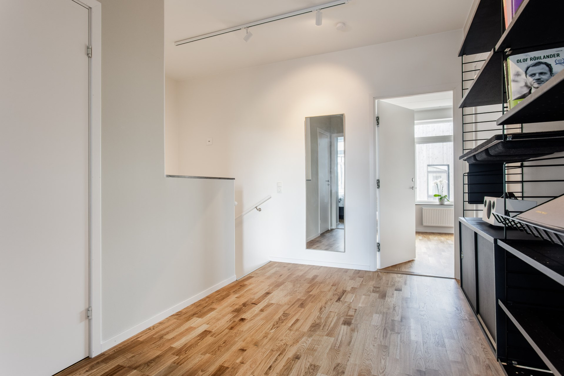 När ni tar trappan upp möts ni av en möblerbar hall som tar er vidare till samtliga rum på övre plan samt ett förråd. Väggarna är vita.