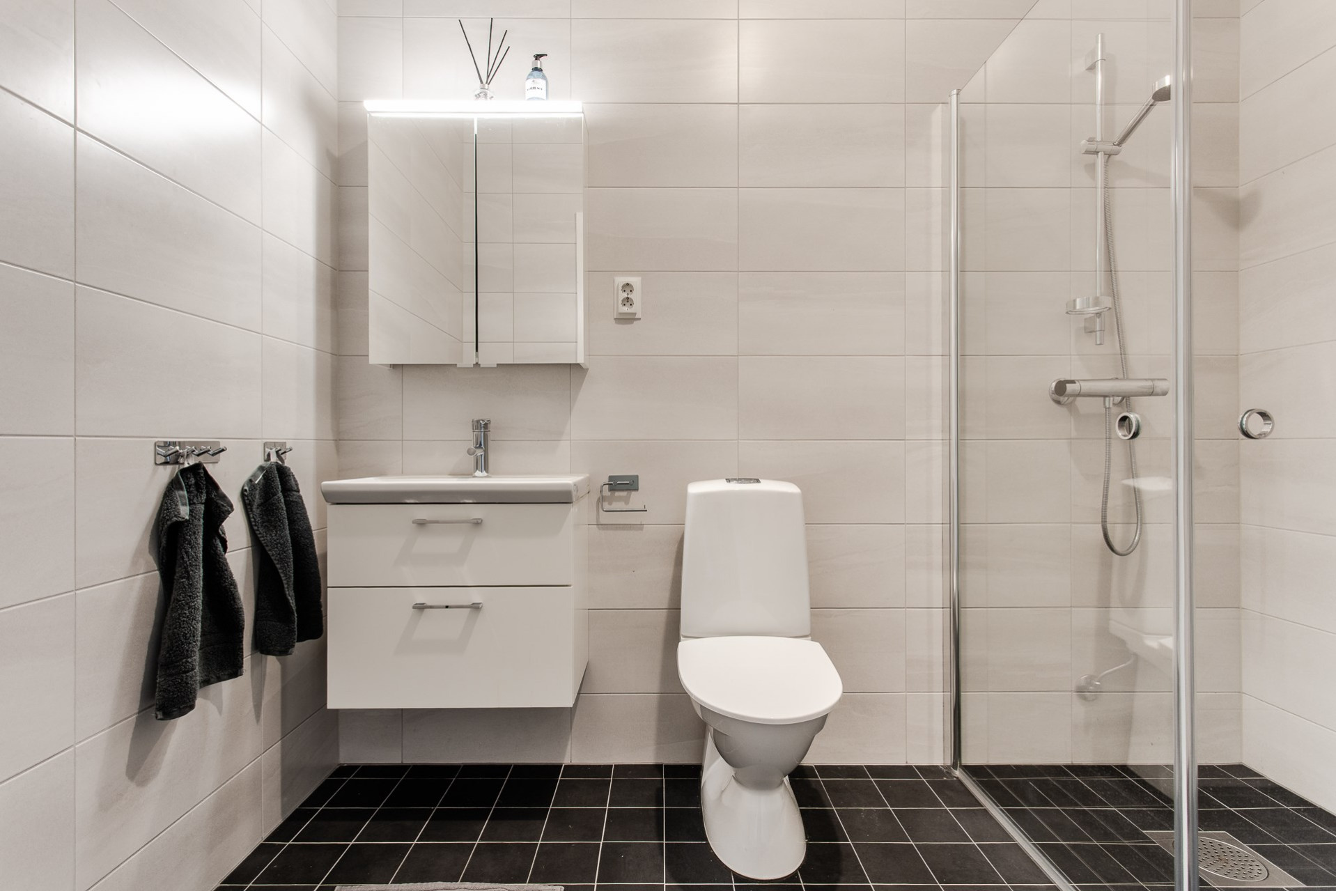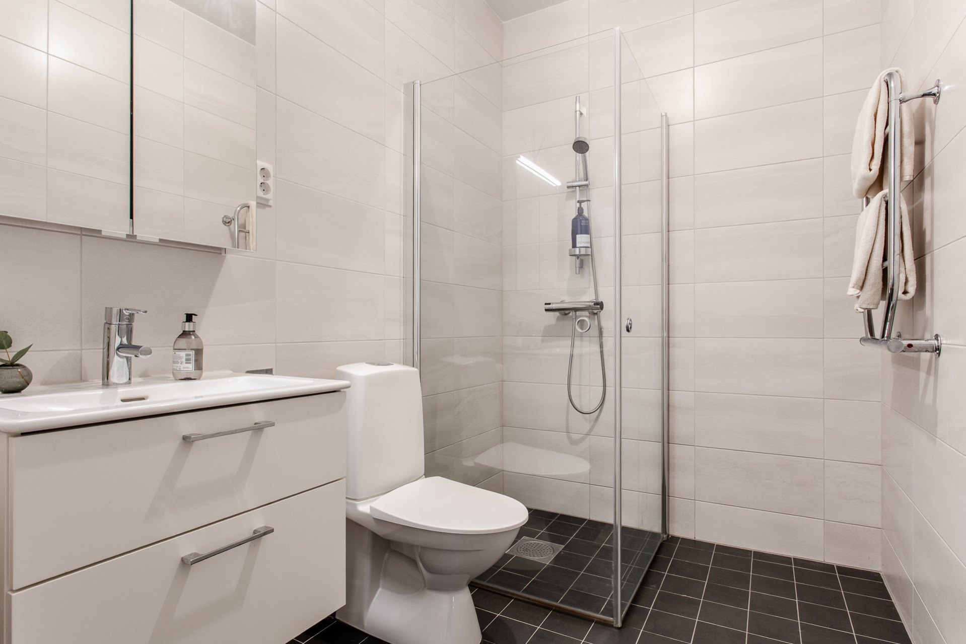 Modernt, helkaklat badrum utrustat med dusch och duschdörrar i glas, vask med kommod undertill samt spegelskåp som erbjuder plats för hygienartiklar, wc och uppvärmd handdukstork.