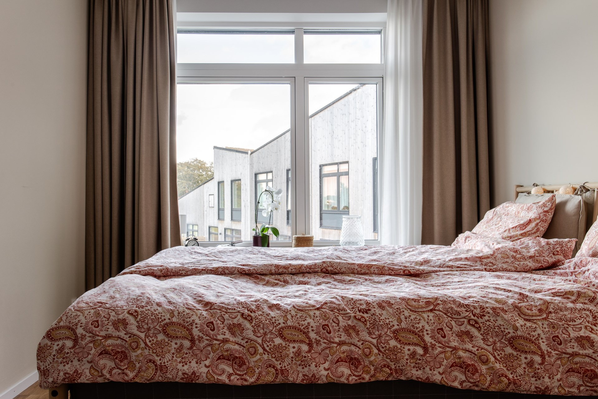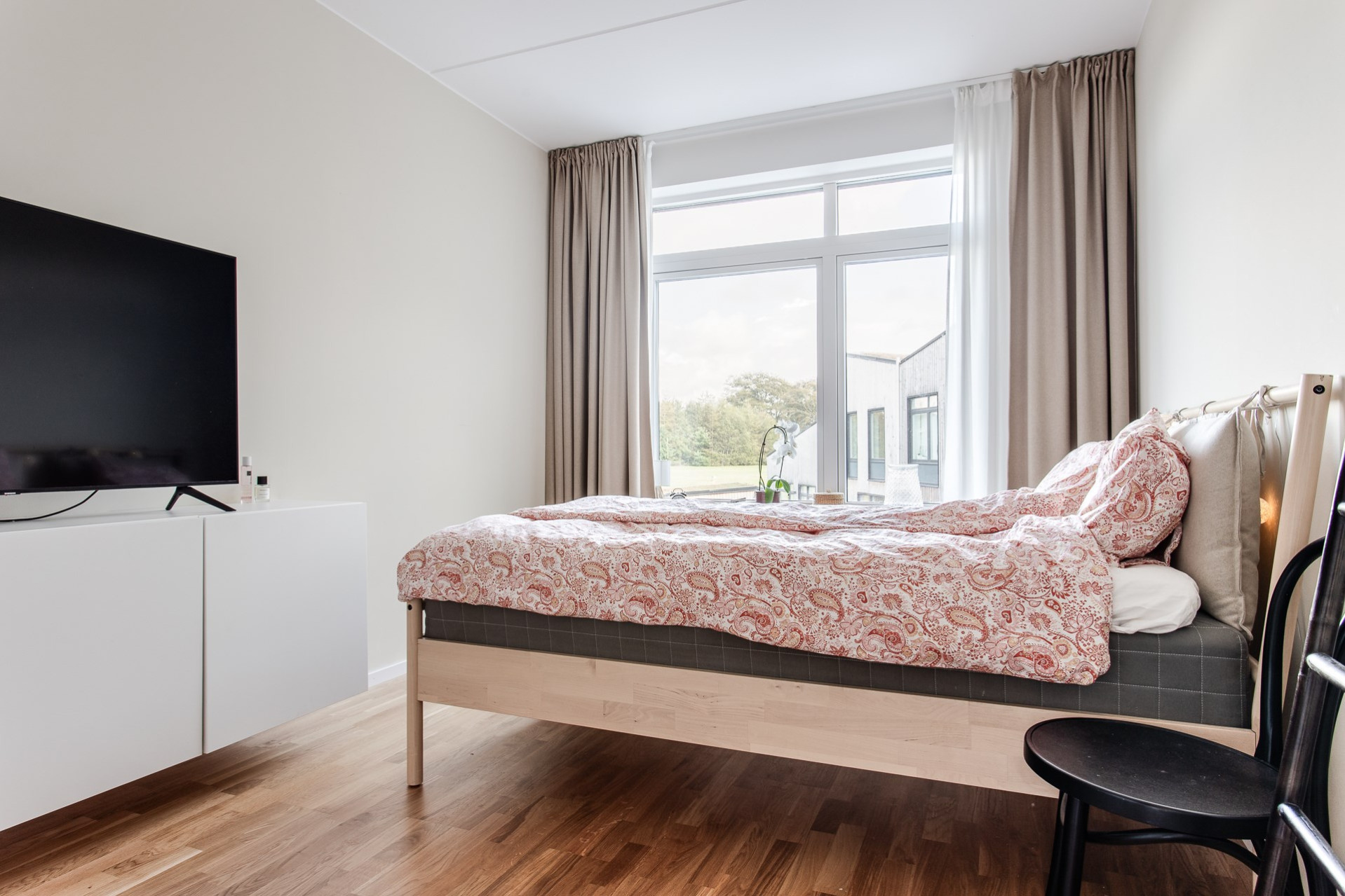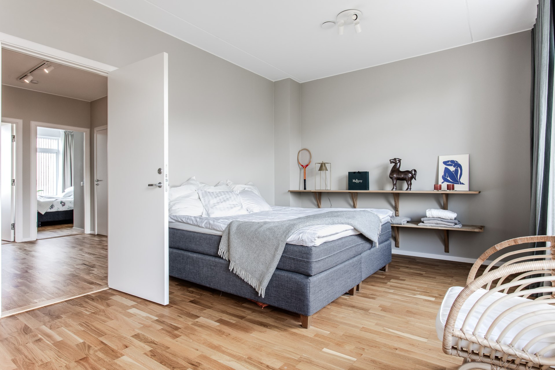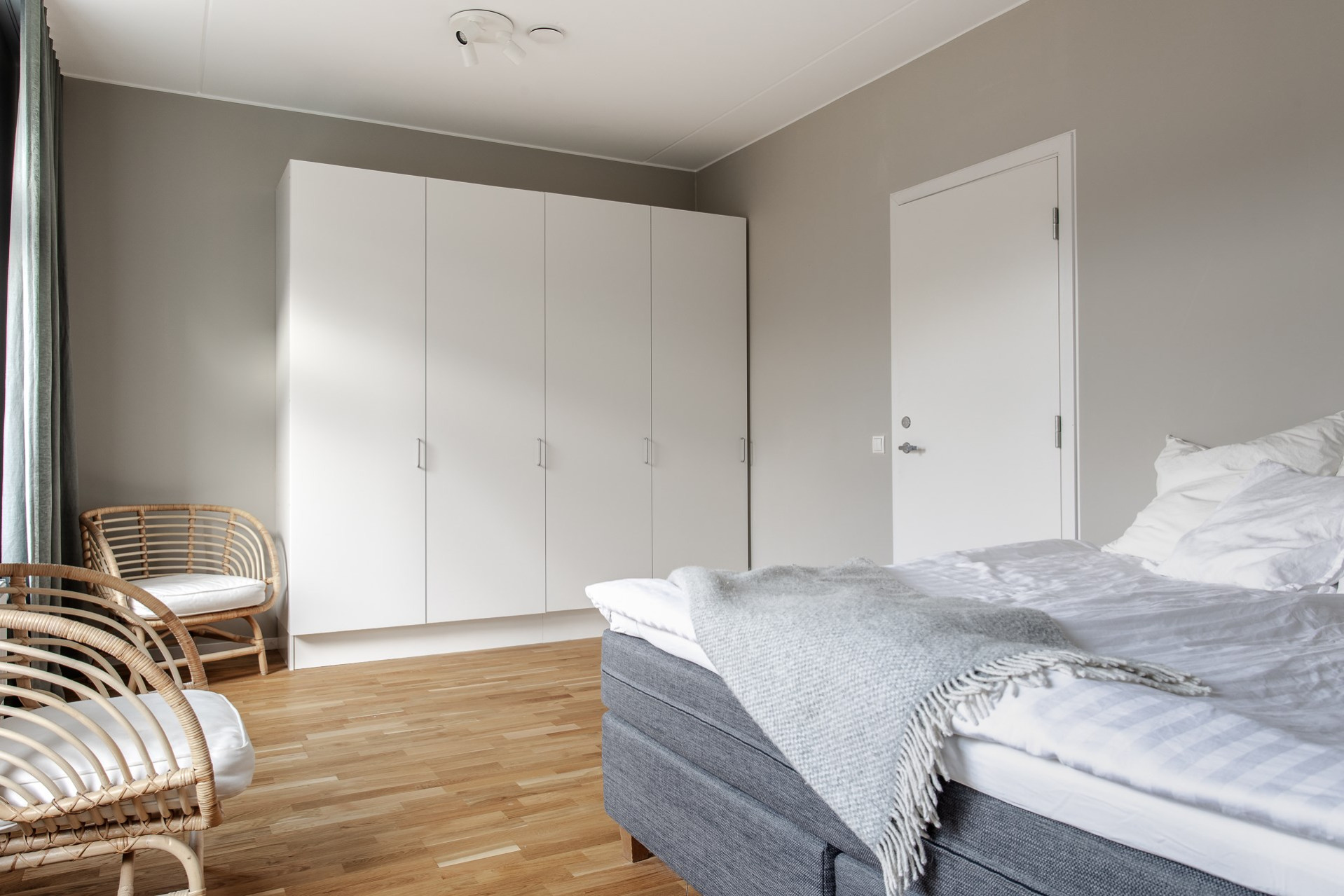Ett stort sovrum som enkelt att göras om till två sovrum om behovet finns. Här ryms en dubbelsäng och annat möblemang enligt önskemål. Garderoberna erbjuder goda förvaringsmöjligheter. Väggarna är målade i en greige behaglig färg.