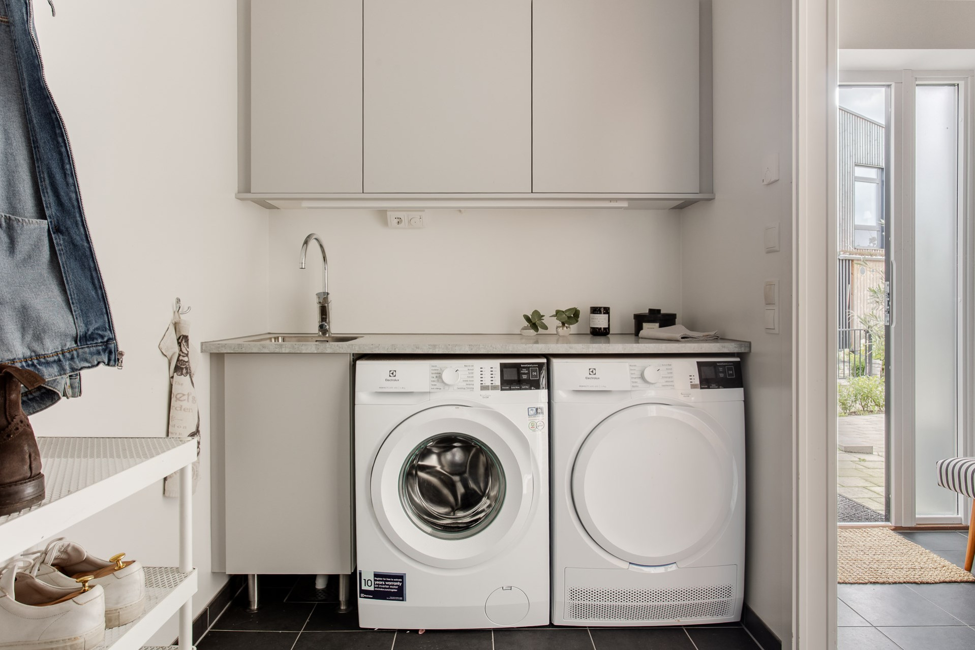 En praktisk tvättstuga utrustad med tvättmaskin och torktumlare från Electrolux och ovanpå vilar en ljus bänkskiva i laminat. Vägghängda skåp i en beige fin färg som erbjuder gott om förvaringsmöjligheter. På golvet vilar ett mörkt klinker och väggarna är vita.