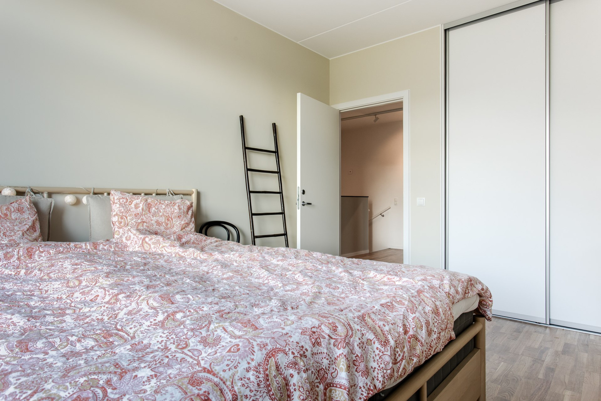 Ett rymligt sovrum där ni får plats med dubbelsäng och annat önskat möblemang. Inbyggd garderob med skjutdörrar som erbjuder goda förvaringsmöjligheter. Ljus härlig färg på väggarna.