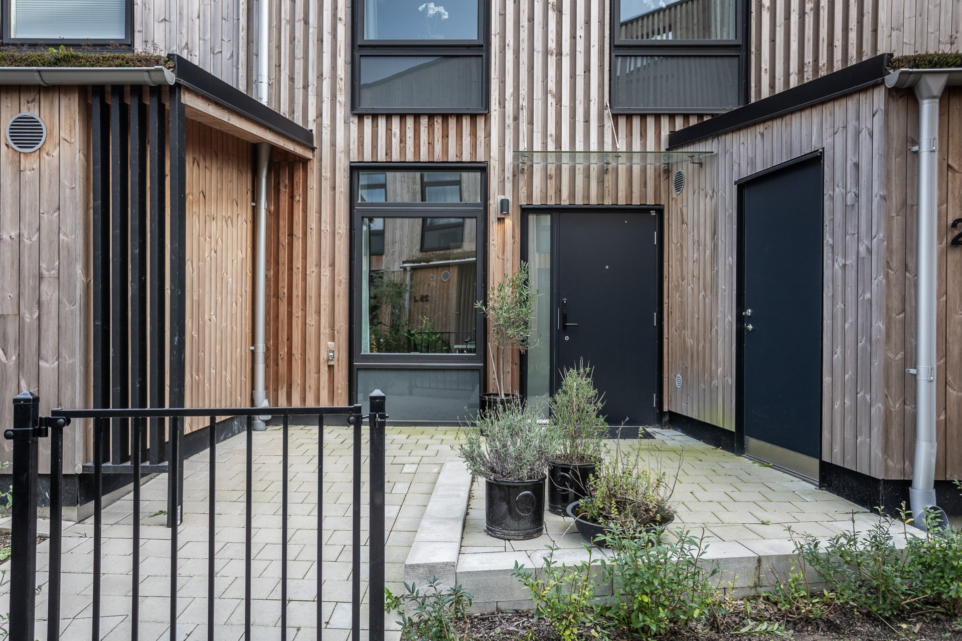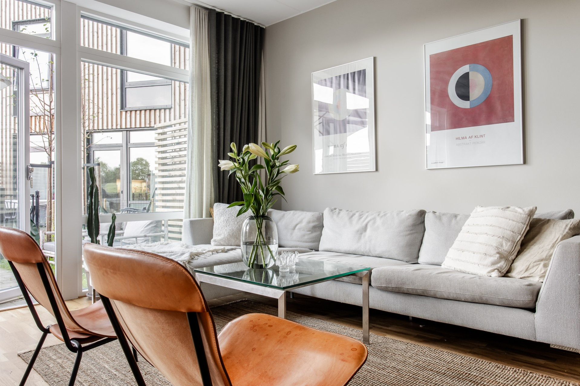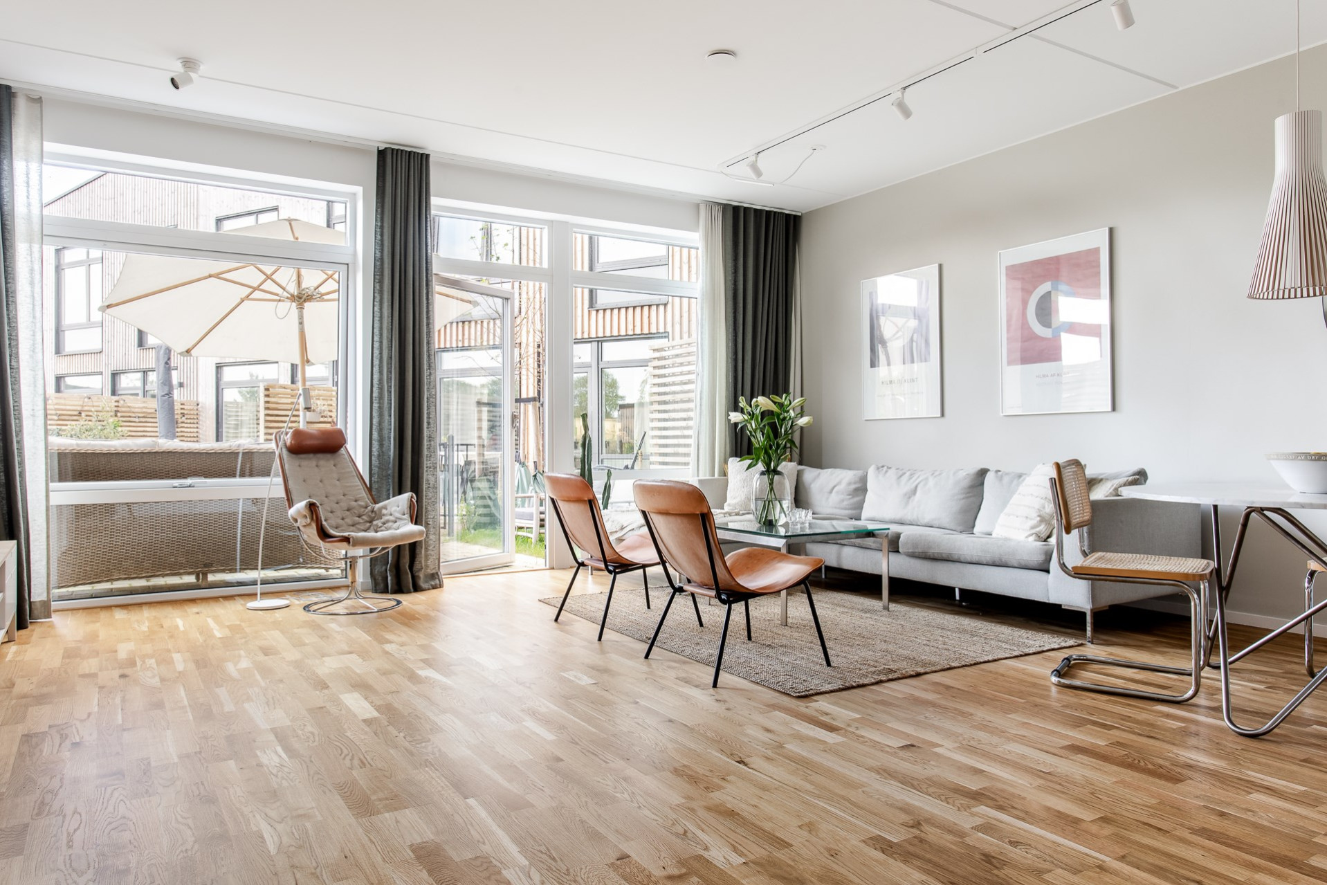 Vardagsrummet smälter elegant samman med köket och skapar en öppen, social yta med en takhöjd utöver det vanliga. De stora fönsterpartierna fyller rummet med ljus och ger en fantastisk känsla av rymd. Här får ni plats med en generös soffgrupp, soffbord, matbord och annat möblemang om så önskas. Från vardagsrummet har ni direkt utgång till en av bostadens uteplatser som blir en förlängning av vardagsrummet under varma sommardagar. Här kan ni sitta och avnjuta en god middag med vänner och familj. Väggarna går i en varm behaglig ton.