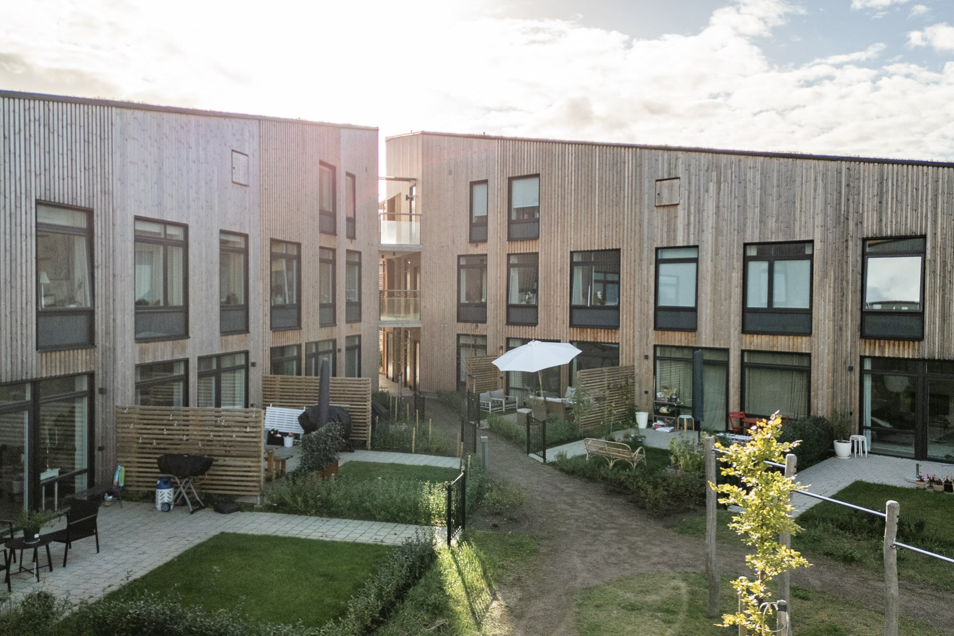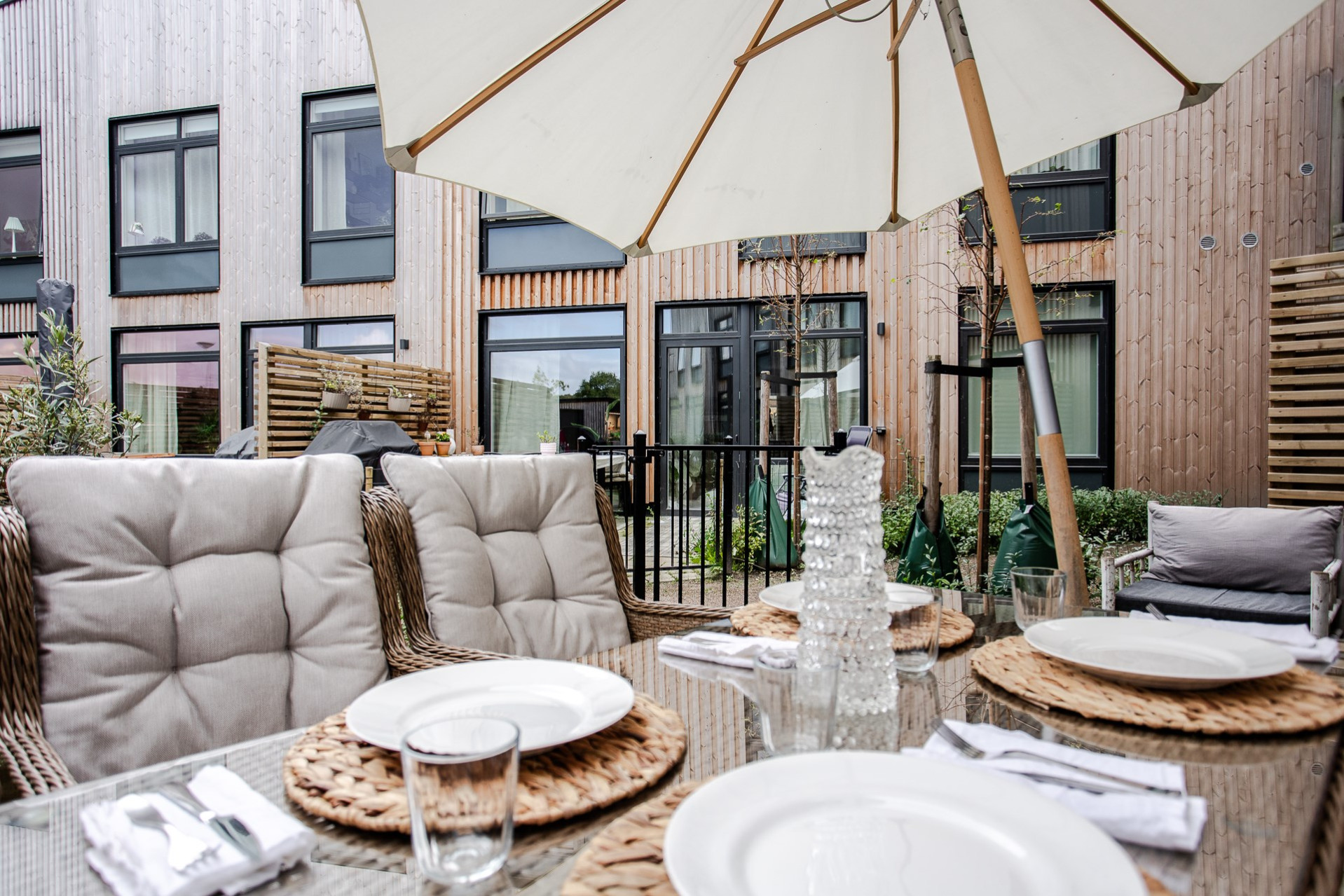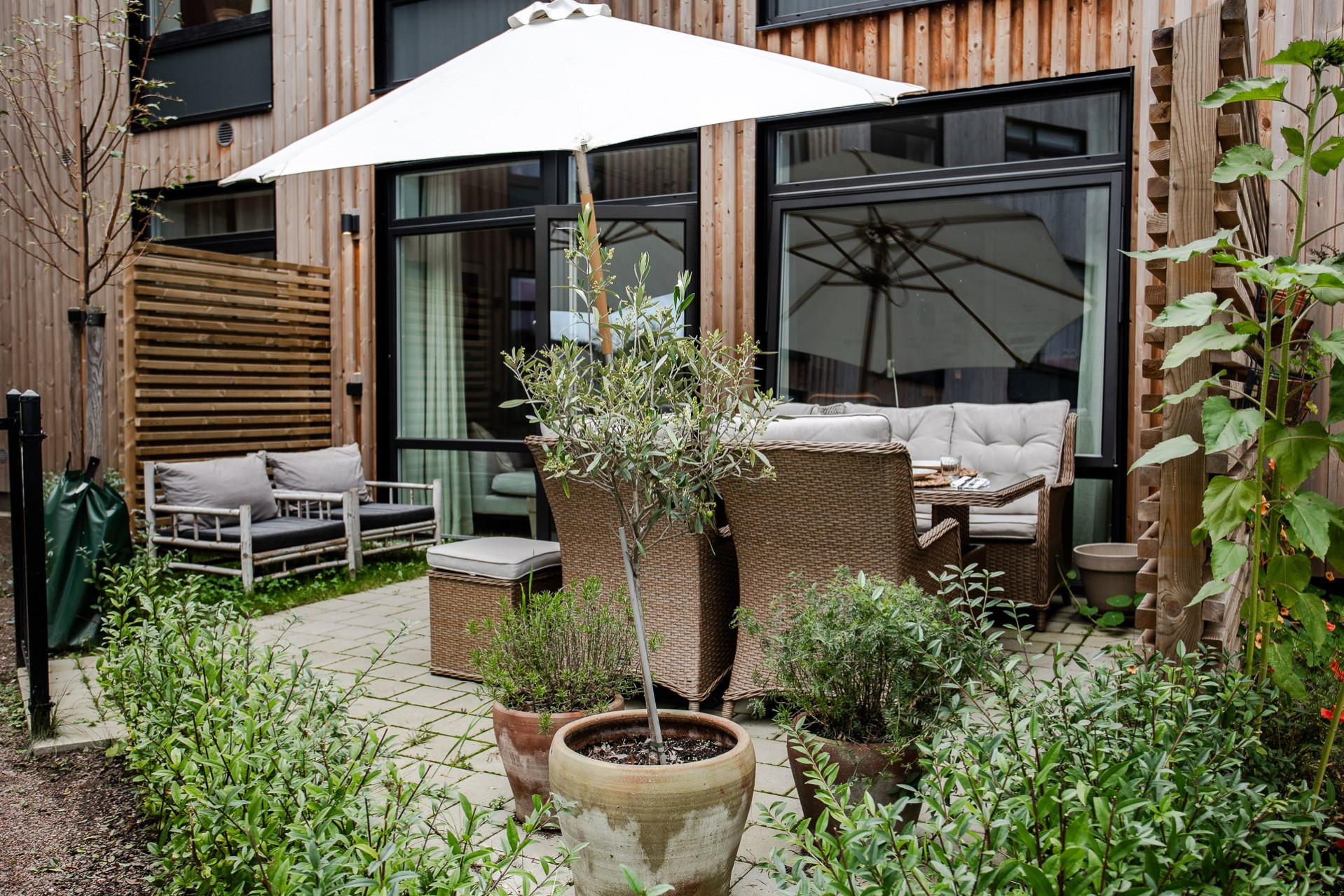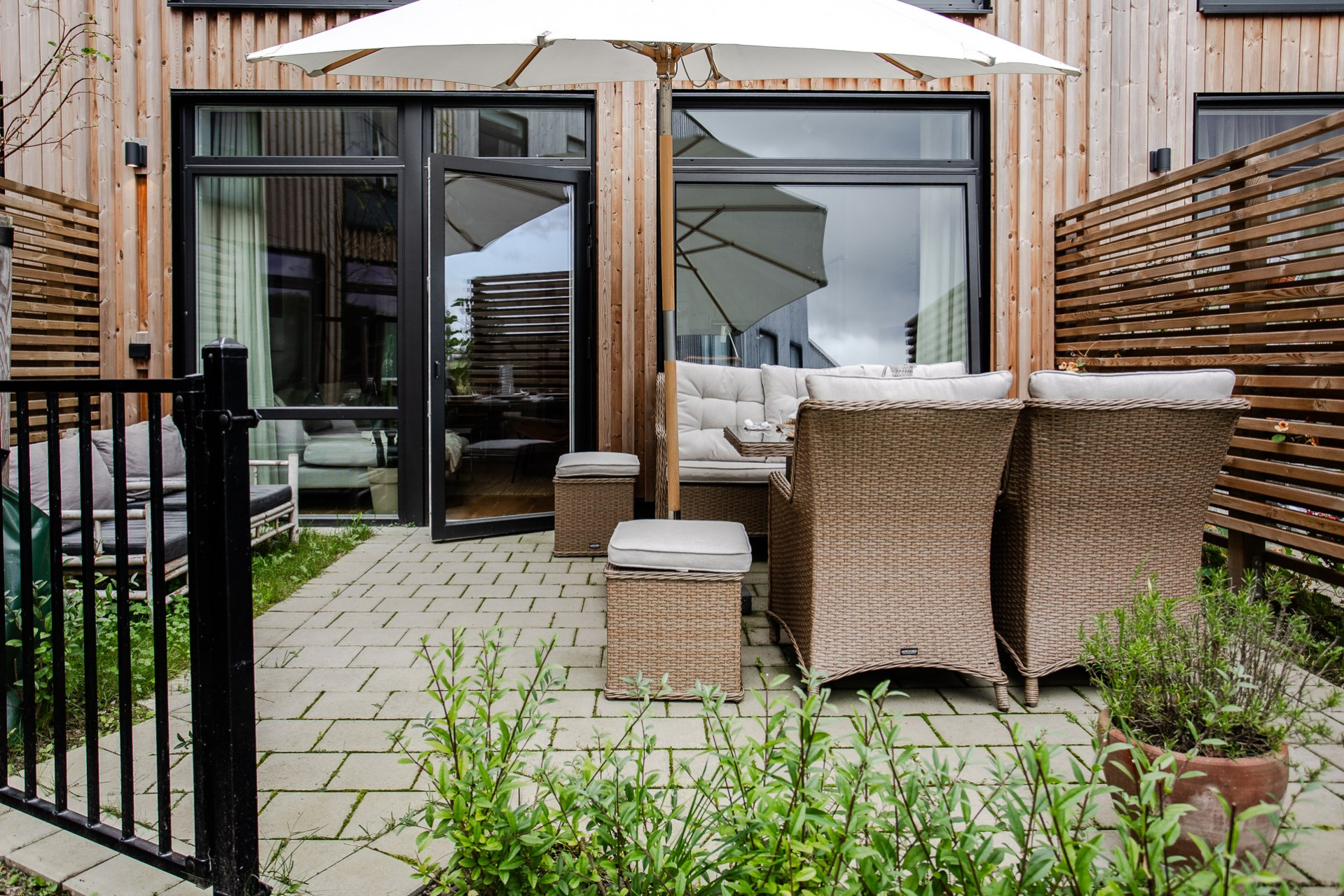 Vardagsrummet smälter elegant samman med köket och skapar en öppen, social yta med en takhöjd utöver det vanliga. De stora fönsterpartierna fyller rummet med ljus och ger en fantastisk känsla av rymd. Här får ni plats med en generös soffgrupp, soffbord, matbord och annat möblemang om så önskas. Från vardagsrummet har ni direkt utgång till en av bostadens uteplatser som blir en förlängning av vardagsrummet under varma sommardagar. Här kan ni sitta och avnjuta en god middag med vänner och familj. Väggarna går i en varm behaglig ton.