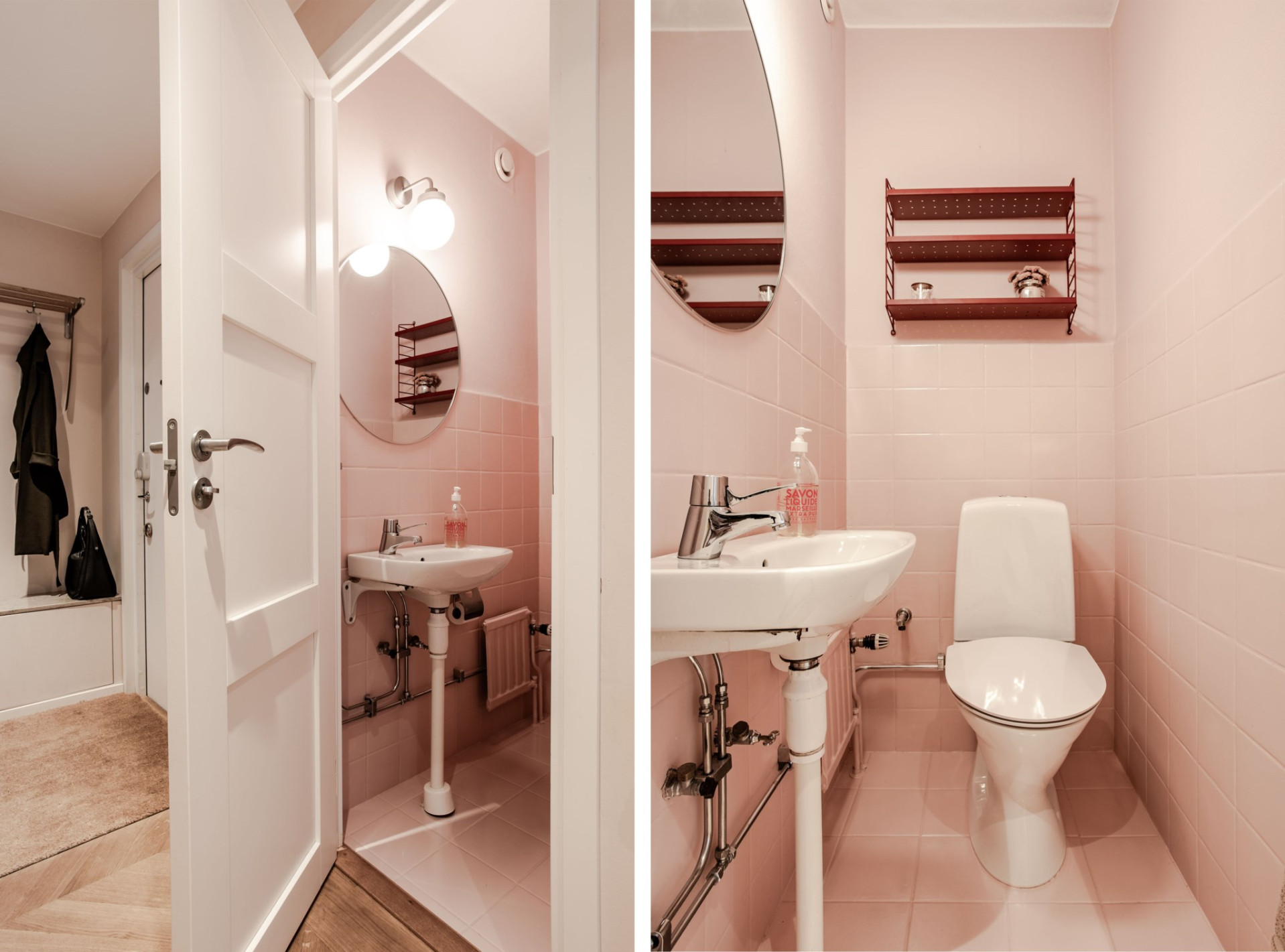 Vid entréhallen finns praktisk gäst-wc med handfat och toalett.