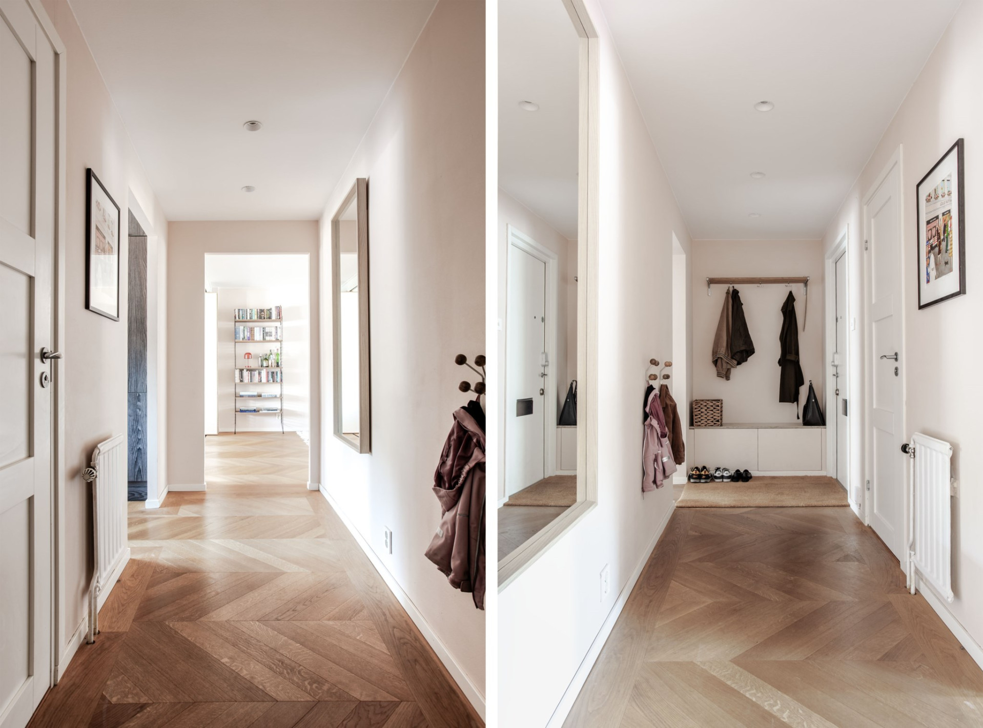 Golvet i hallen är ett snyggt parkettgolv i franskt mönster, vilket det även är genomgående i lägenhetens resterande gemensamma utrymmen.