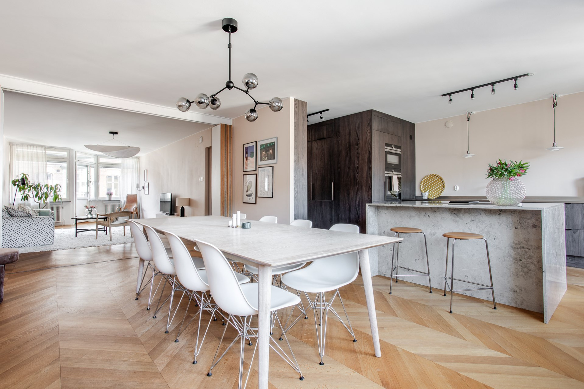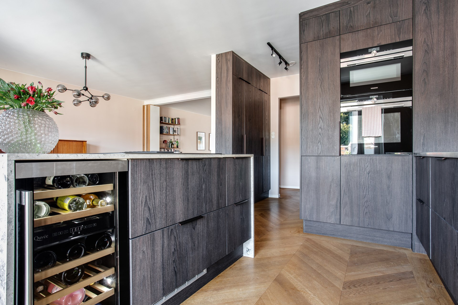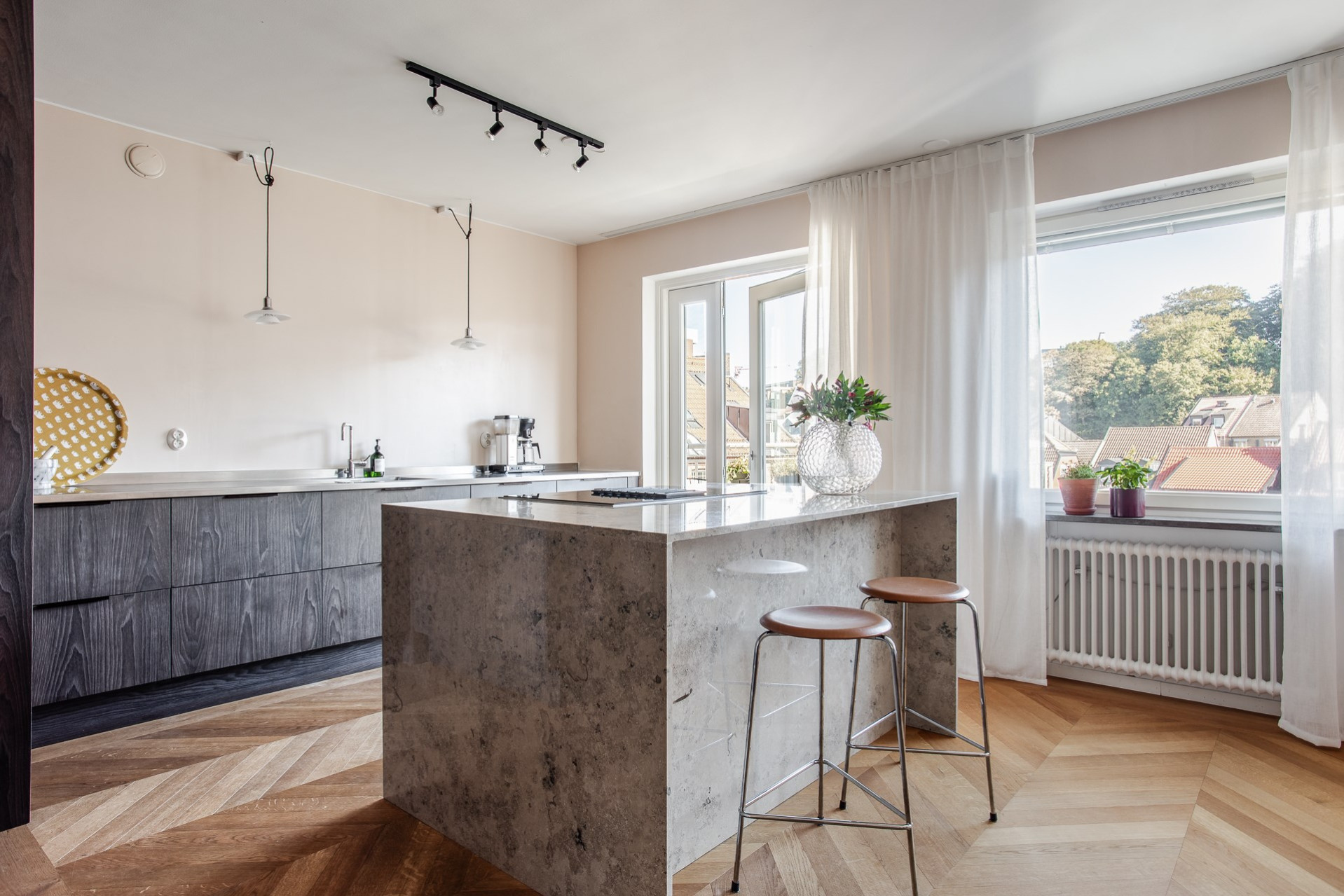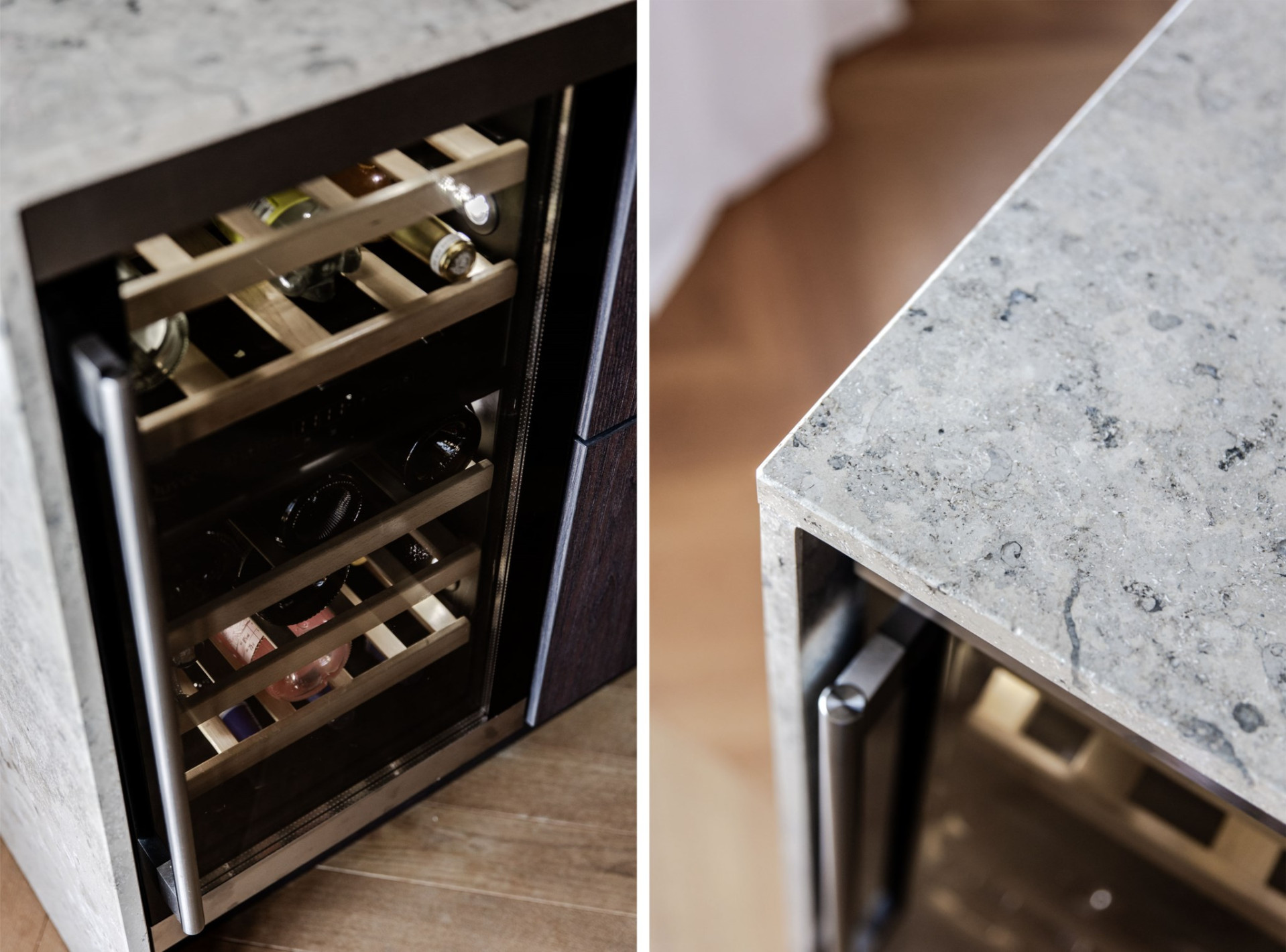 Mot köket delas ytan av genom den väl tilltagna köksön som både innehåller induktionshäll, förvaring och vinkyl. Här samlas gärna gästerna för kvällens fördrink innan sittning!