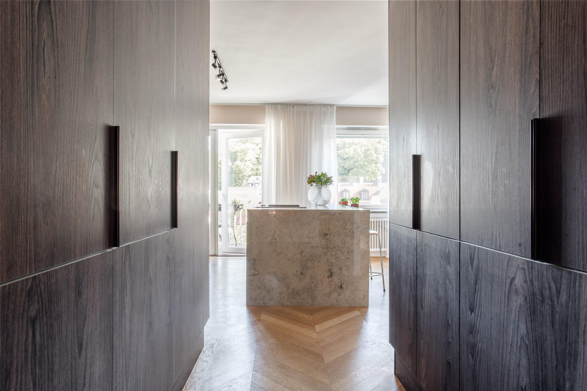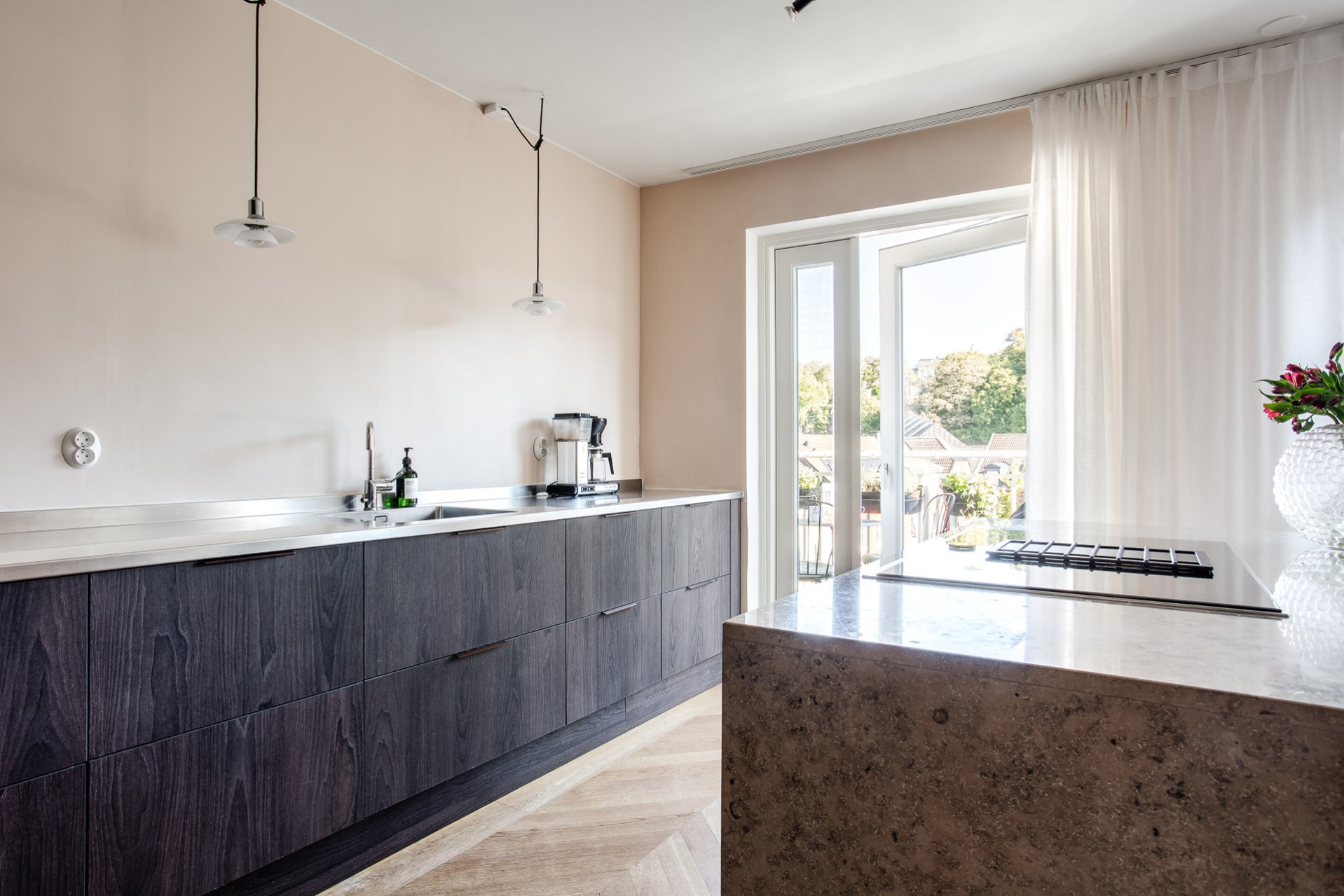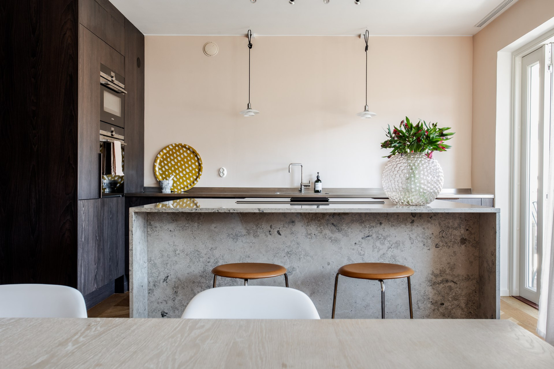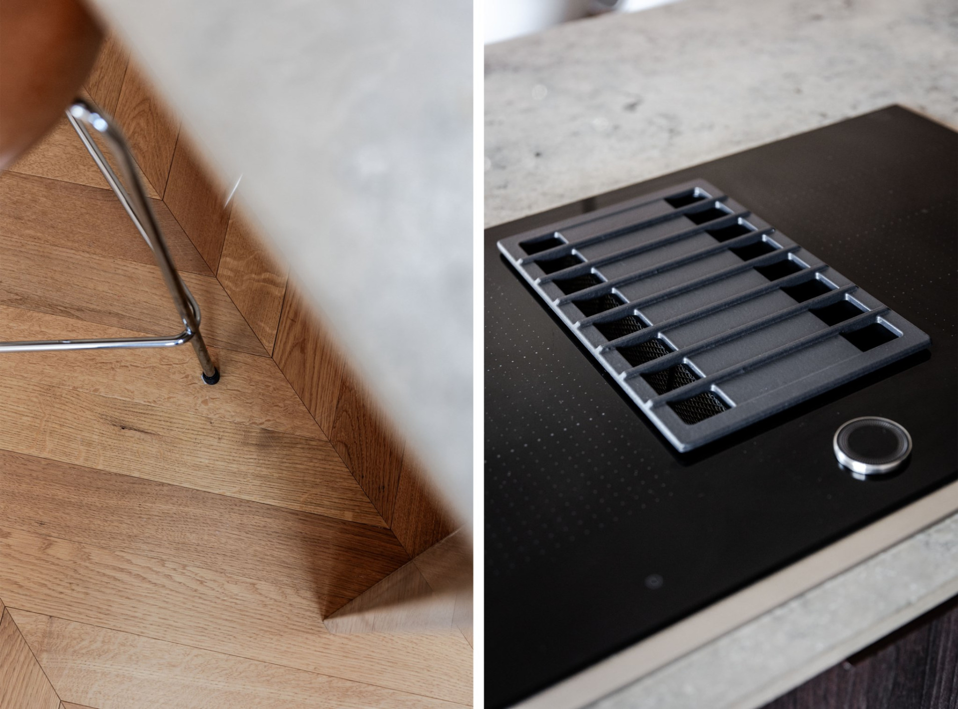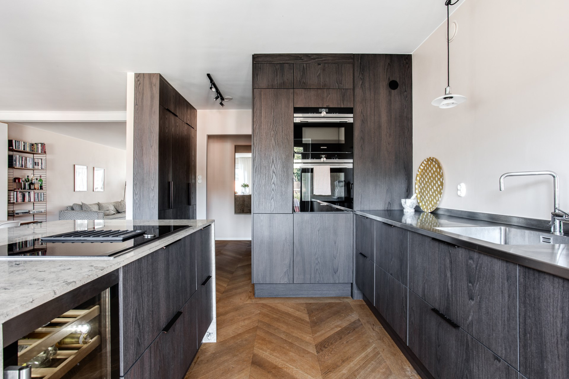 Mot köket delas ytan av genom den väl tilltagna köksön som både innehåller induktionshäll, förvaring och vinkyl. Här samlas gärna gästerna för kvällens fördrink innan sittning!