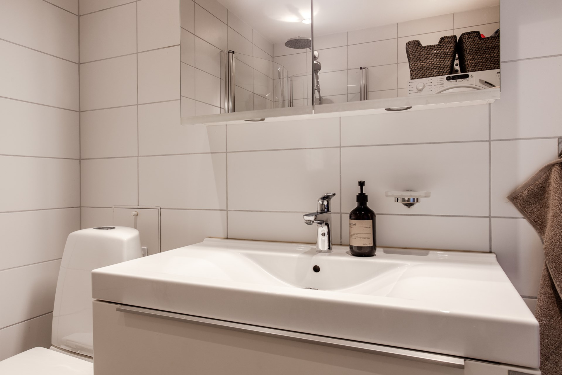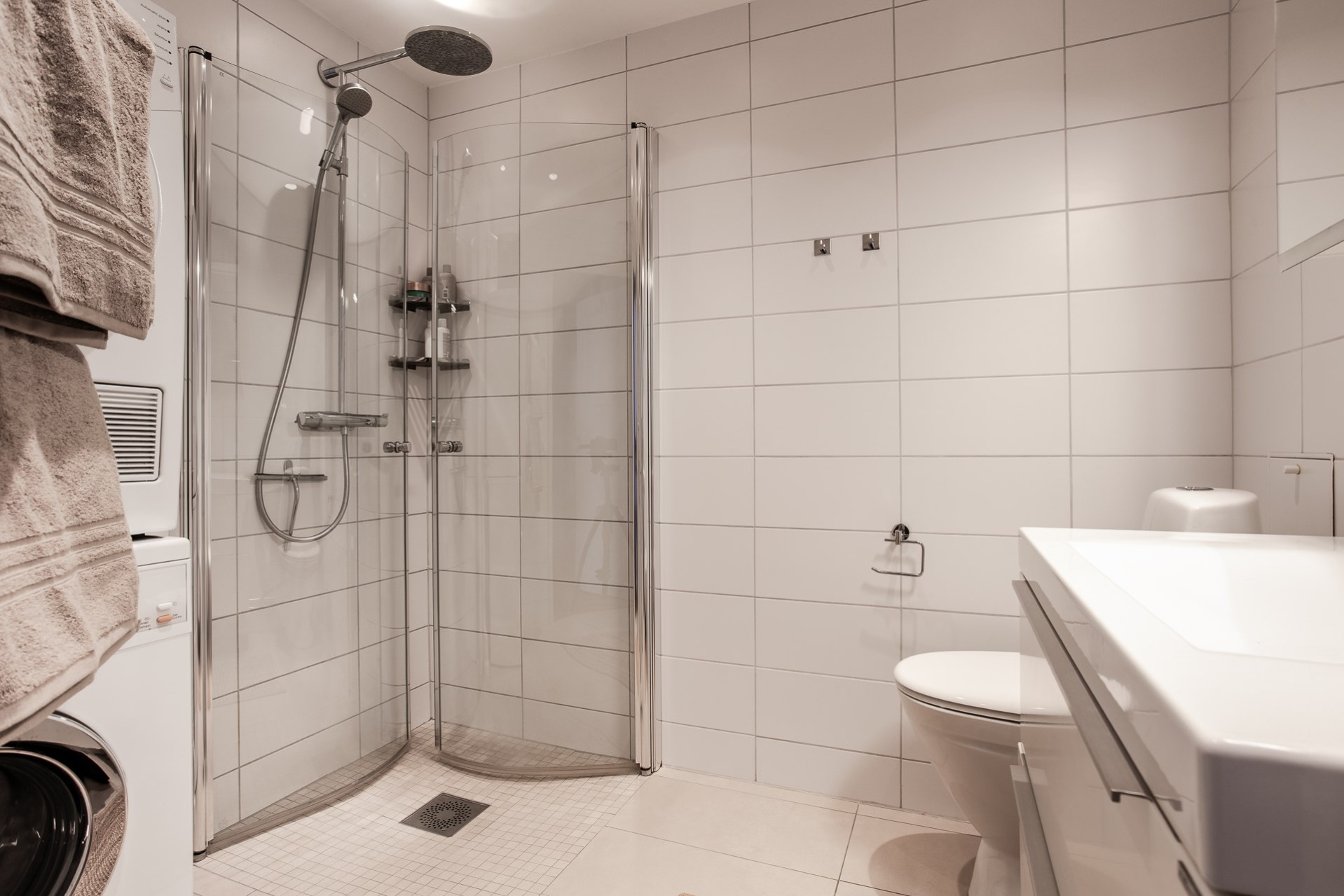 Stort och helkaklat badrum från 2014 (enligt uppgift från föregående ägare) i ljusa färger med dusch, handfat och wc. Badrummet är även utbyggt åt ena hållet för att få plats till tvättmaskin, torktumlare och en ordentlig dusch.