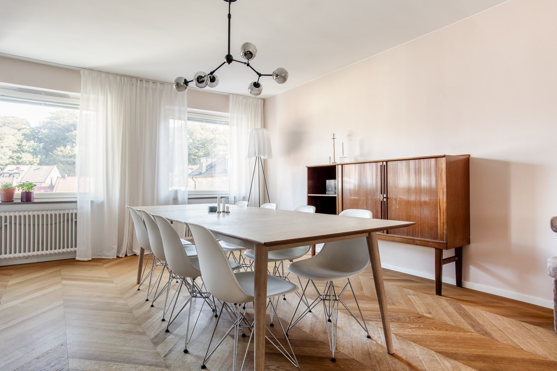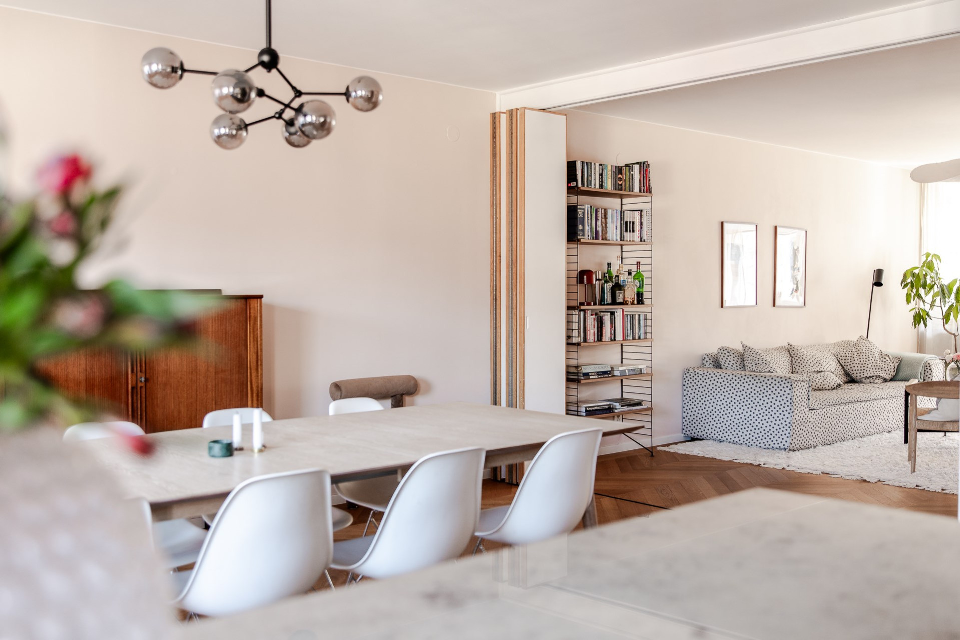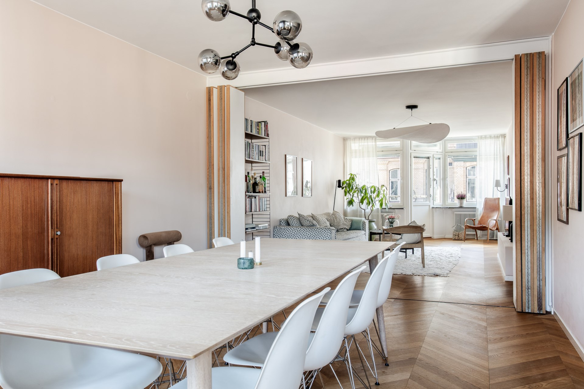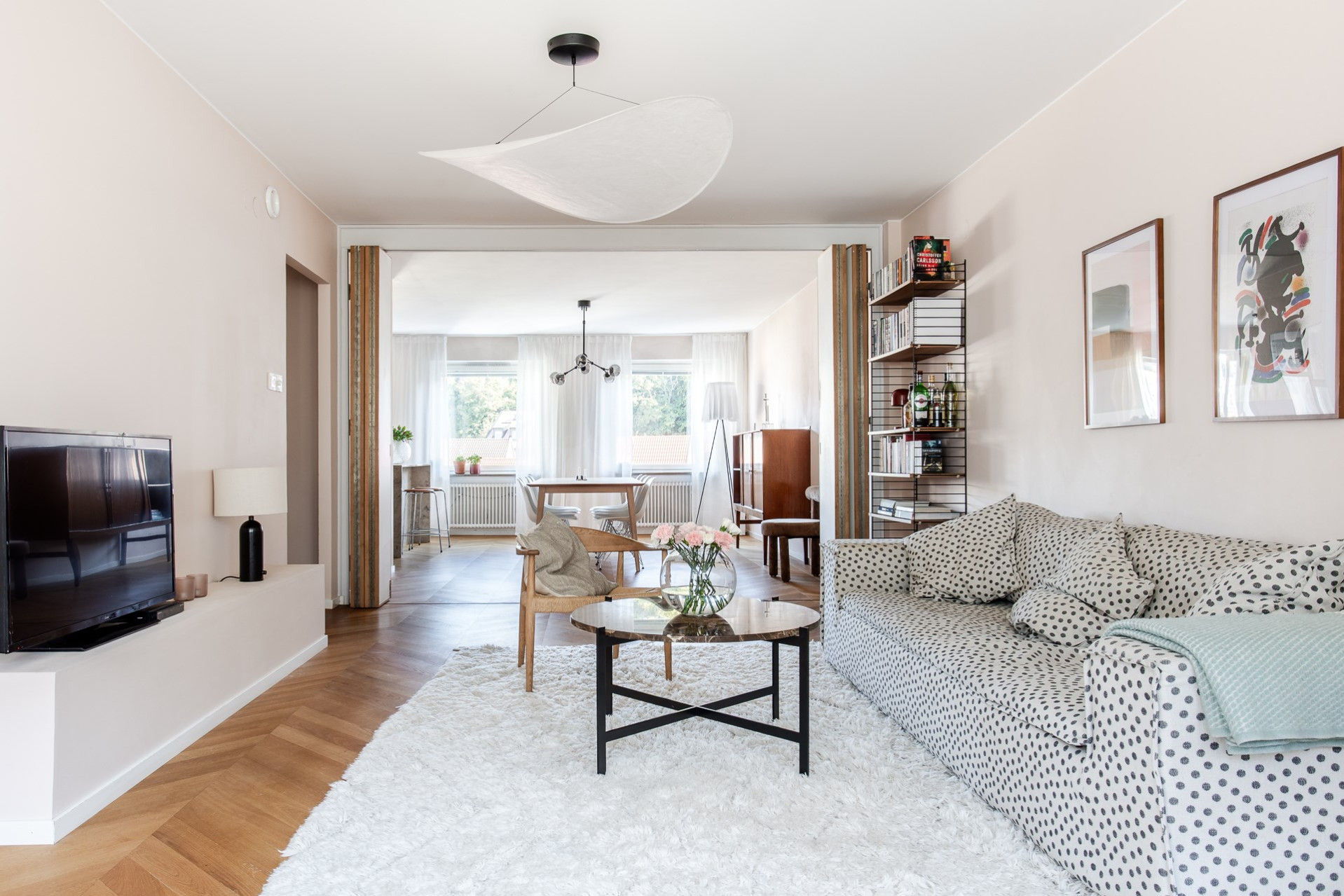 Härligt stort och luftigt rum i öppen planlösning mot matrummet. Mellan rummen finns den ursprungliga vikväggen fortfarande kvar. En rolig detalj som även tillför praktisk användning för att kunna dela av ytorna då man är större sällskap.