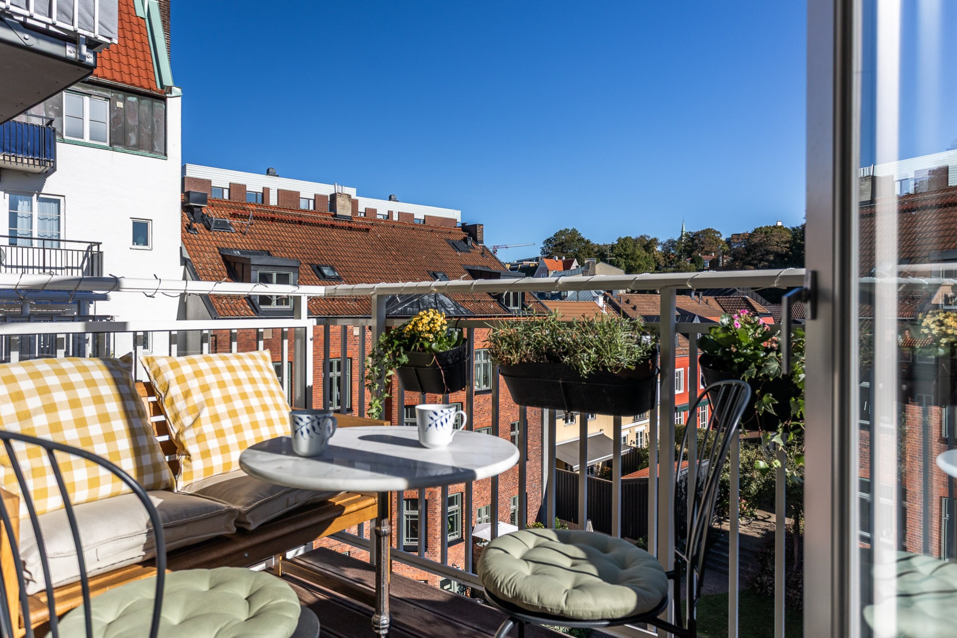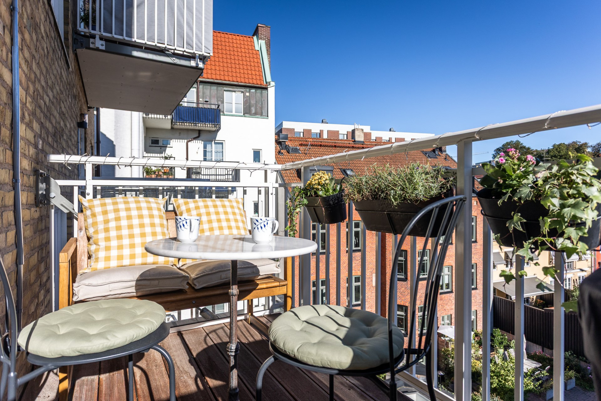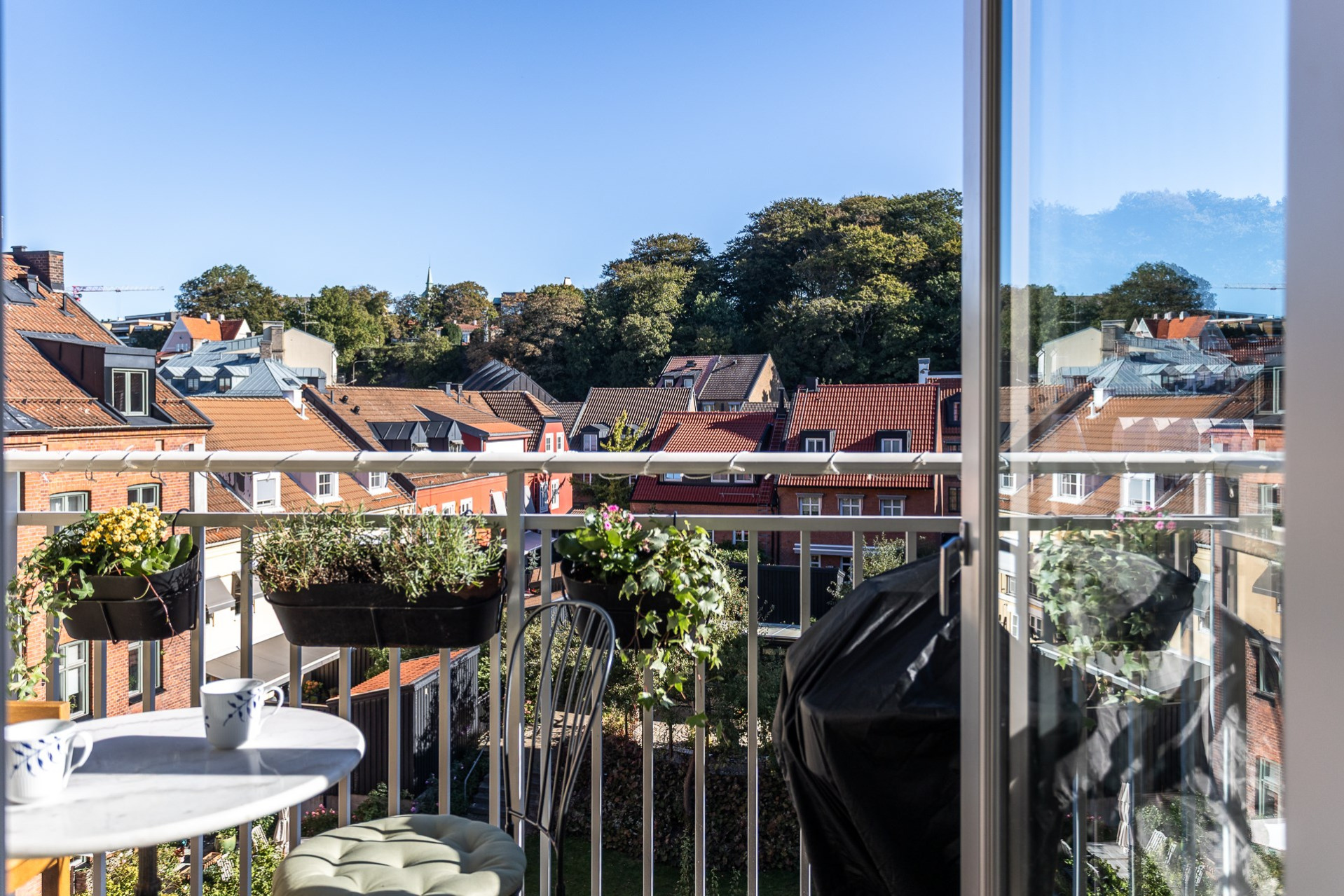 Vid köket finns utgången till lägenhetens andra balkong, denna är helt nybyggd för året och är även större än originalbalkongen, härifrån har man en härlig vy över den välskötta innergården och Landborgens grönska i nästa kvarter!