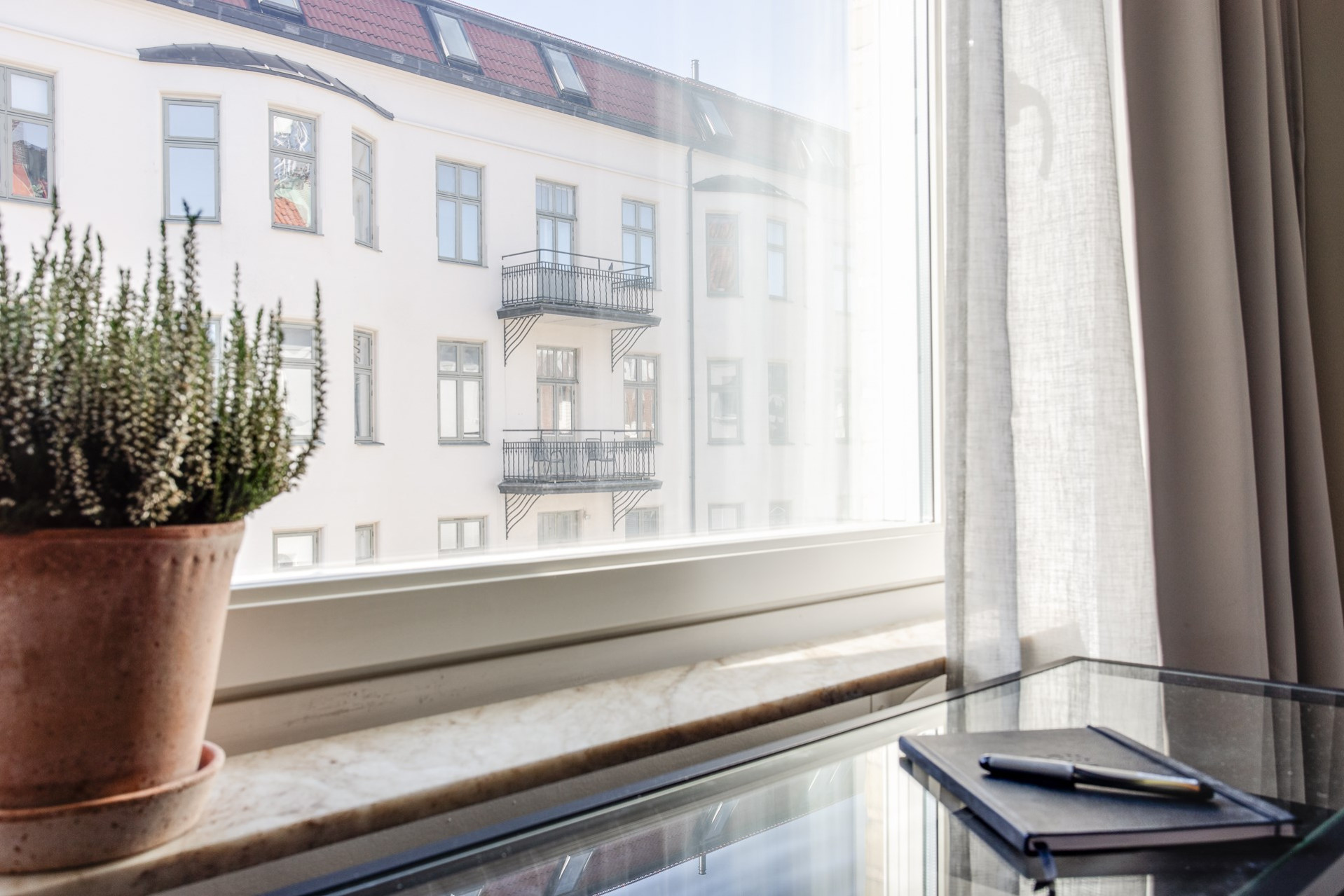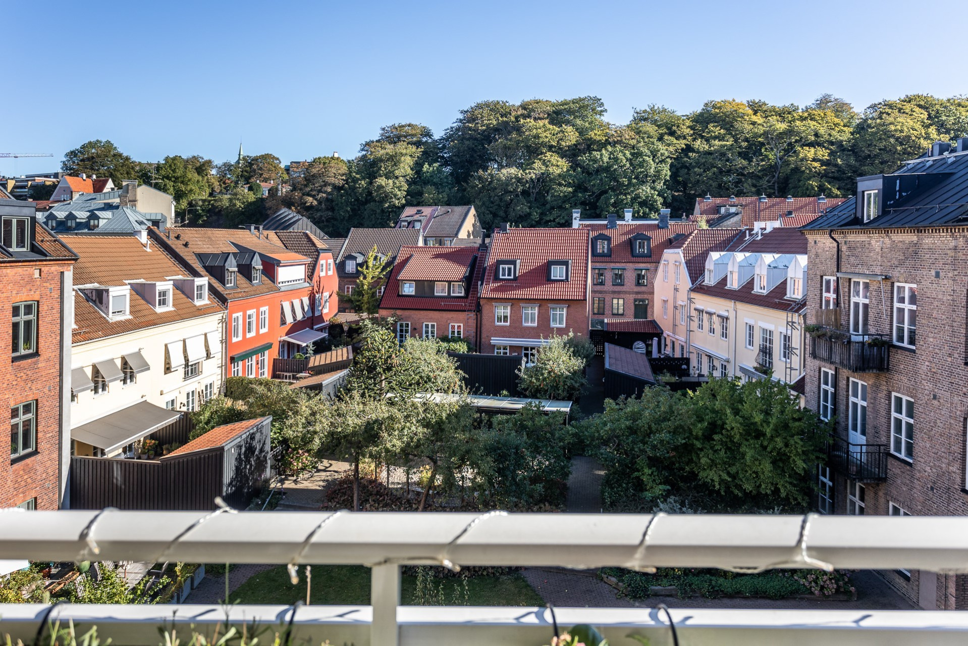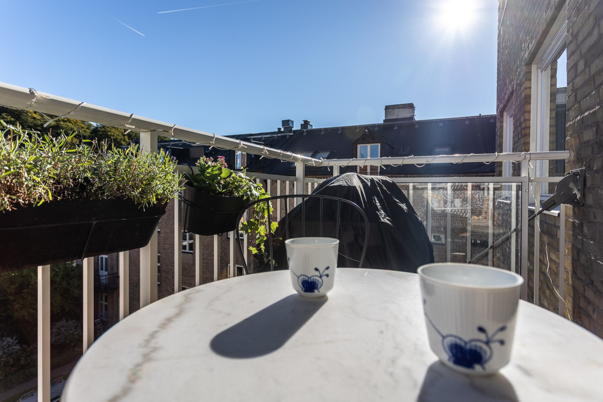 Vid köket finns utgången till lägenhetens andra balkong, denna är helt nybyggd för året och är även större än originalbalkongen, härifrån har man en härlig vy över den välskötta innergården och Landborgens grönska i nästa kvarter!