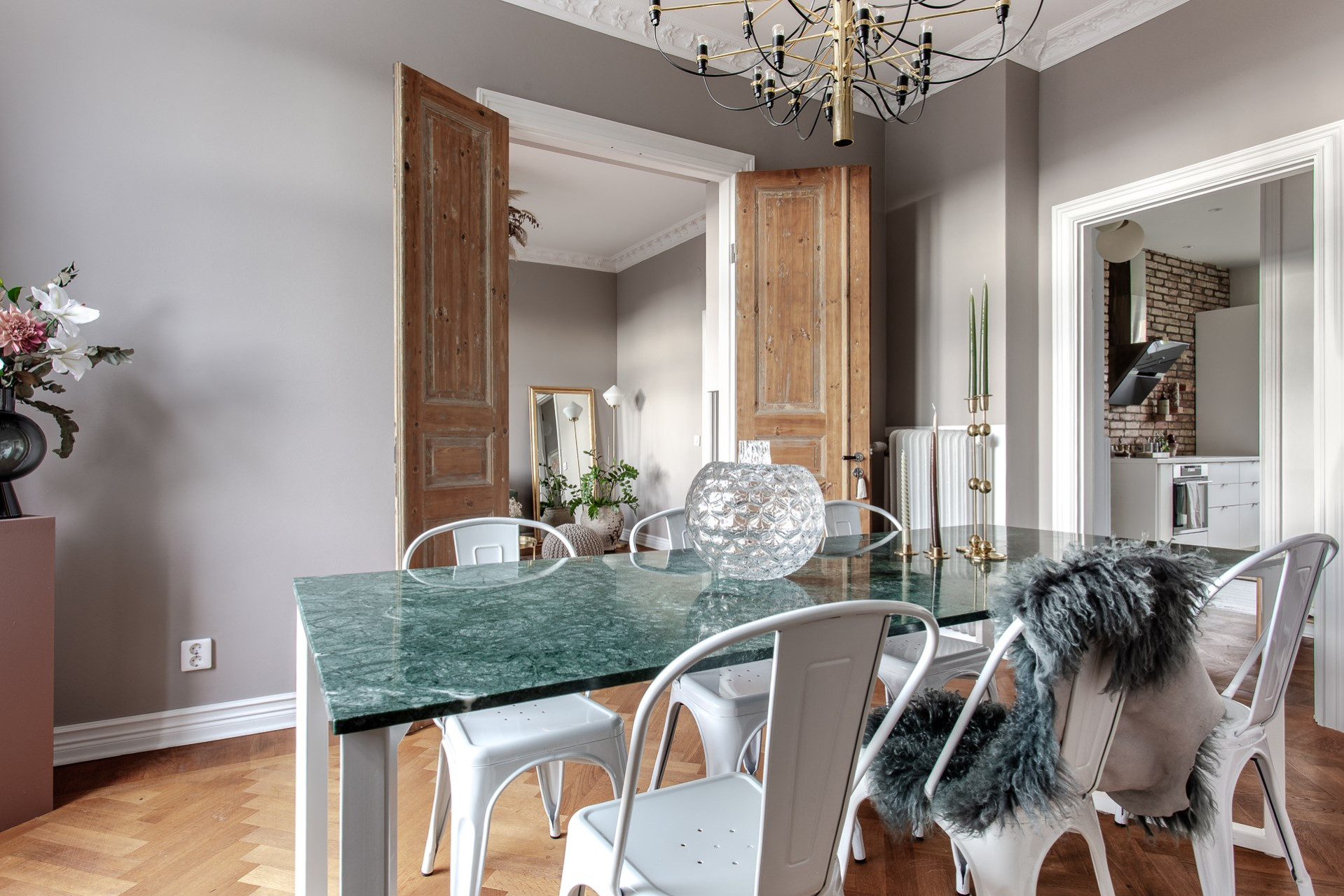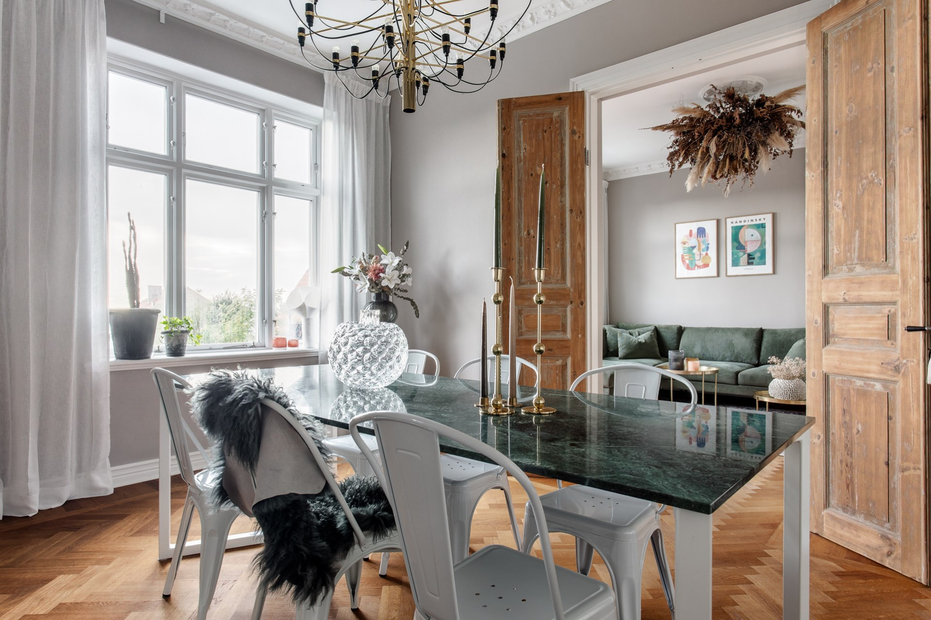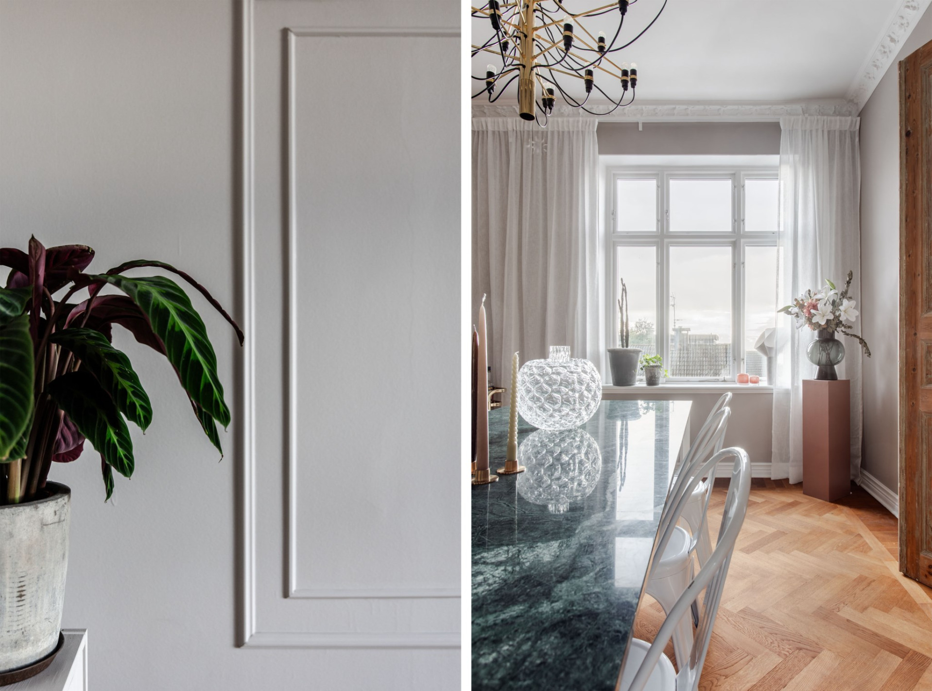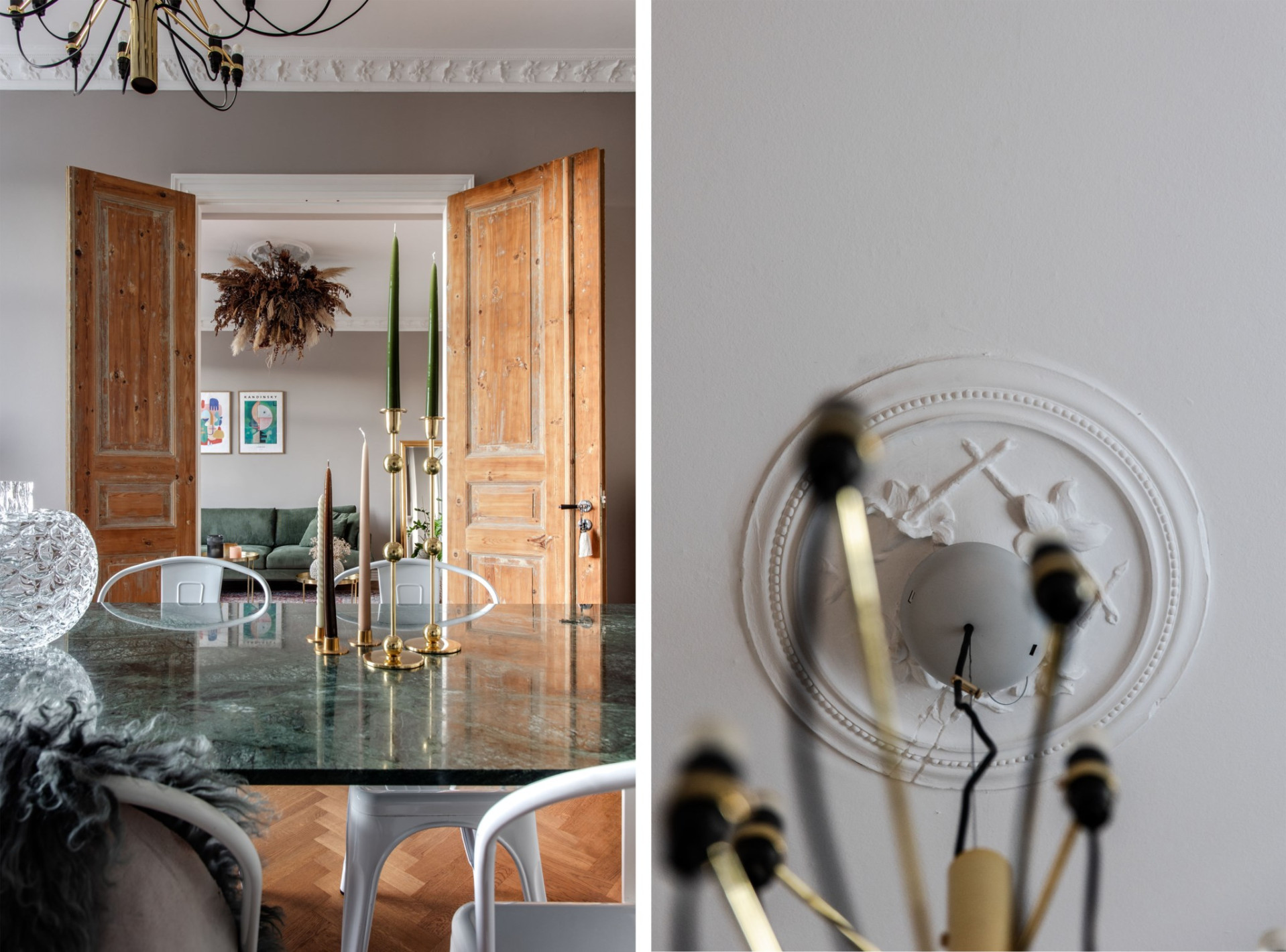 Generösa spröjsade fönster och pardörrar ut till balkongen gör att dessa rum får ett magiskt ljusinsläpp. Sekelskiftesdetaljer är många och vackra. Här finns det plats för en rejäl soffgrupp och matsalen inrymmer matbord för 8-10 personer. Genomgående fiskbensparkett som sträcker sig vidare in i matsalen. Snygg platsbyggd hylla.