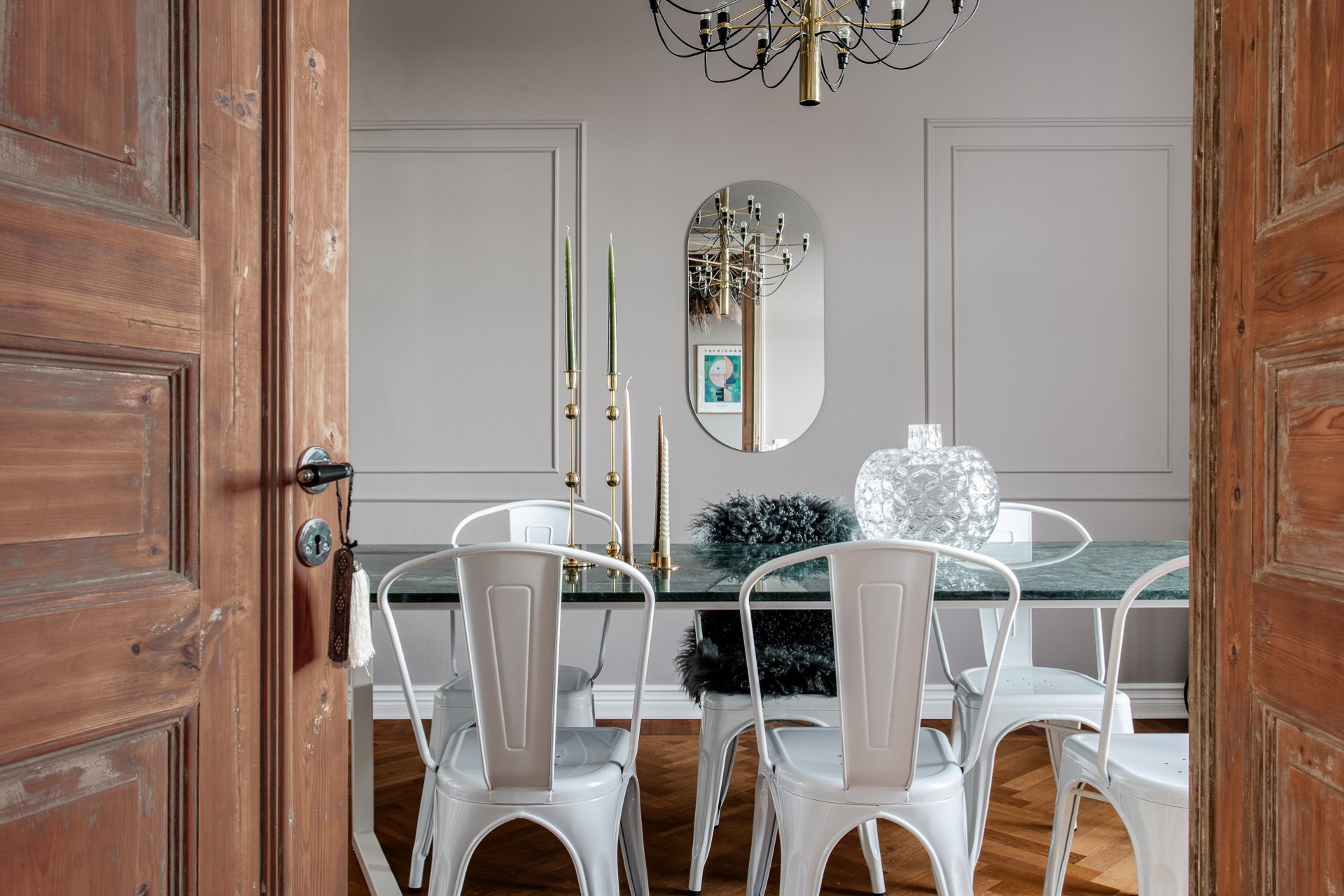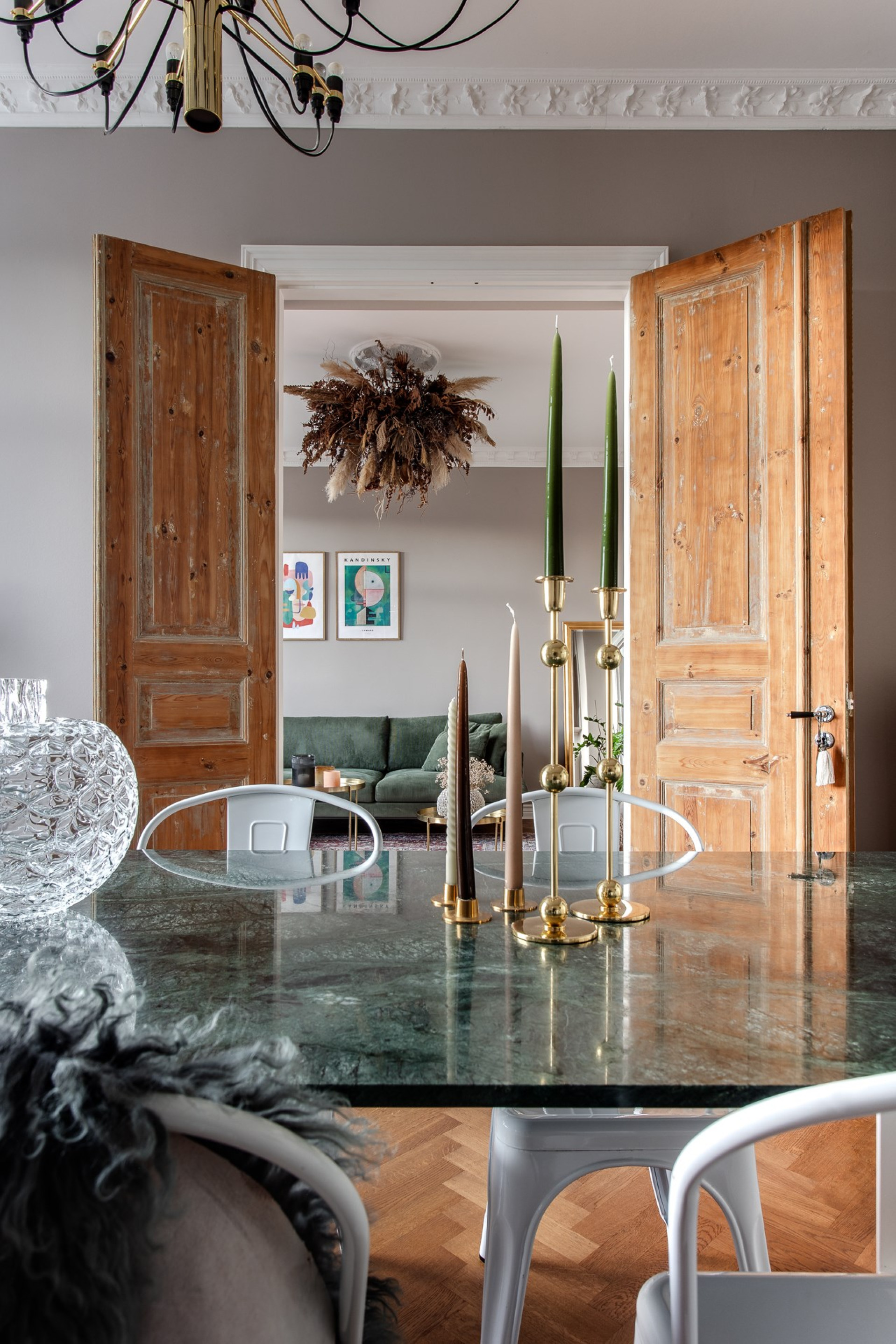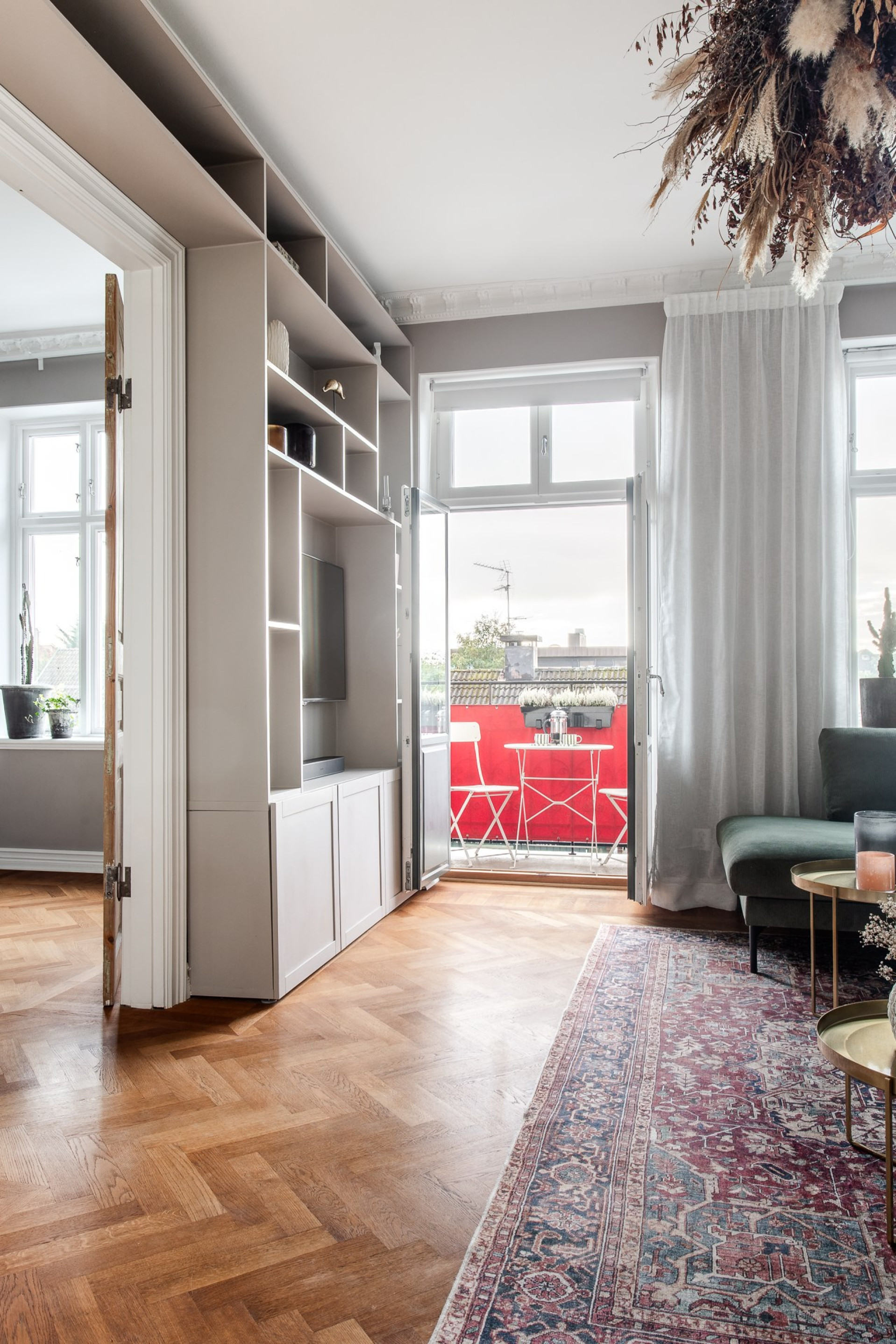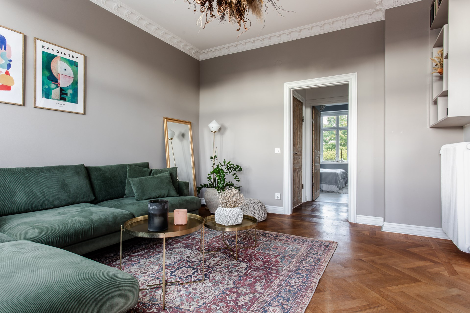 Generösa spröjsade fönster och pardörrar ut till balkongen gör att dessa rum får ett magiskt ljusinsläpp. Sekelskiftesdetaljer är många och vackra. Här finns det plats för en rejäl soffgrupp och matsalen inrymmer matbord för 8-10 personer. Genomgående fiskbensparkett som sträcker sig vidare in i matsalen. Snygg platsbyggd hylla.