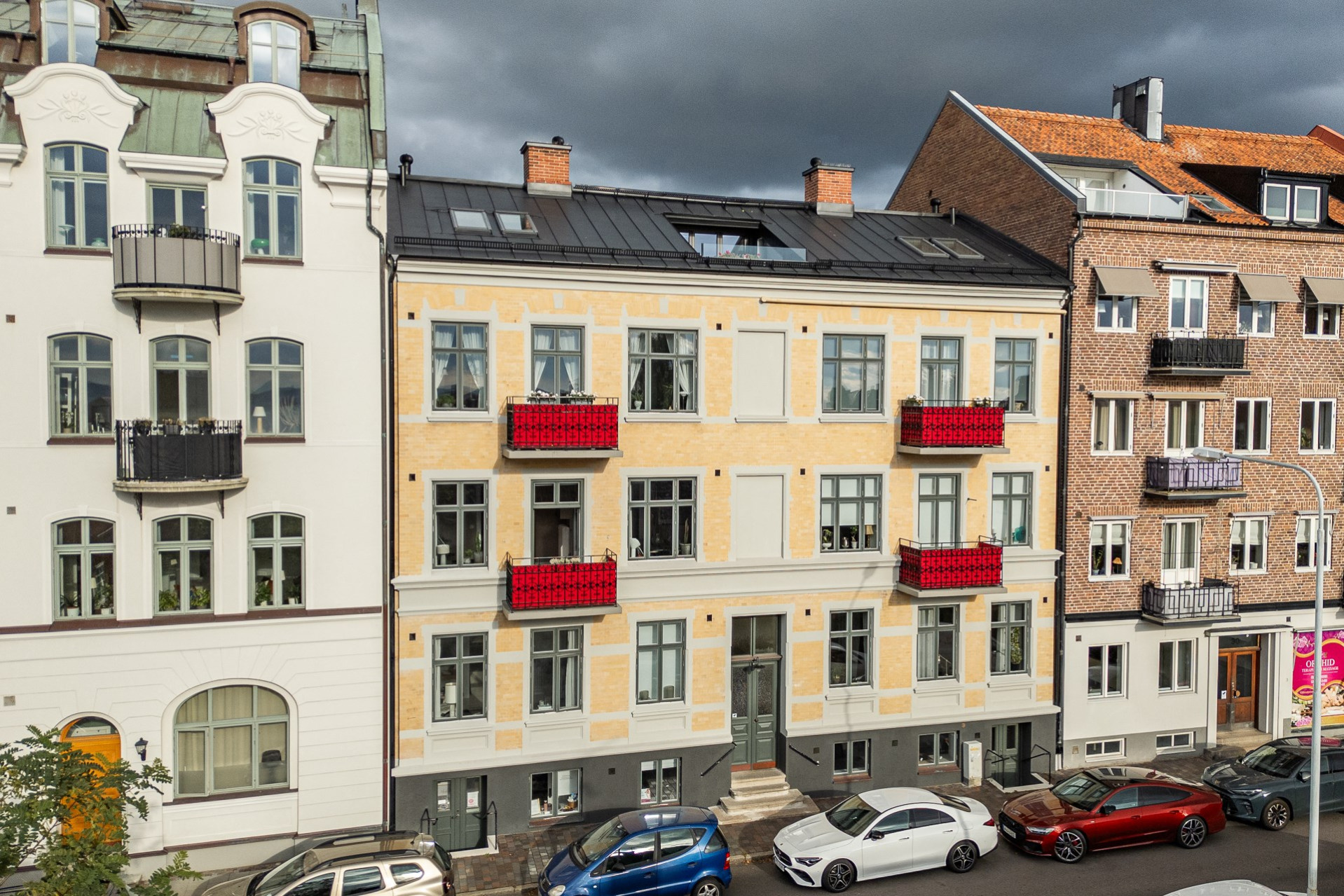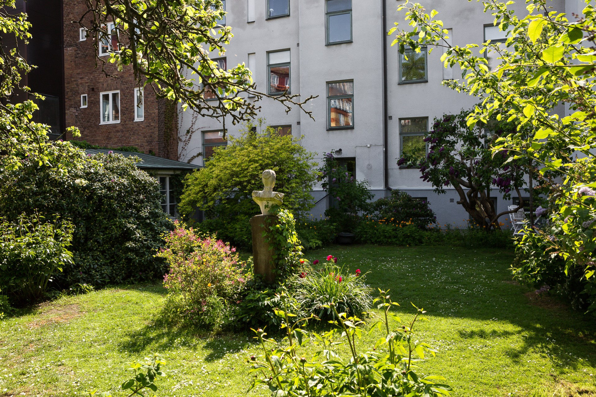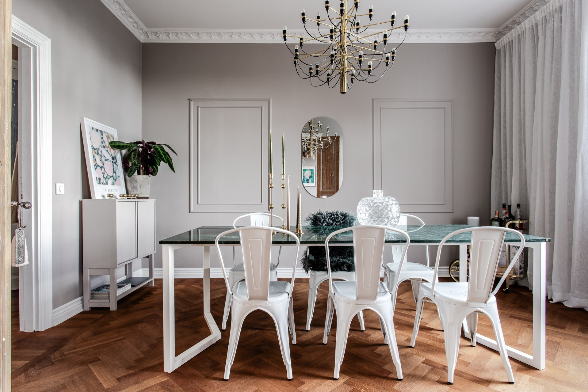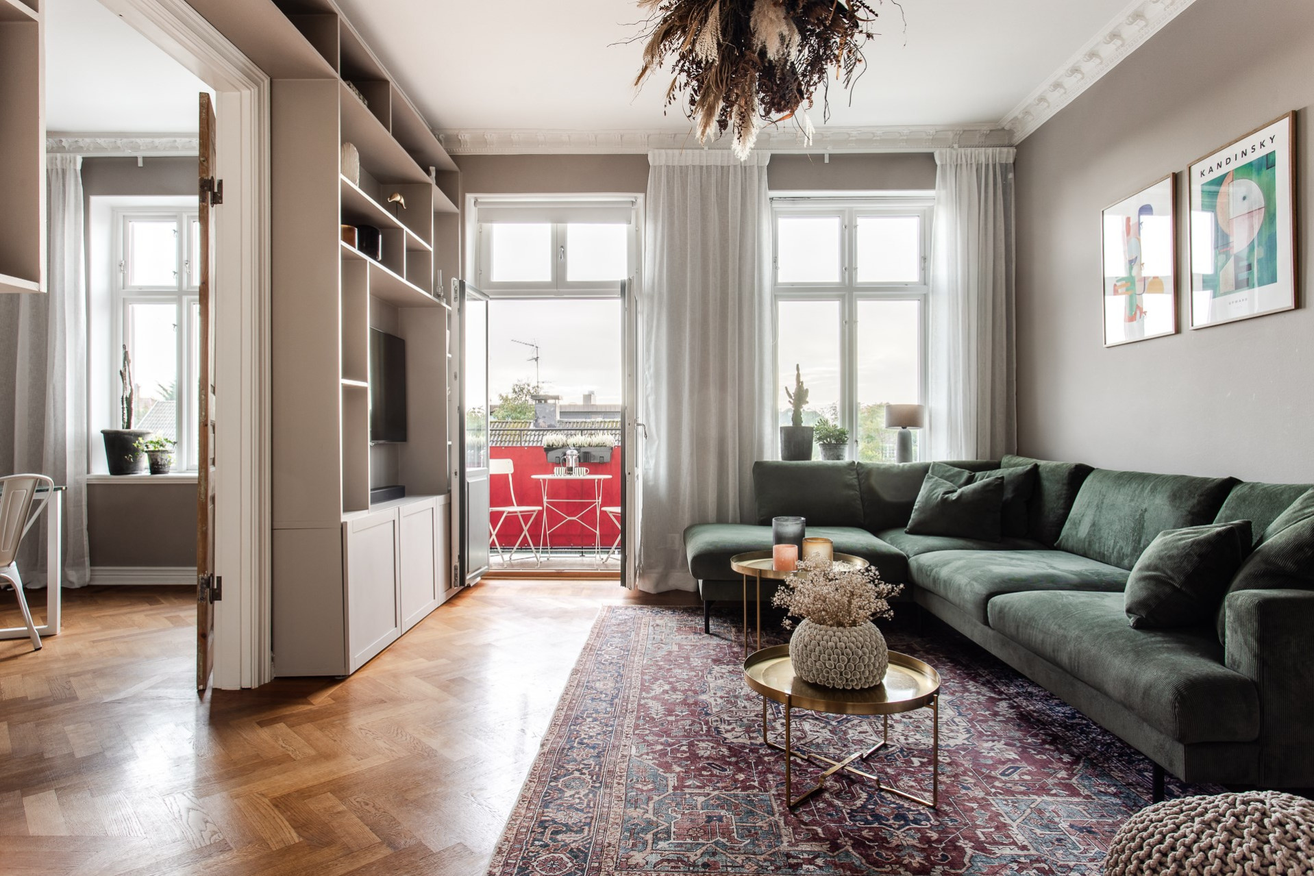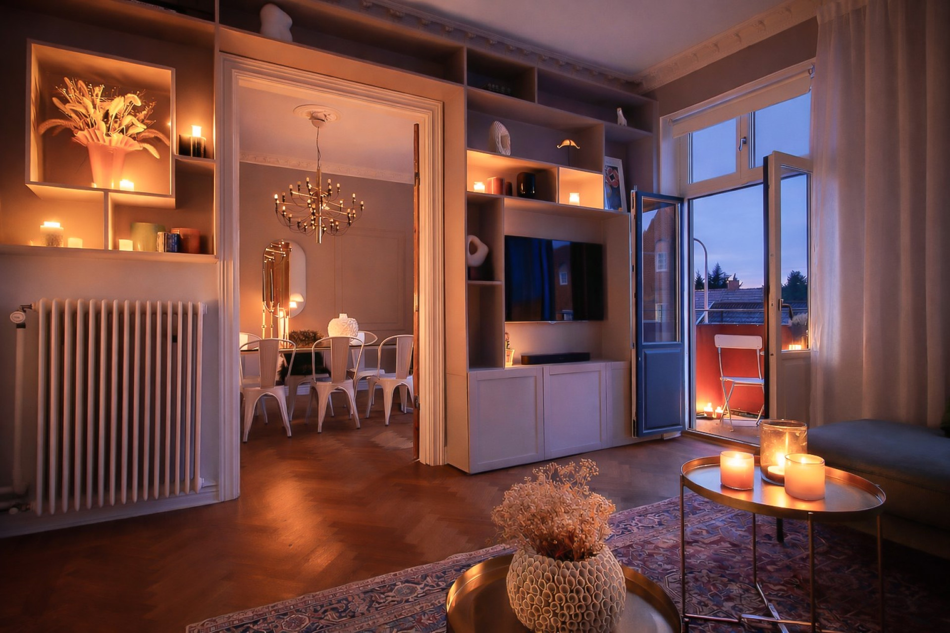 Generösa spröjsade fönster och pardörrar ut till balkongen gör att dessa rum får ett magiskt ljusinsläpp. Sekelskiftesdetaljer är många och vackra. Här finns det plats för en rejäl soffgrupp och matsalen inrymmer matbord för 8-10 personer. Genomgående fiskbensparkett som sträcker sig vidare in i matsalen. Snygg platsbyggd hylla.