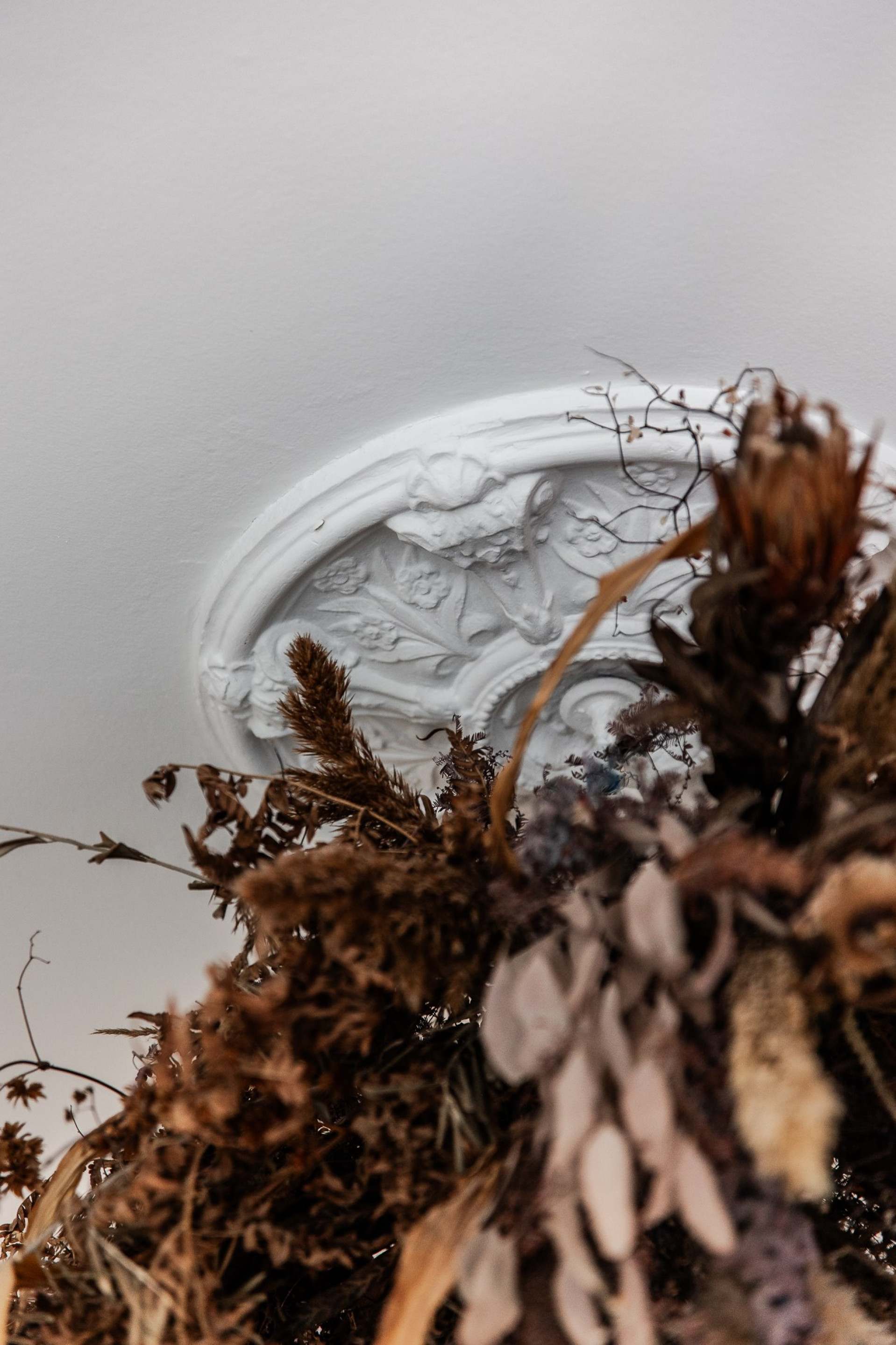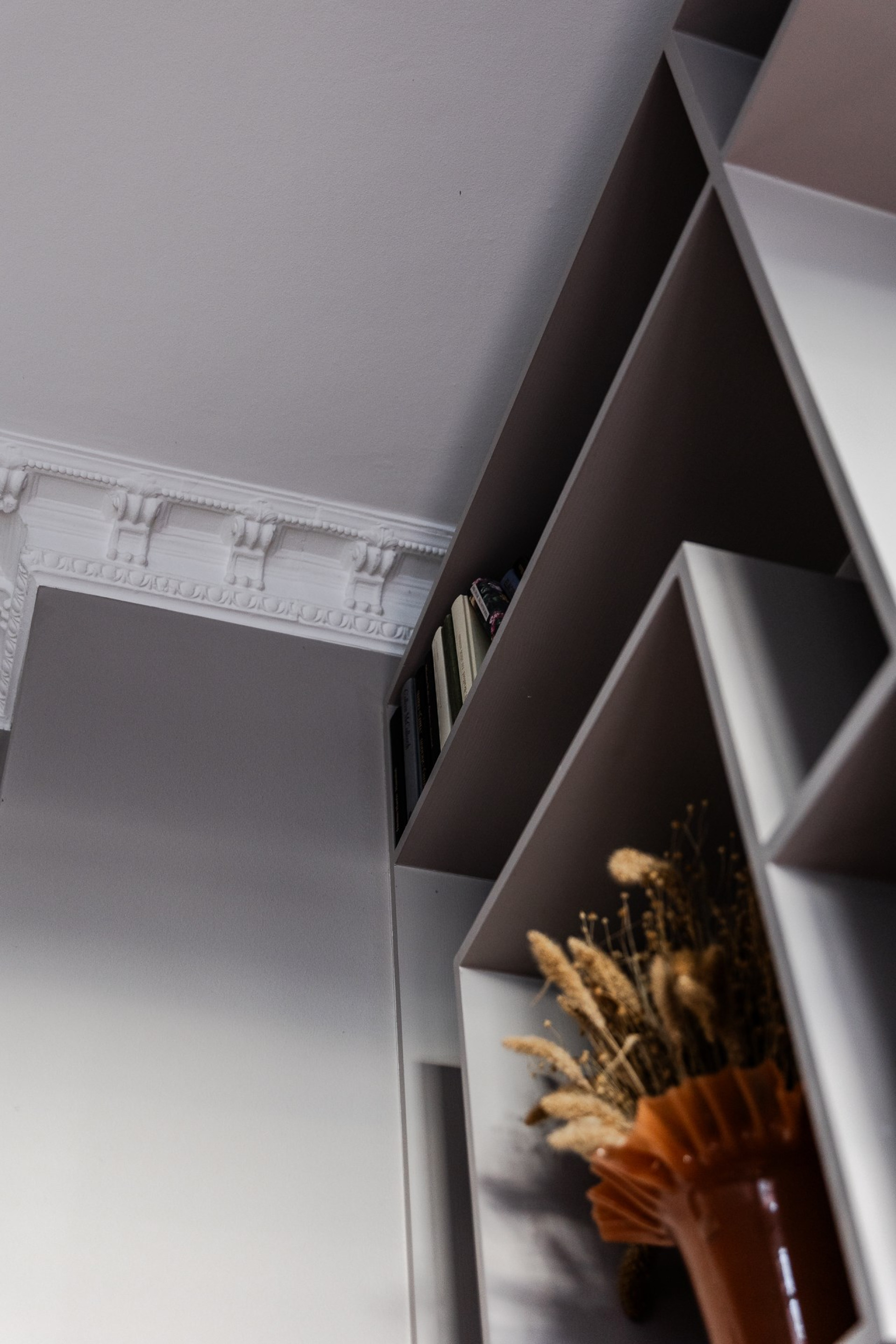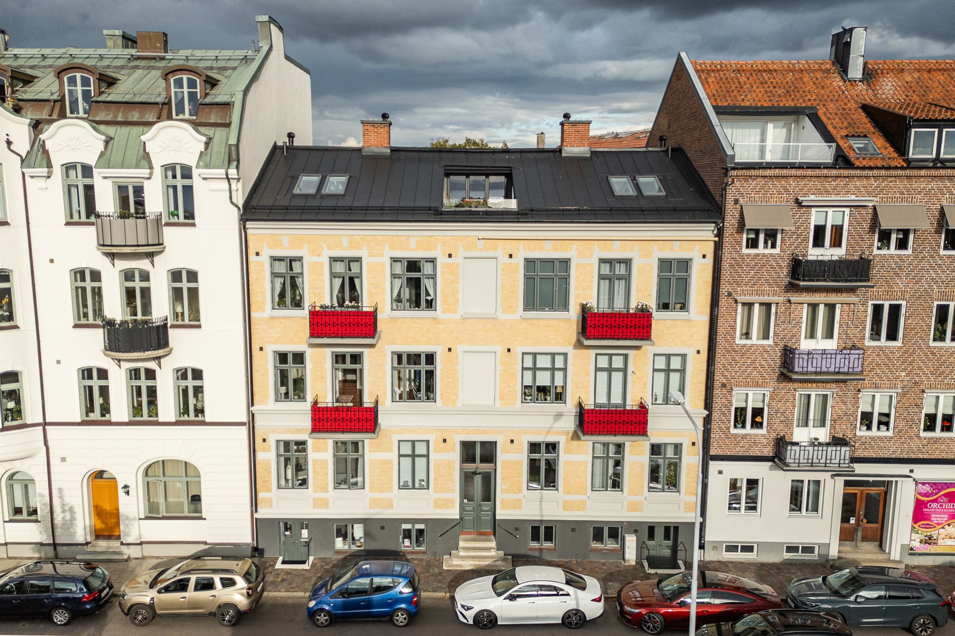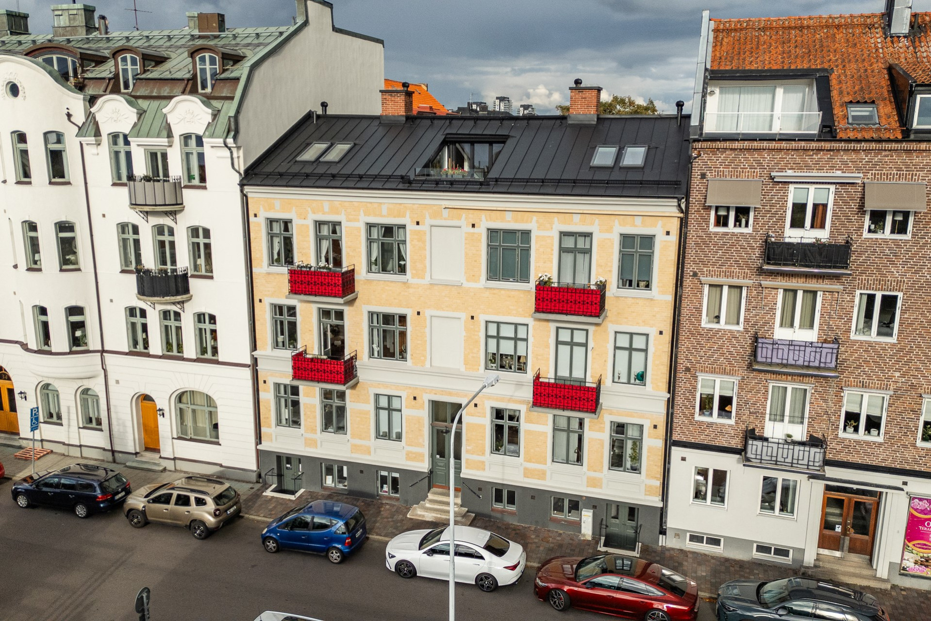 Generösa spröjsade fönster och pardörrar ut till balkongen gör att dessa rum får ett magiskt ljusinsläpp. Sekelskiftesdetaljer är många och vackra. Här finns det plats för en rejäl soffgrupp och matsalen inrymmer matbord för 8-10 personer. Genomgående fiskbensparkett som sträcker sig vidare in i matsalen. Snygg platsbyggd hylla.