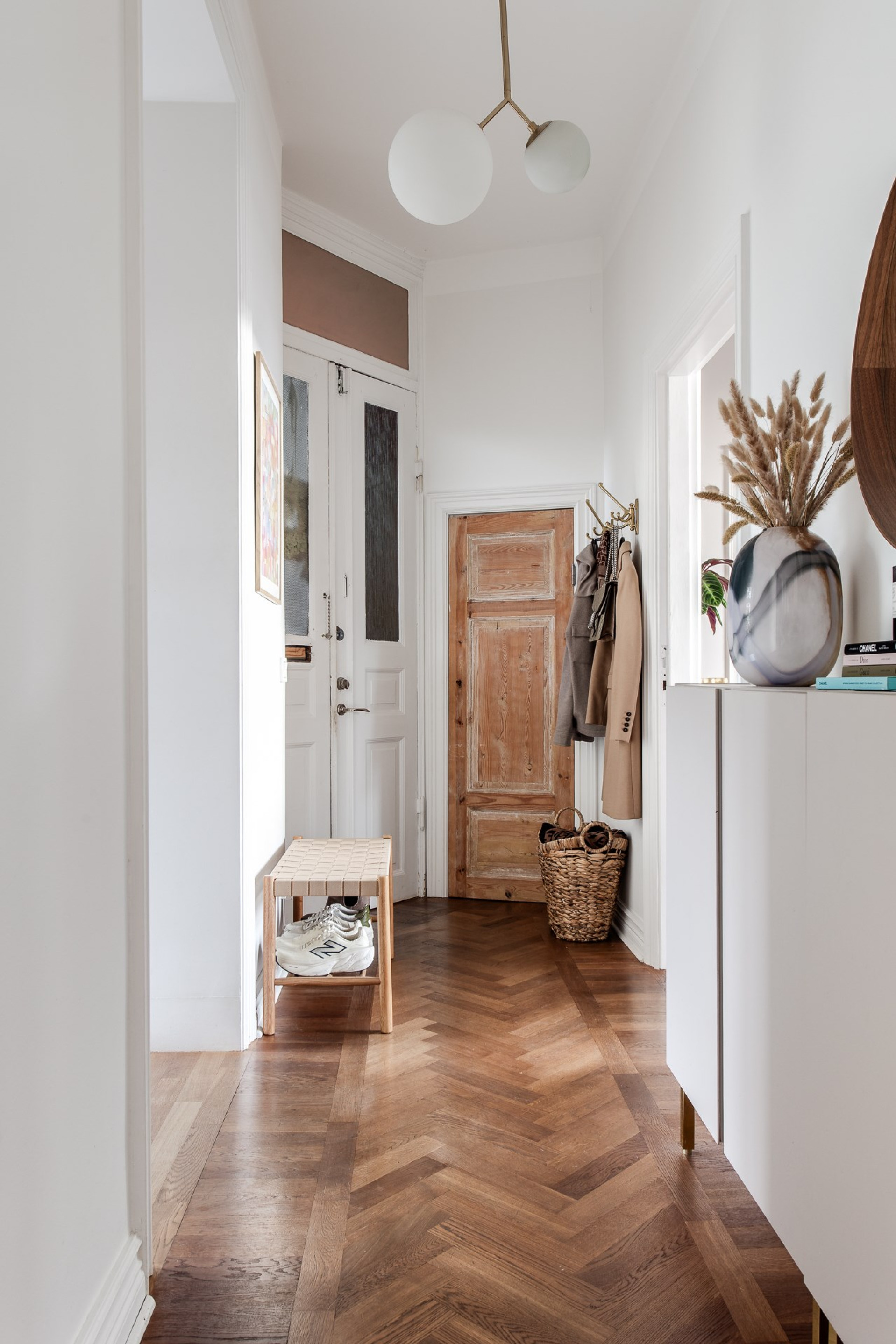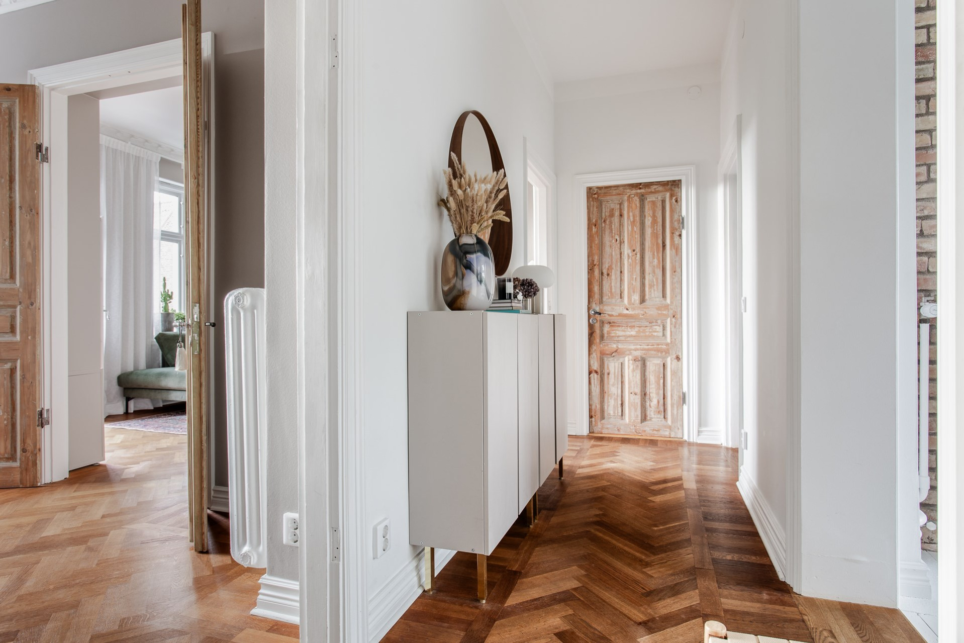 Avlång hall med dubbeldörrar. Avhängningsmöjligheter till vänster samt plats för mer förvaring om så önskas. Vacker fiskbensparkett.