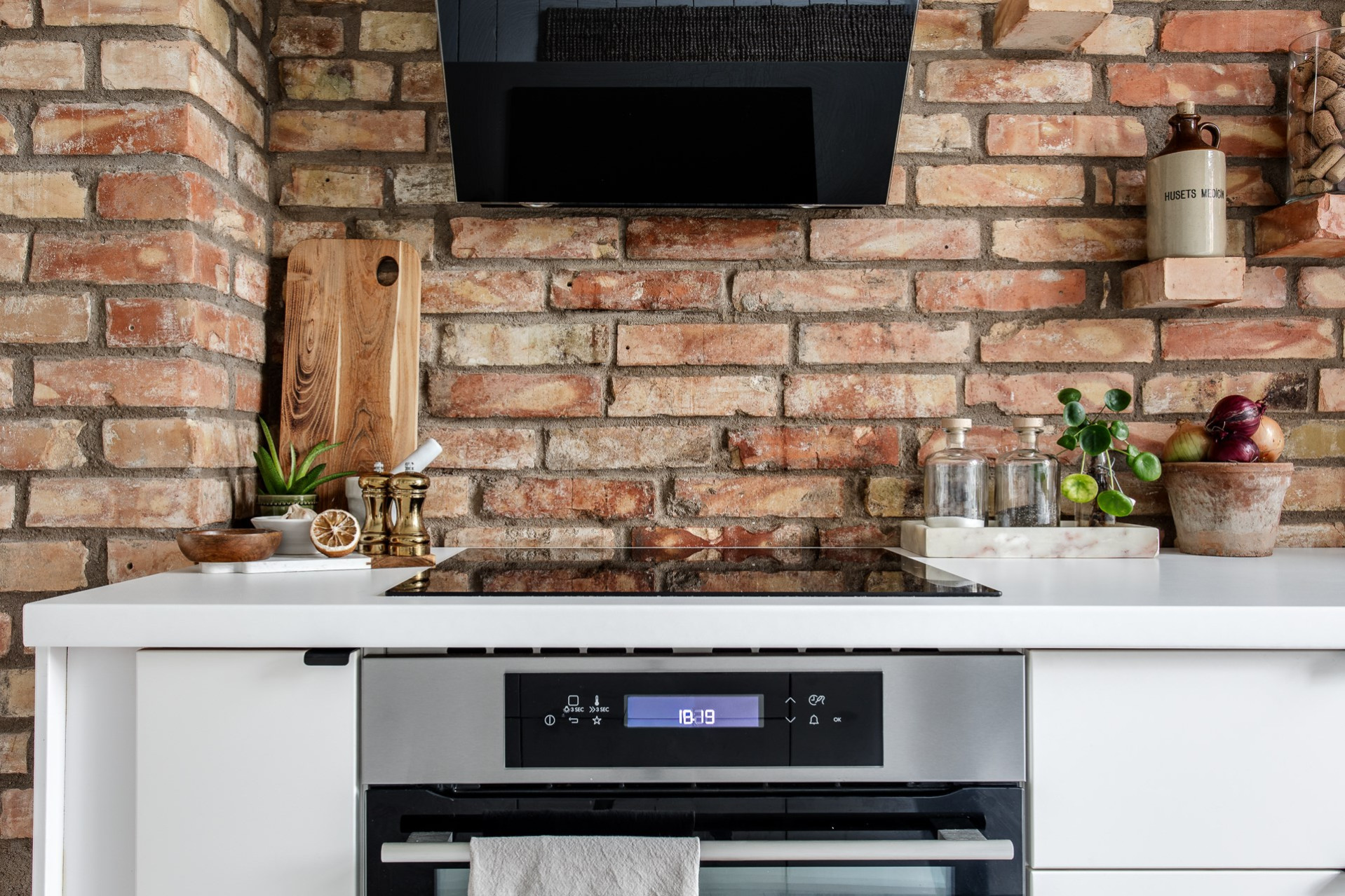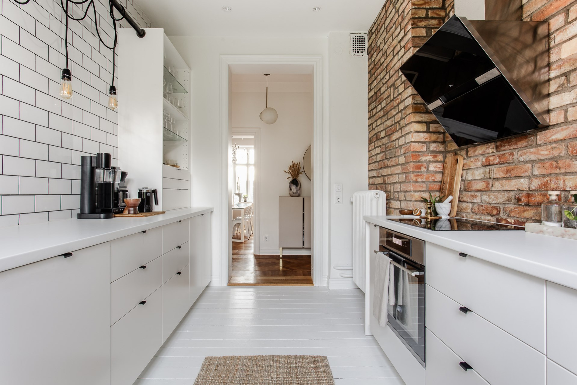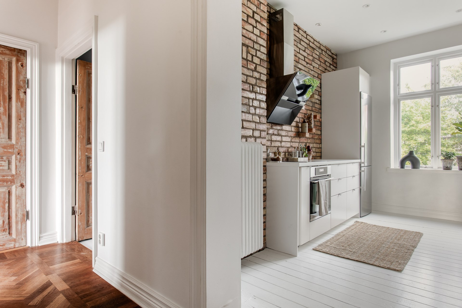Totalrenoverat och modernt kök med vacker tegelvägg. Gott om förvaring. Underskåp i vitt kombinerat med en vit bänkskiva. Induktionshäll och köksfläkt i härdat glas från Thermex. Kyl och frys i rostfritt stål, integrerad diskmaskin. Målat brädgolv.