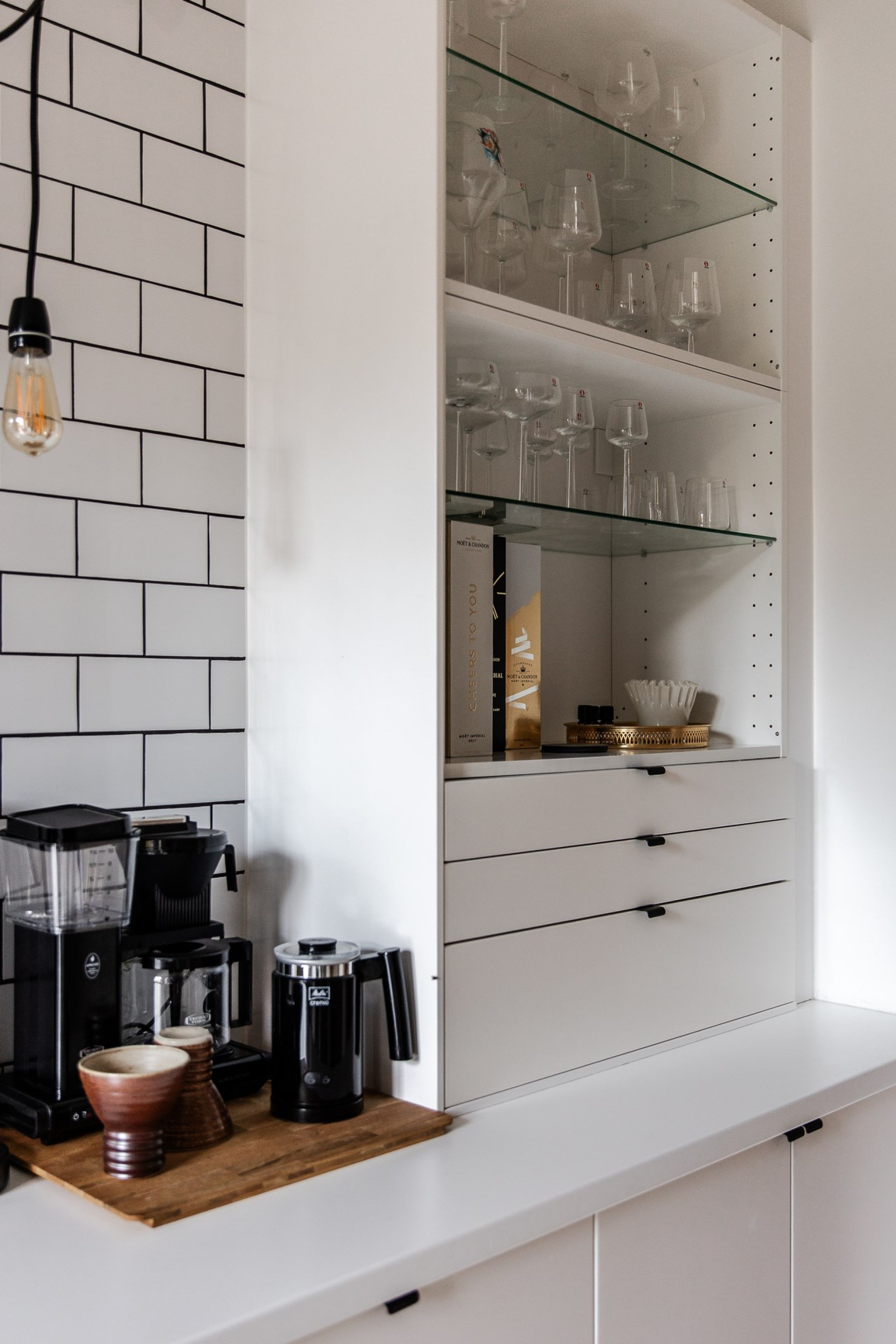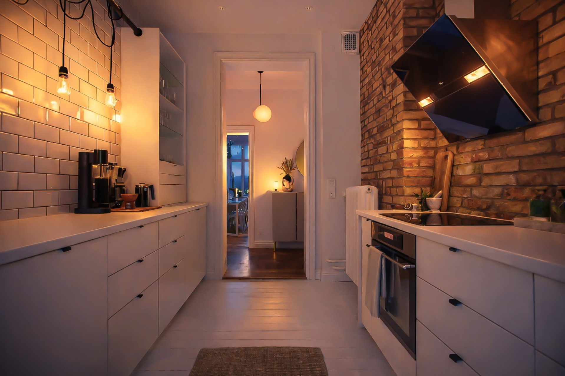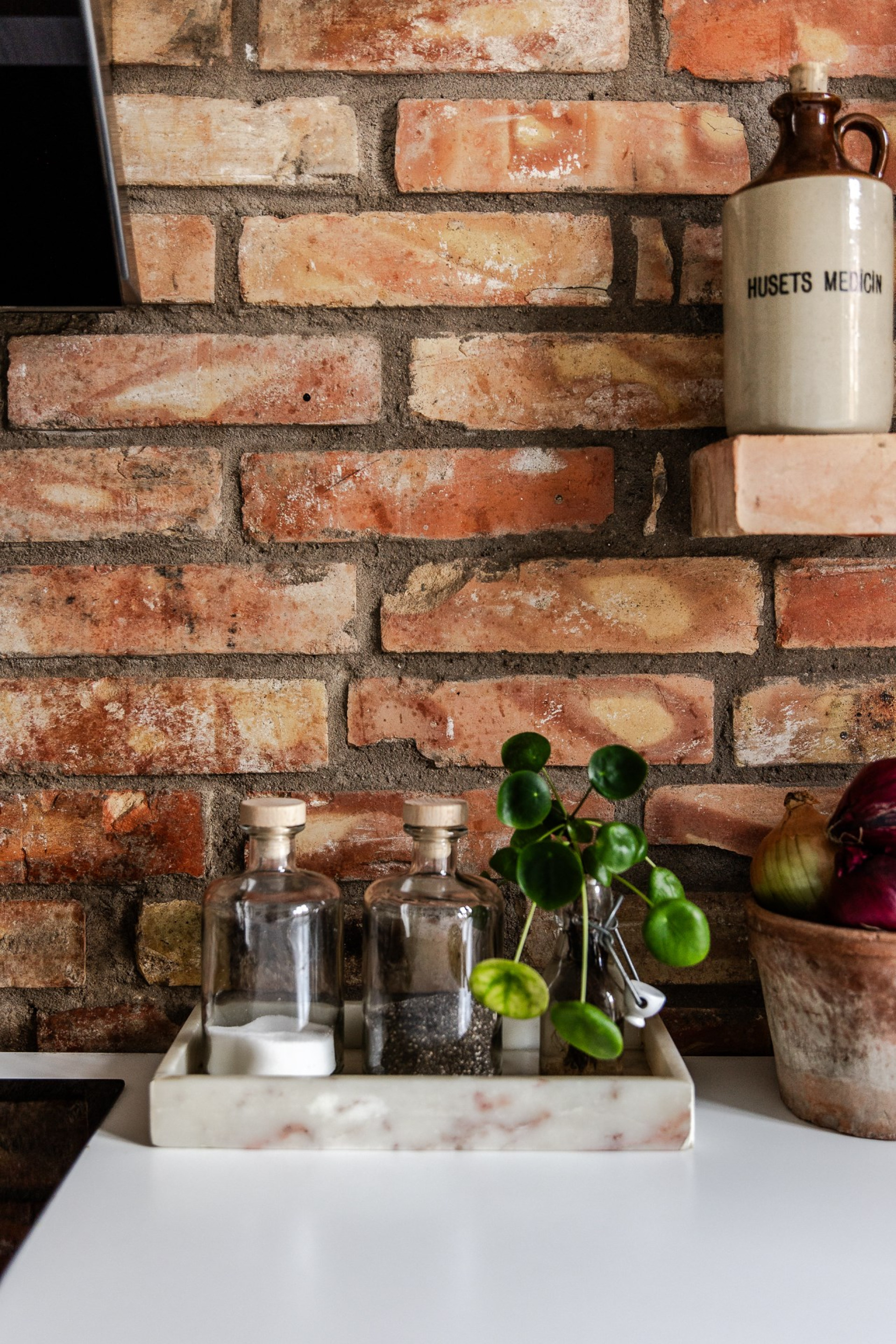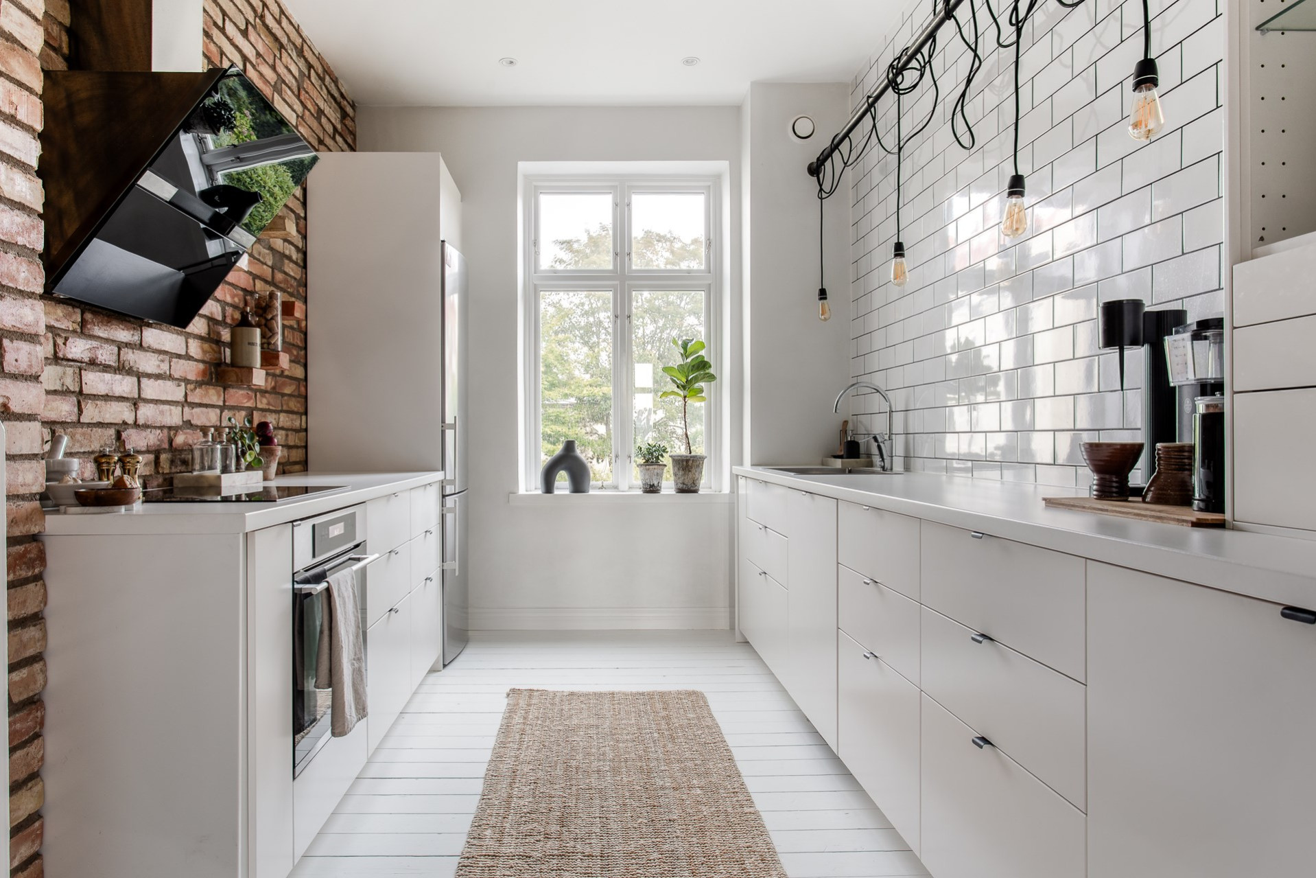 Totalrenoverat och modernt kök med vacker tegelvägg. Gott om förvaring. Underskåp i vitt kombinerat med en vit bänkskiva. Induktionshäll och köksfläkt i härdat glas från Thermex. Kyl och frys i rostfritt stål, integrerad diskmaskin. Målat brädgolv.