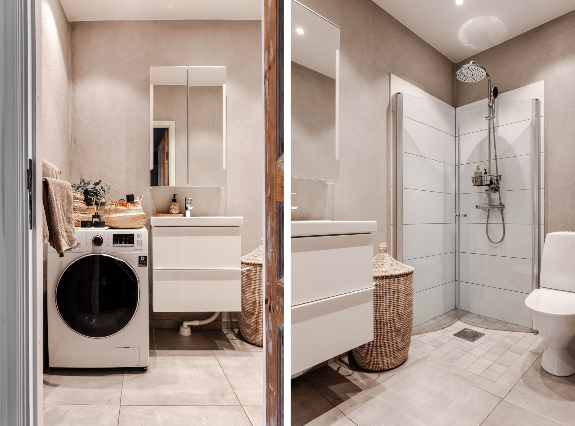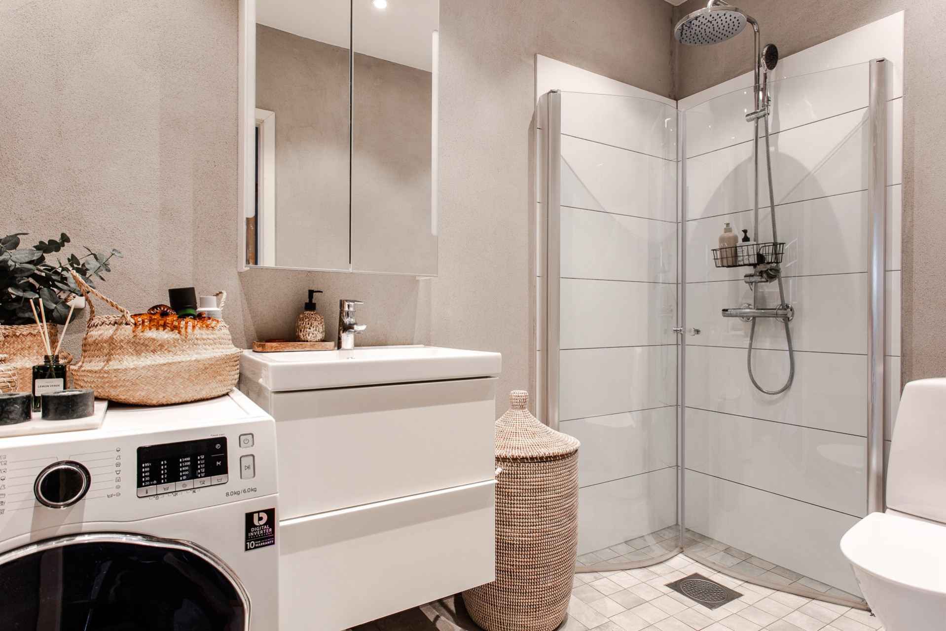 Modernt och fräscht badrum utrustat med tvättmaskin, takdusch, duschväggar i glas, toalett, vit kommod med spegelskåp.