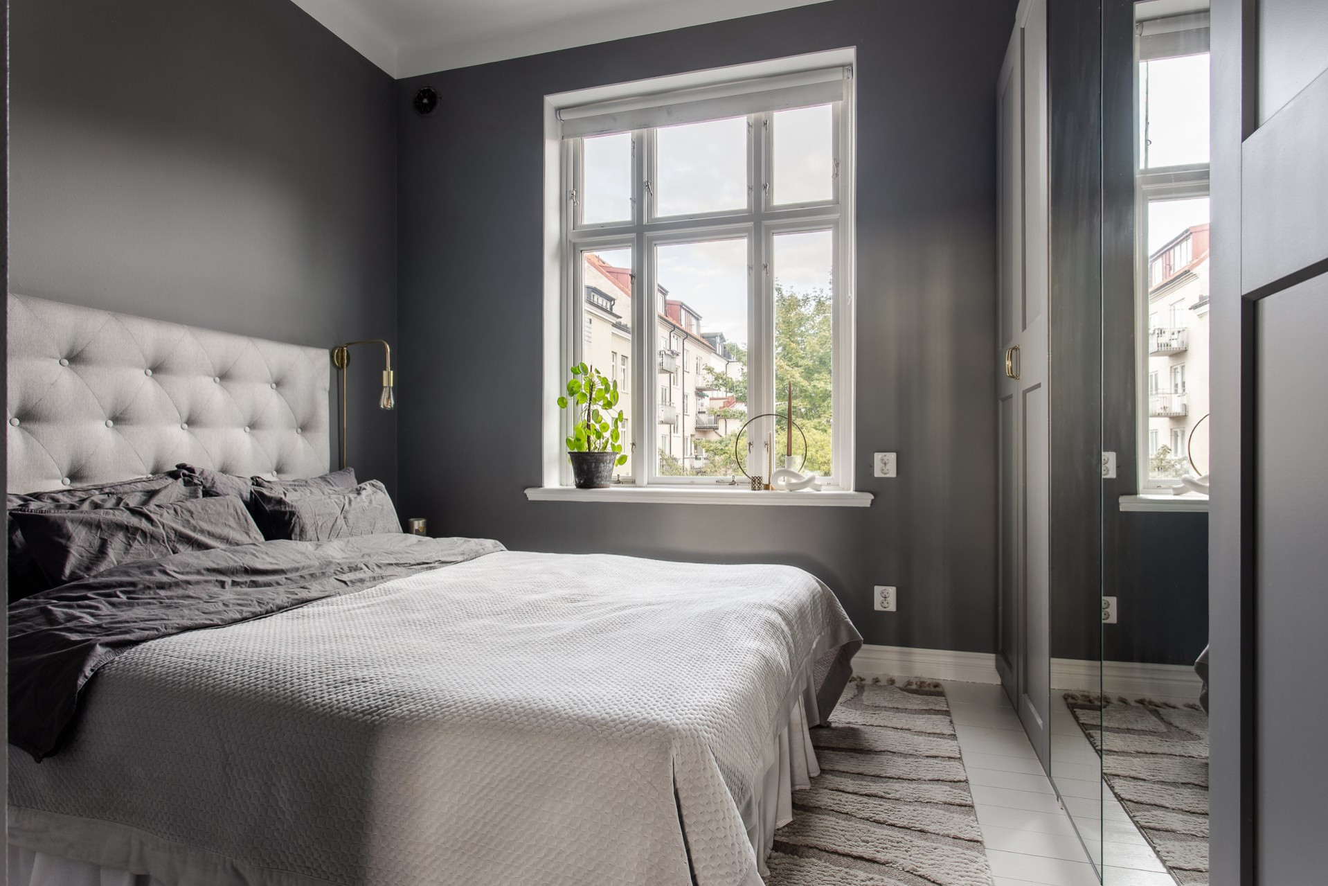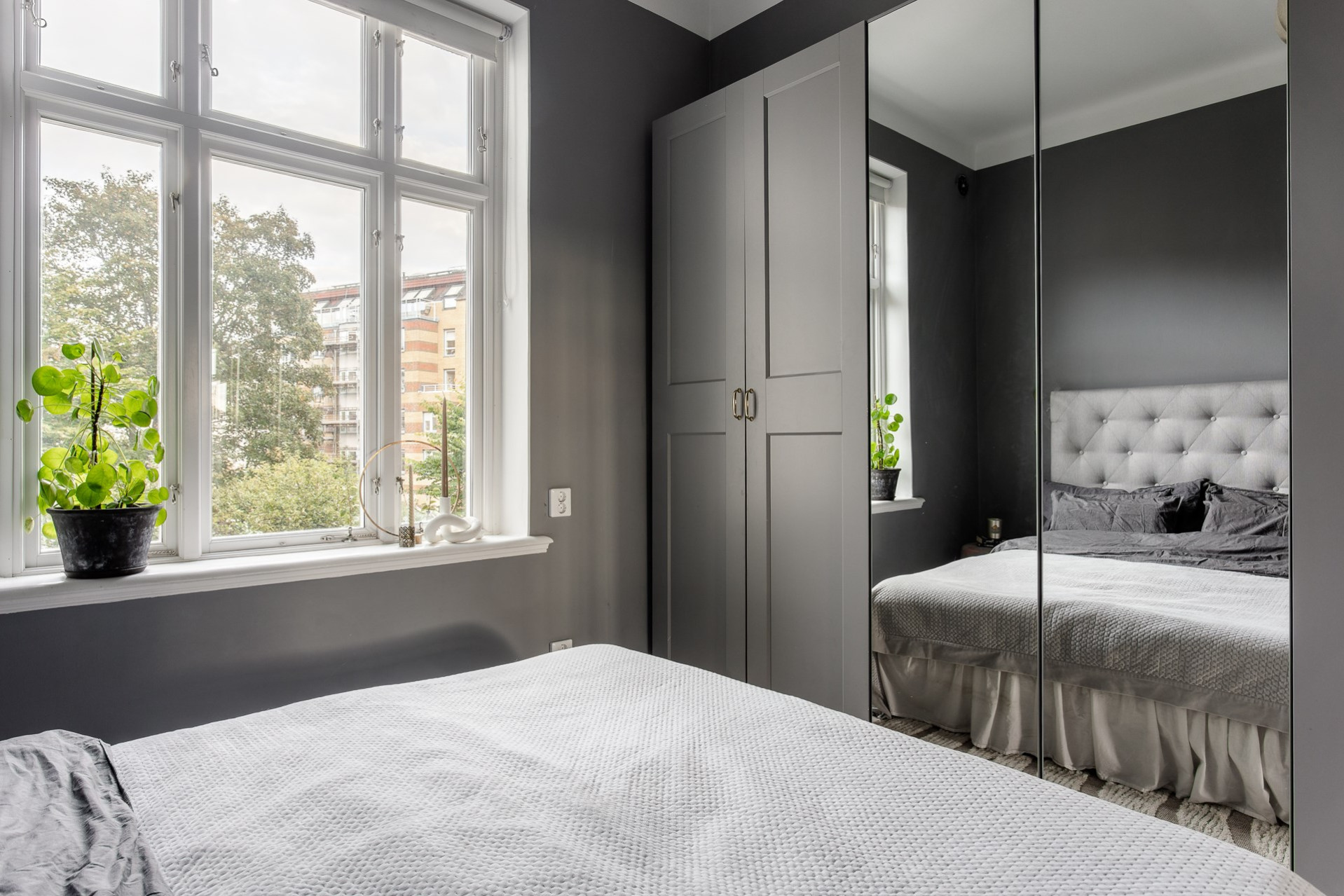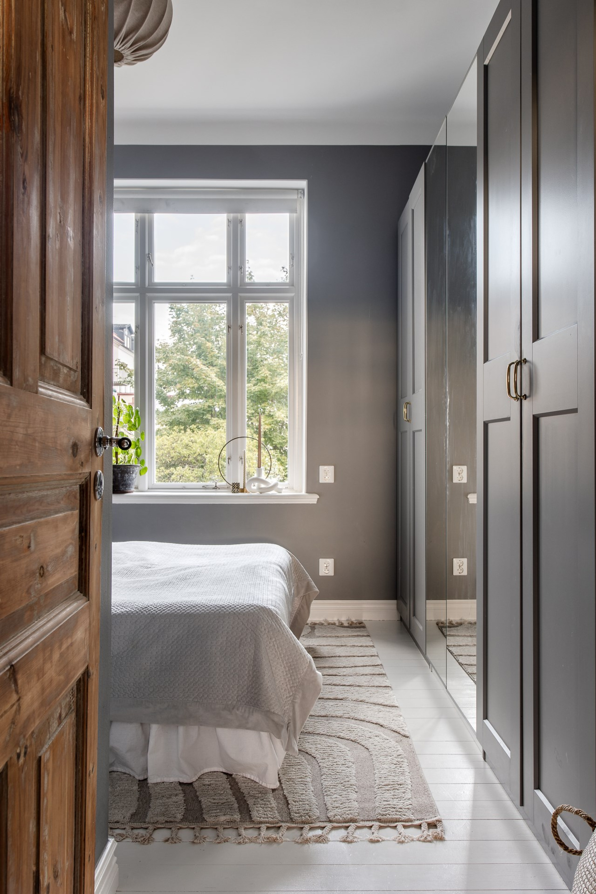 Mysigt sovrum med plats för dubbelsäng och god förvaring via en hel vägg fylld av garderober. Målat brädgolv.