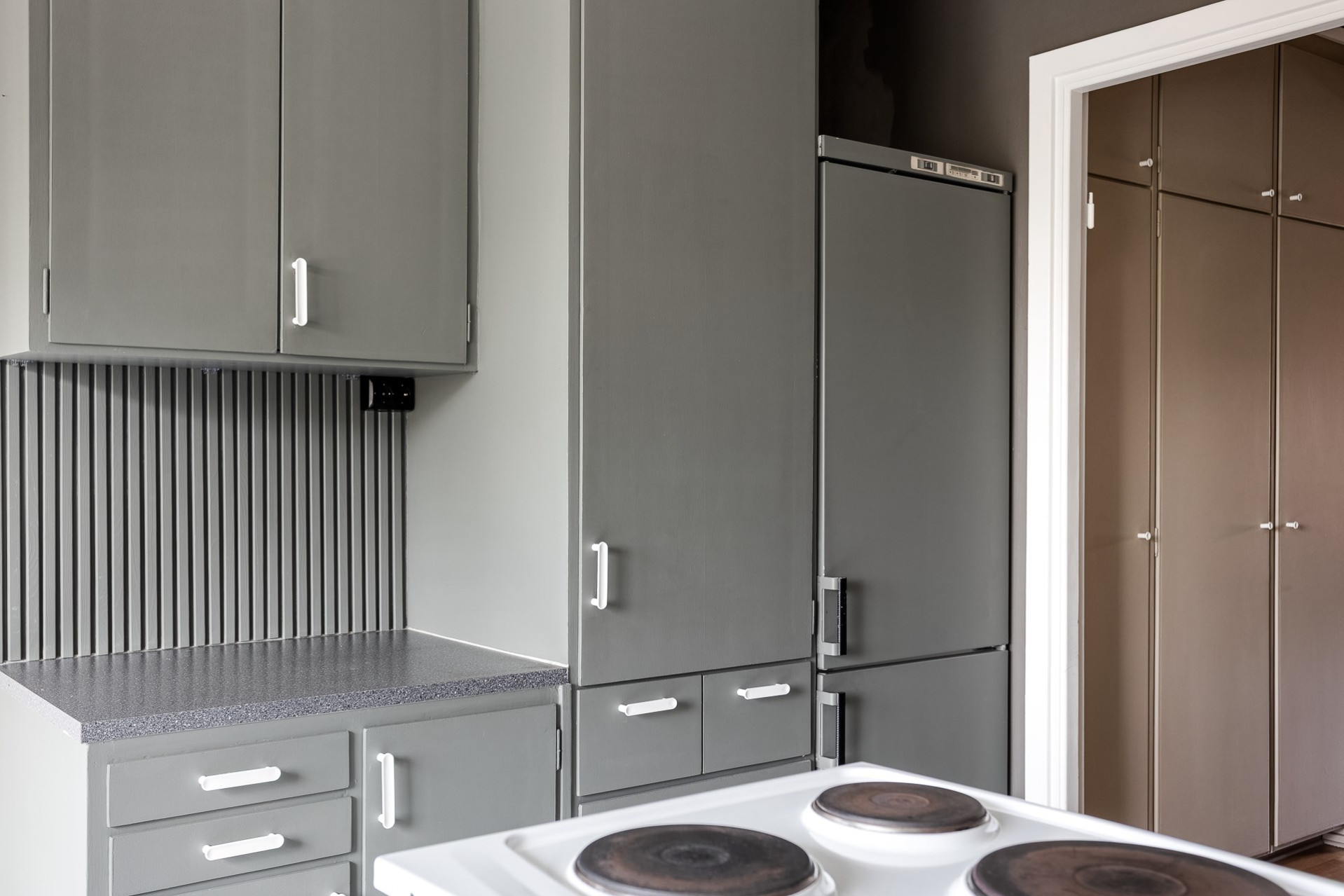 Köket är äldre men har över åren hållits fräscha genom målning. Linoleummatta på golv, väggarna är målade. Ytan ger goda möjligheter till alternativ planlösning och ett modernt kök. Här finns ett generöst ljusinsläpp och en möblerbar balkong i soligt västerläge. Vanligt bland treorna är att öppna upp en del av vägg mellan kök och vardagsrum för att få en öppnare planlösning. För detta krävs föreningens godkännande.